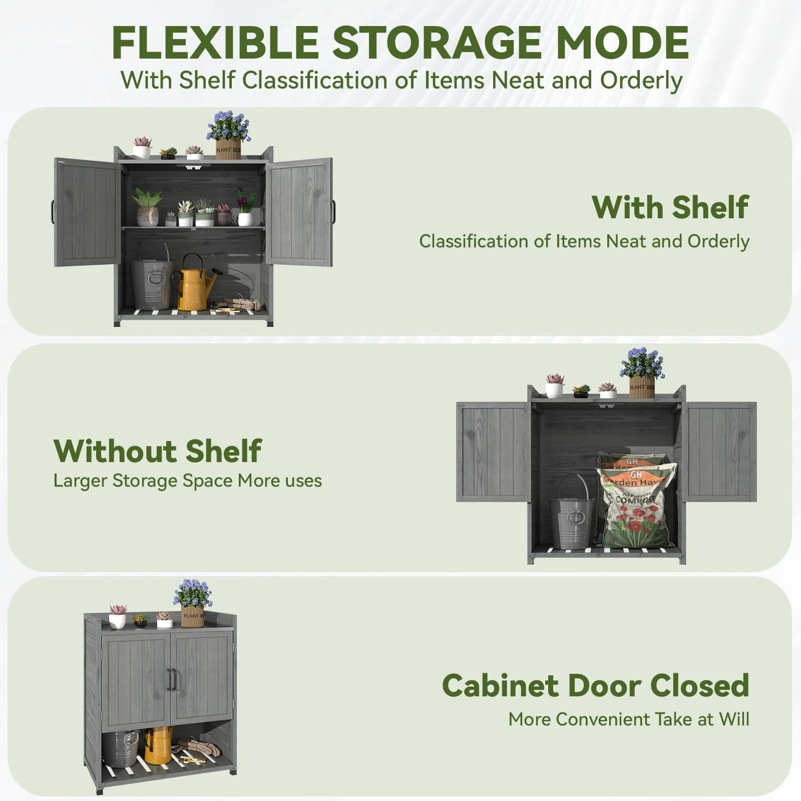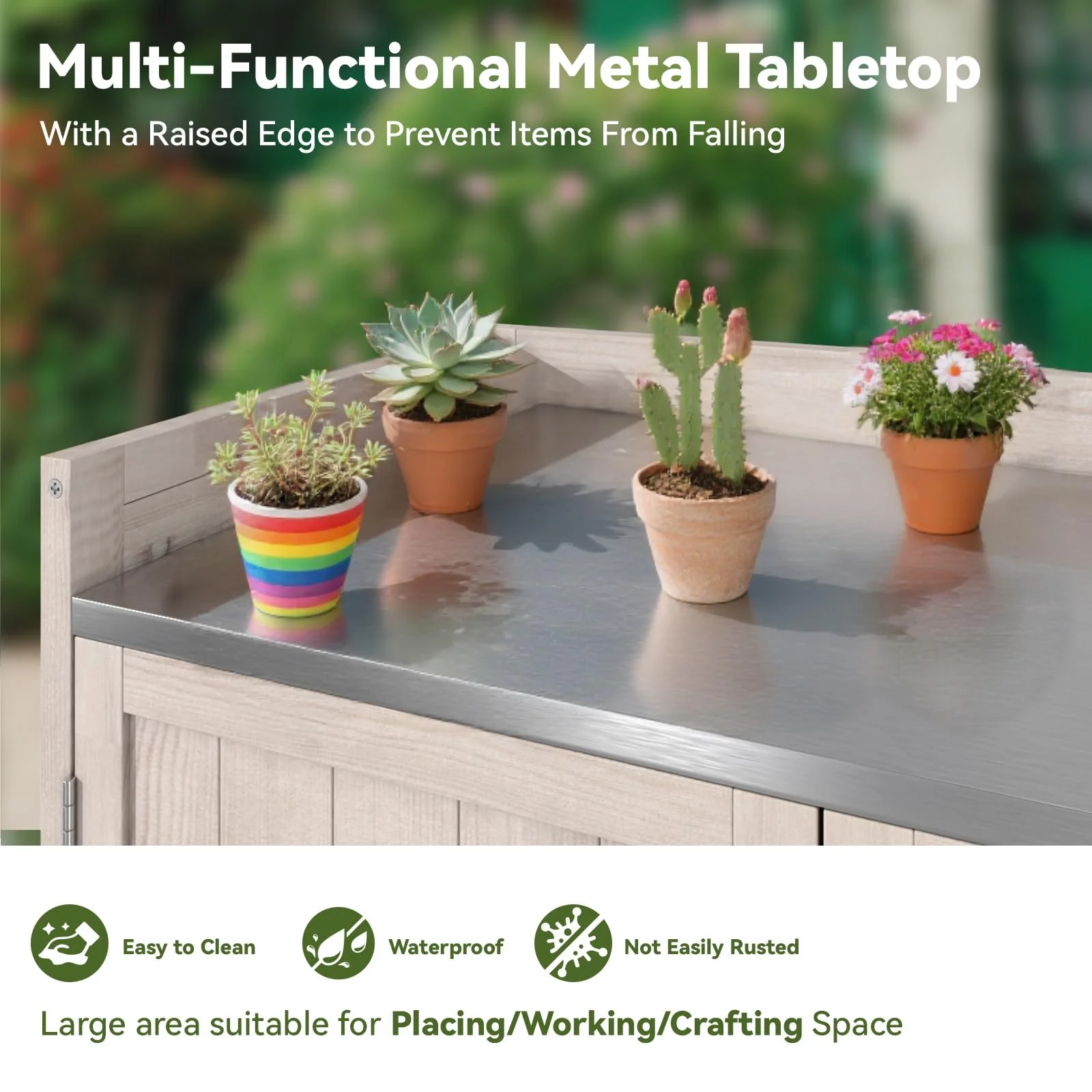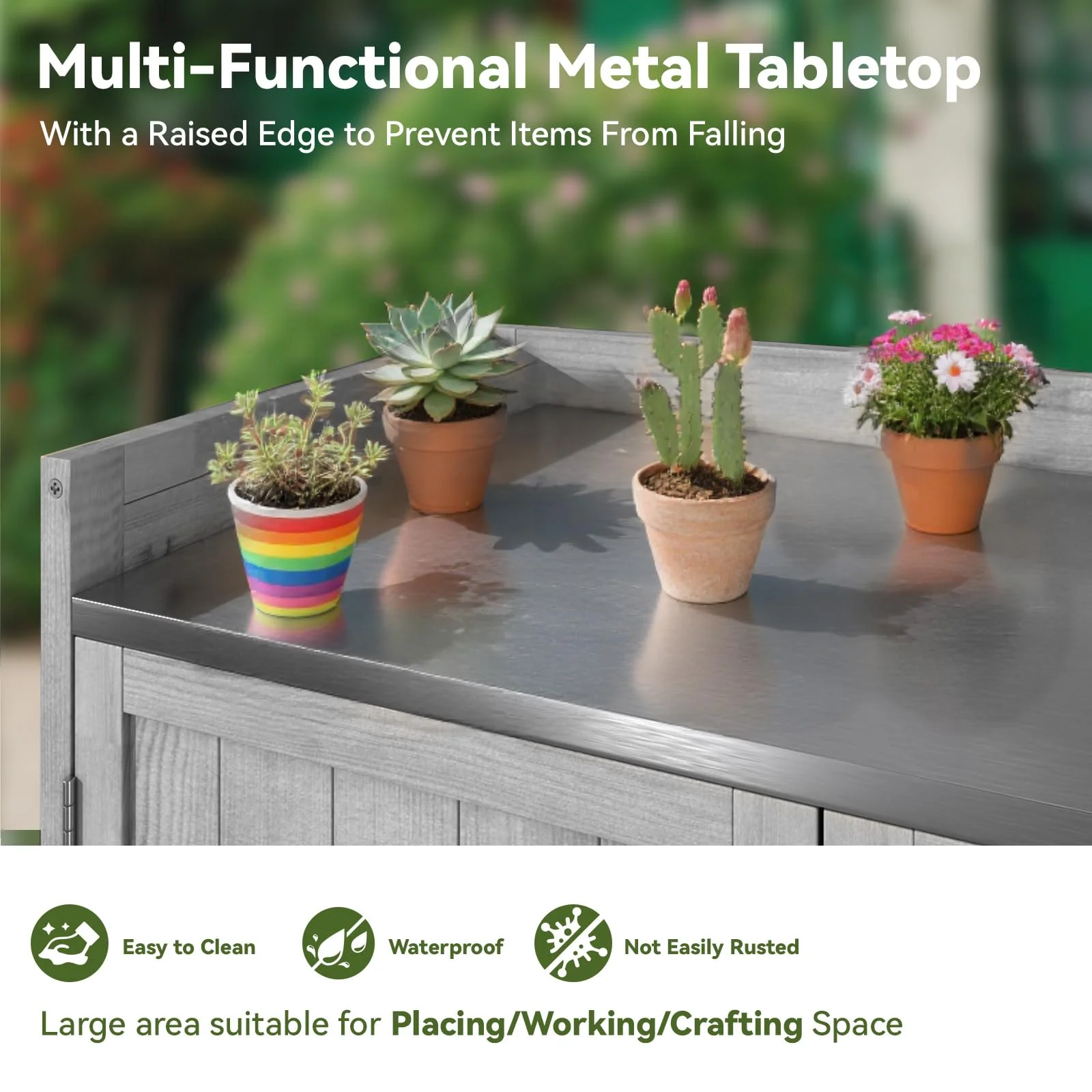 - ��Spacious & Customizable Storage��With ample storage space, this workstation allows you to rearrange internal dividers to fit your specific needs. Whether you're storing gardening tools, patio essentials, or decor items, the flexible layout ensures everything has its place. Effortlessly organize and access your belongings with ease.