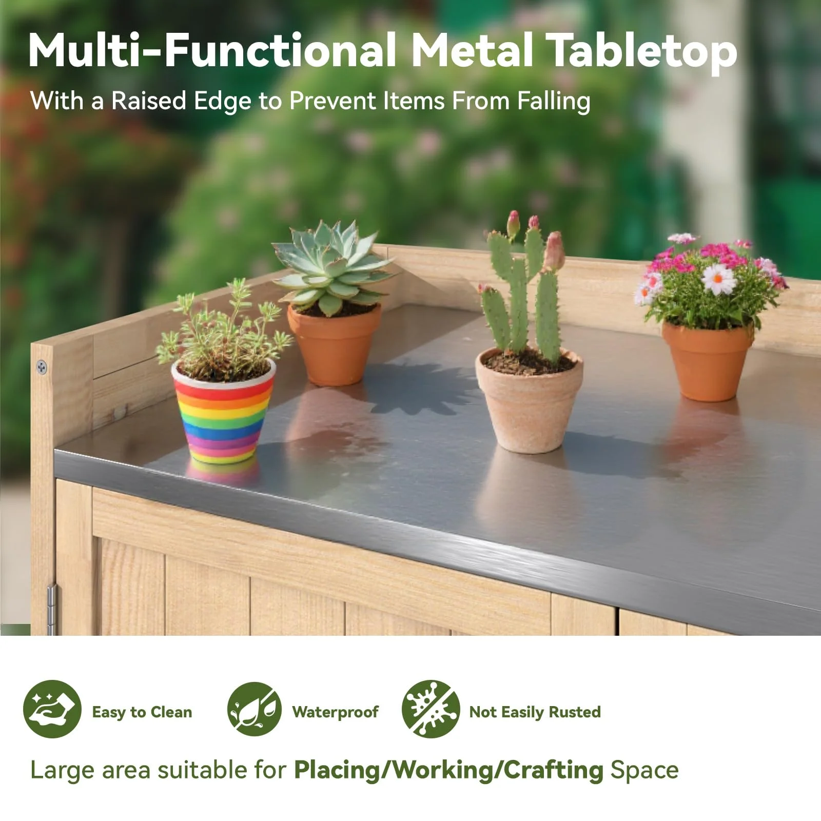 - ?��Durable & Functional Design��Featuring a metal-plated surface, the workstation resists accidental scratches and repels water and stains. The raised side rails prevent items from slipping off, ensuring safety and organization. This combination of practicality and sleek aesthetics makes it a standout addition to any backyard.