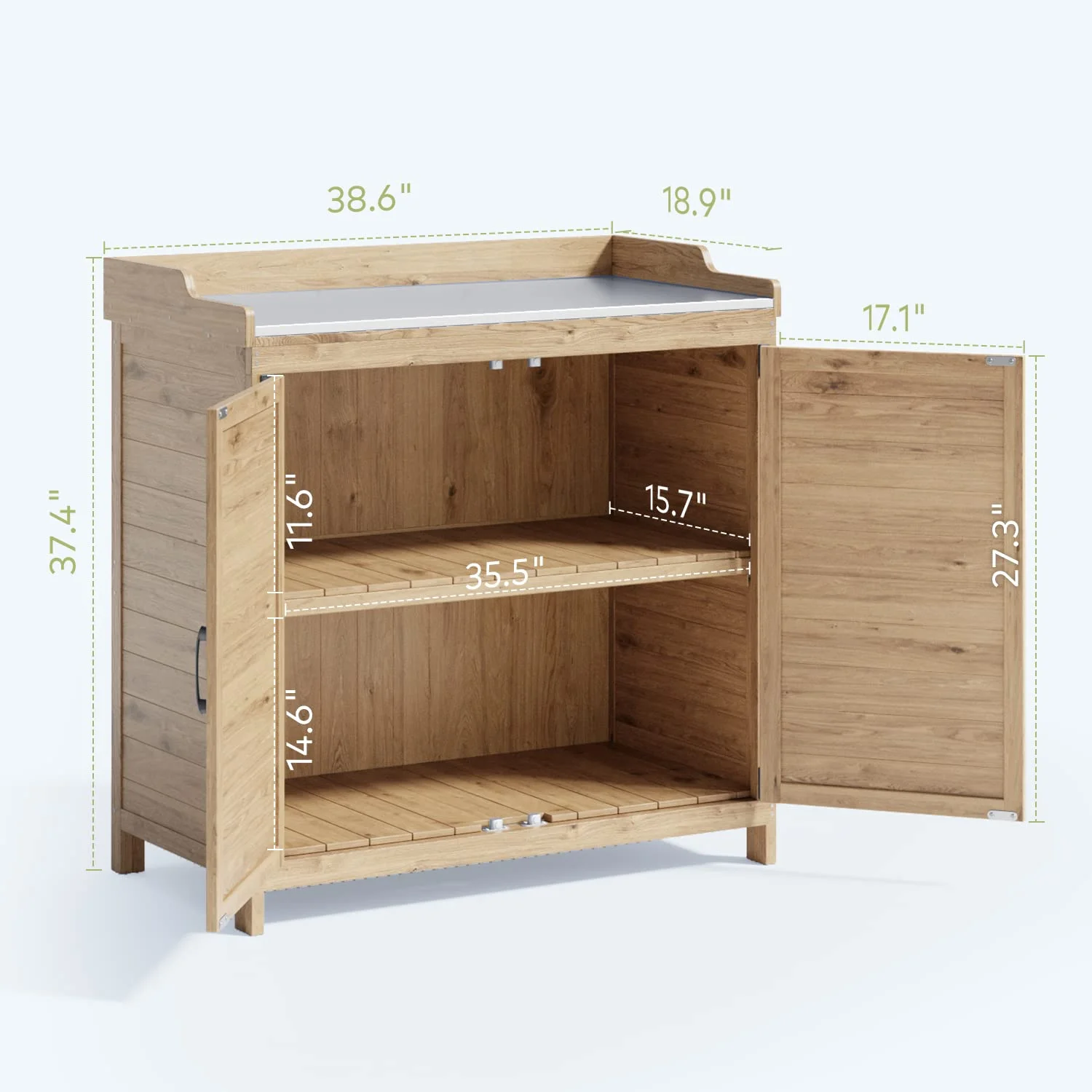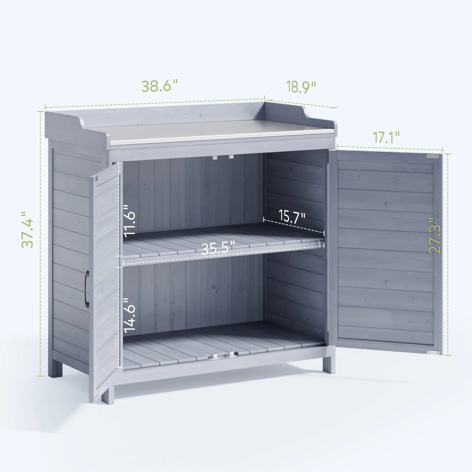 - ???Metal Tabletop:Our potting bench with storage offers a spacious 37.4��L x 18.5��W work area. The metal surface is easy to clean, convenient for watering and its durability makes this outdoor storage cabinet reliable for use in all climates.