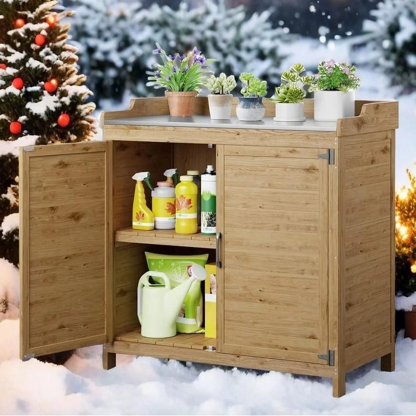 The potting bench table is made of fir wood and features a large galvanized tabletop, providing a sturdy and stable structure. With dimensions of 38.6"W x 18.9"D x 37.4"H, this outdoor potting bench table is equipped with a big cabinet offering ample storage space. The removable Shelves make it convenient for storing long-handled gardening tools, small lawn care equipment, sprayers, shovels, flower pots, and more.