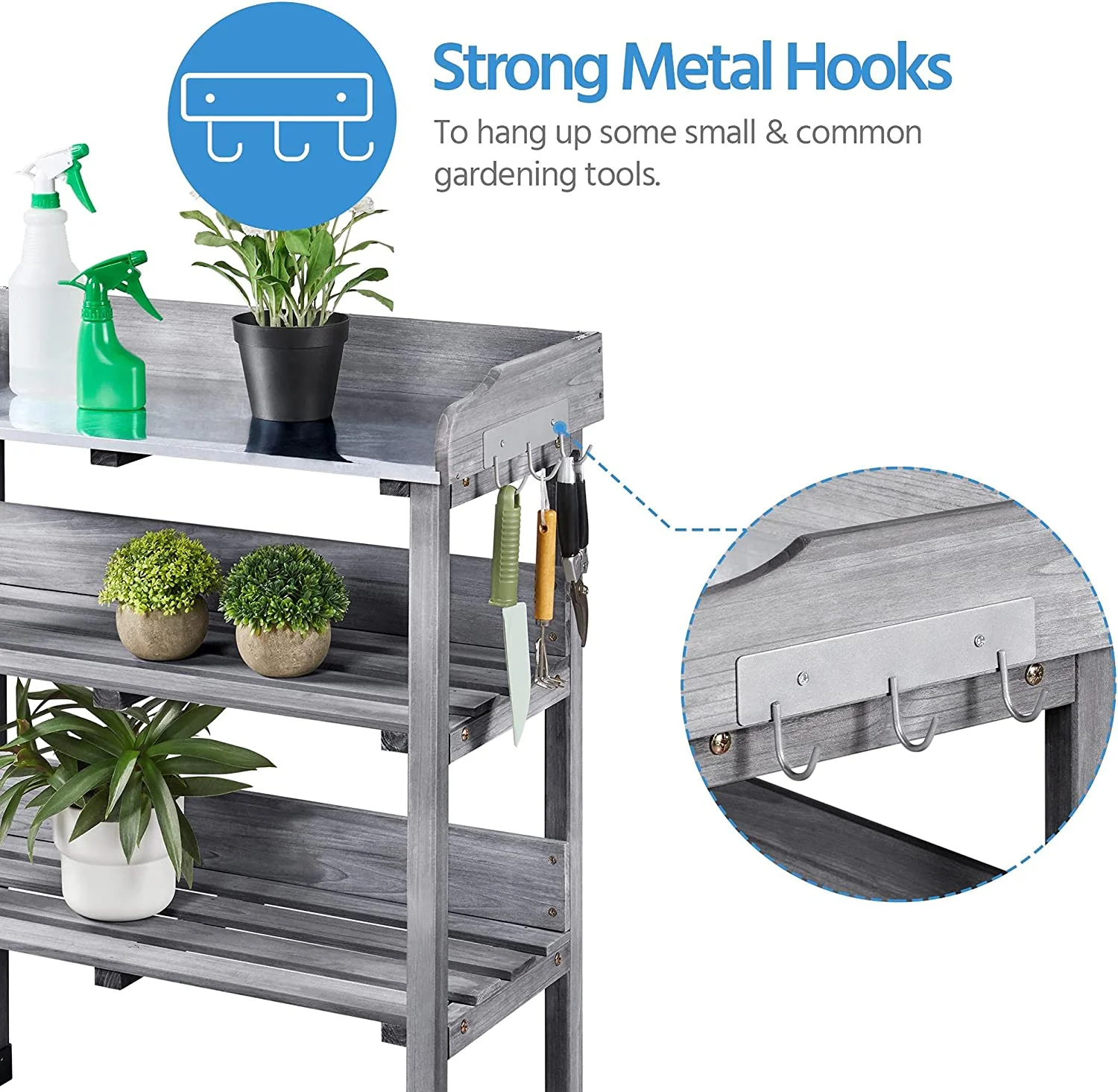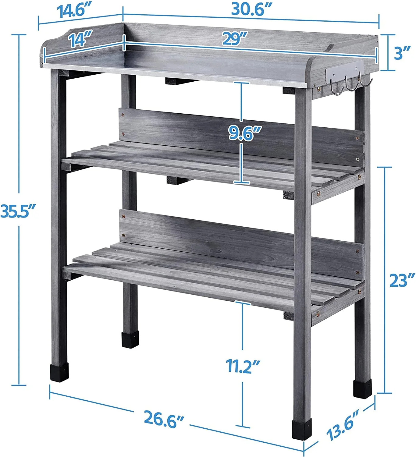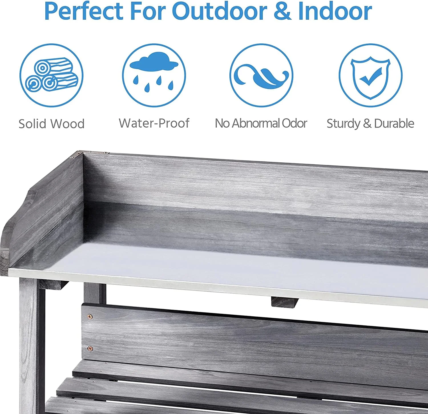 - Practial Potting Bench For Horticulture��This outdoor potting bench features two wide-open shelves to accommodate all your gardening tools, extra soil, and other equipment. The sturdy metal surface is water-resistance and smooth to clean.