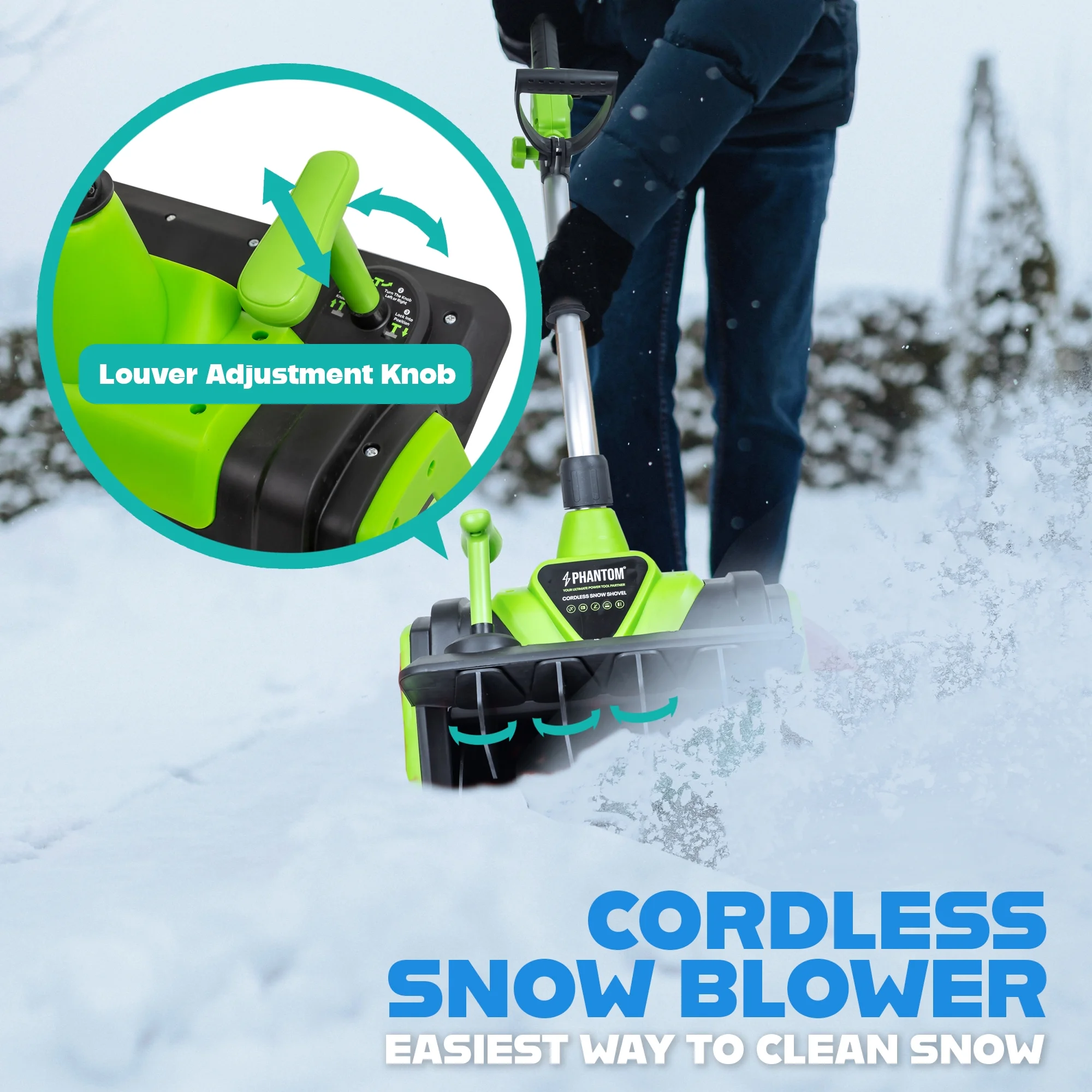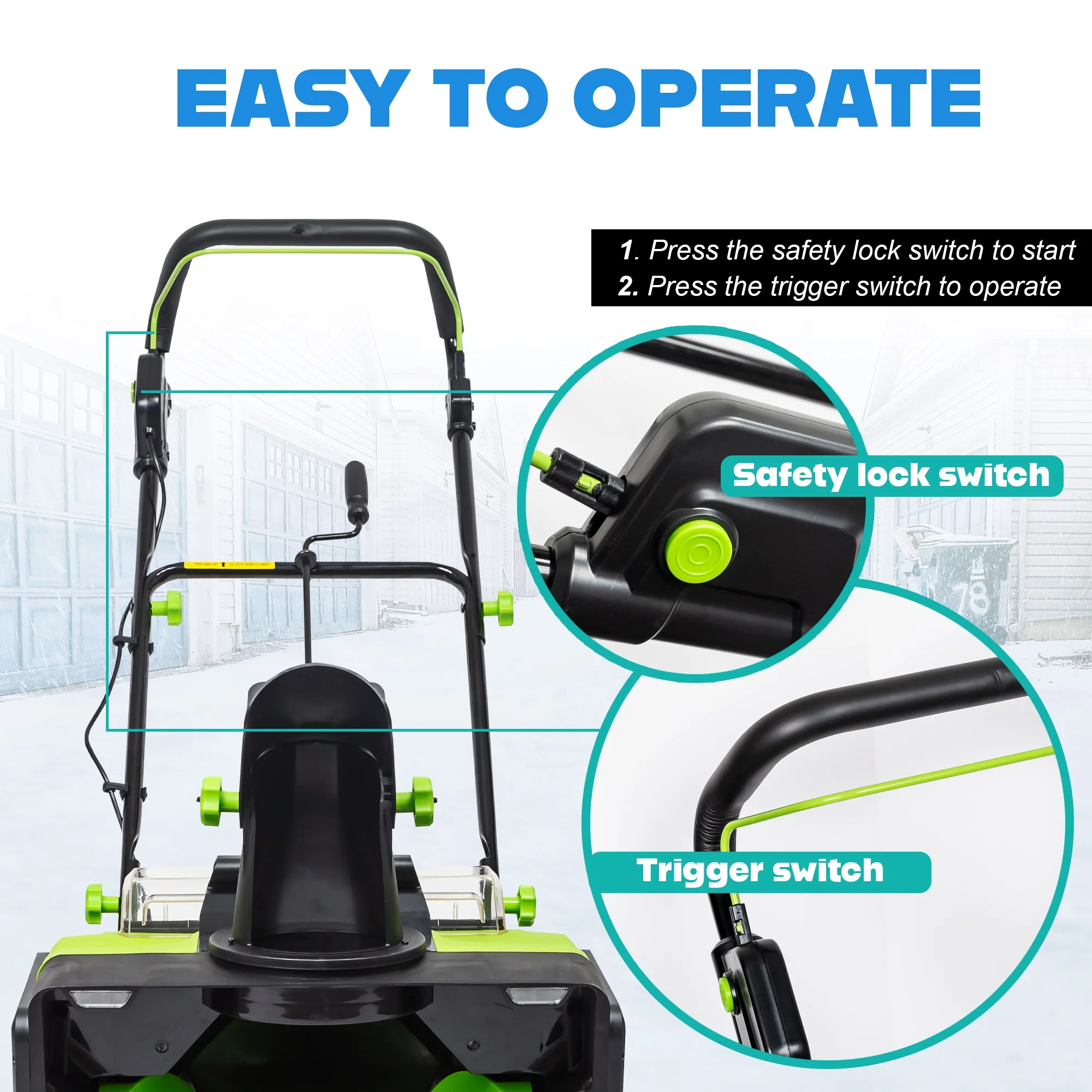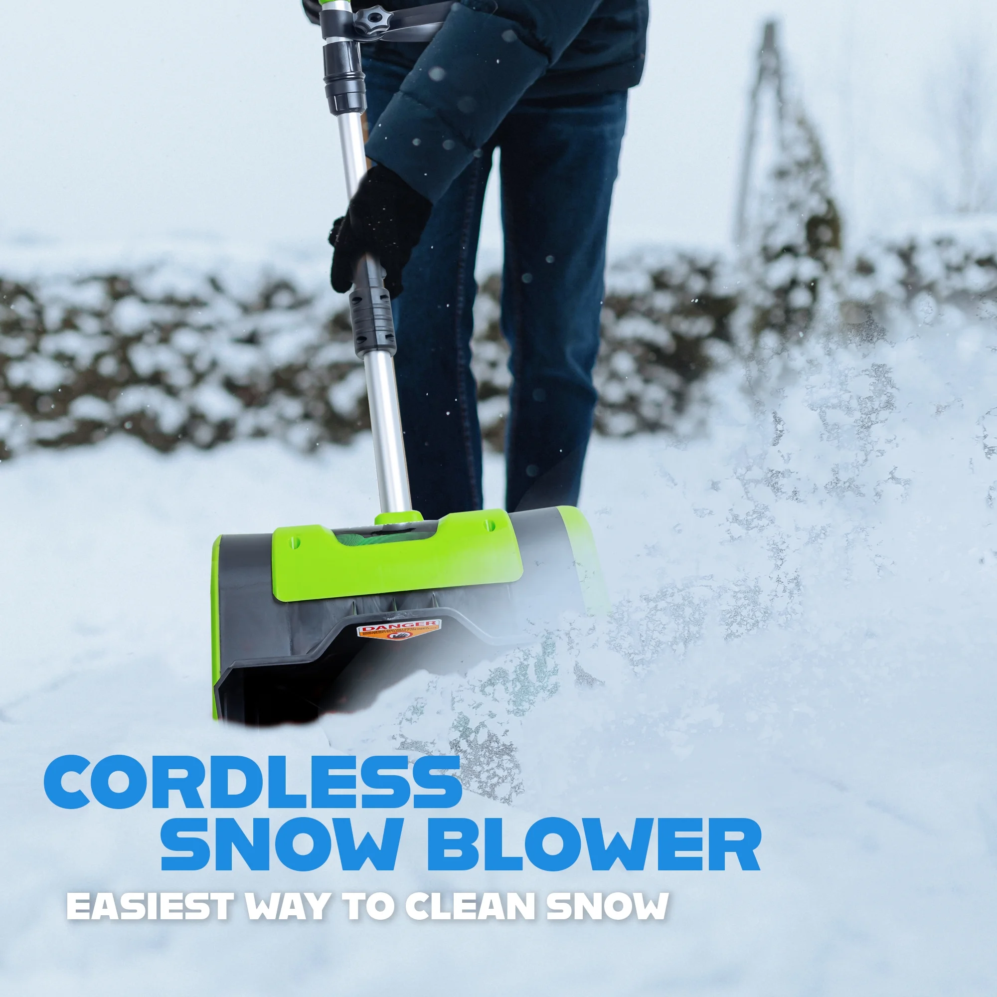 - Ergonomic Adjustable Handle: Designed with user comfort in mind, the ergonomic handle adjusts to suit your usage habits. Paired with dual safety switches and anti-slip grips, this cordless snow thrower ensures safe, comfortable, and efficient snow removal.