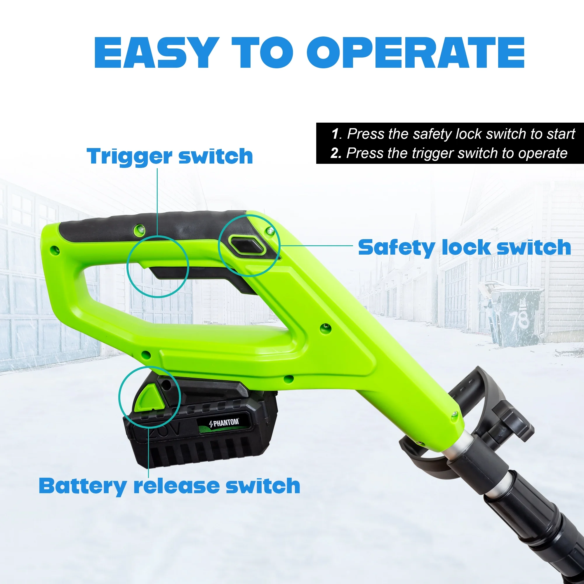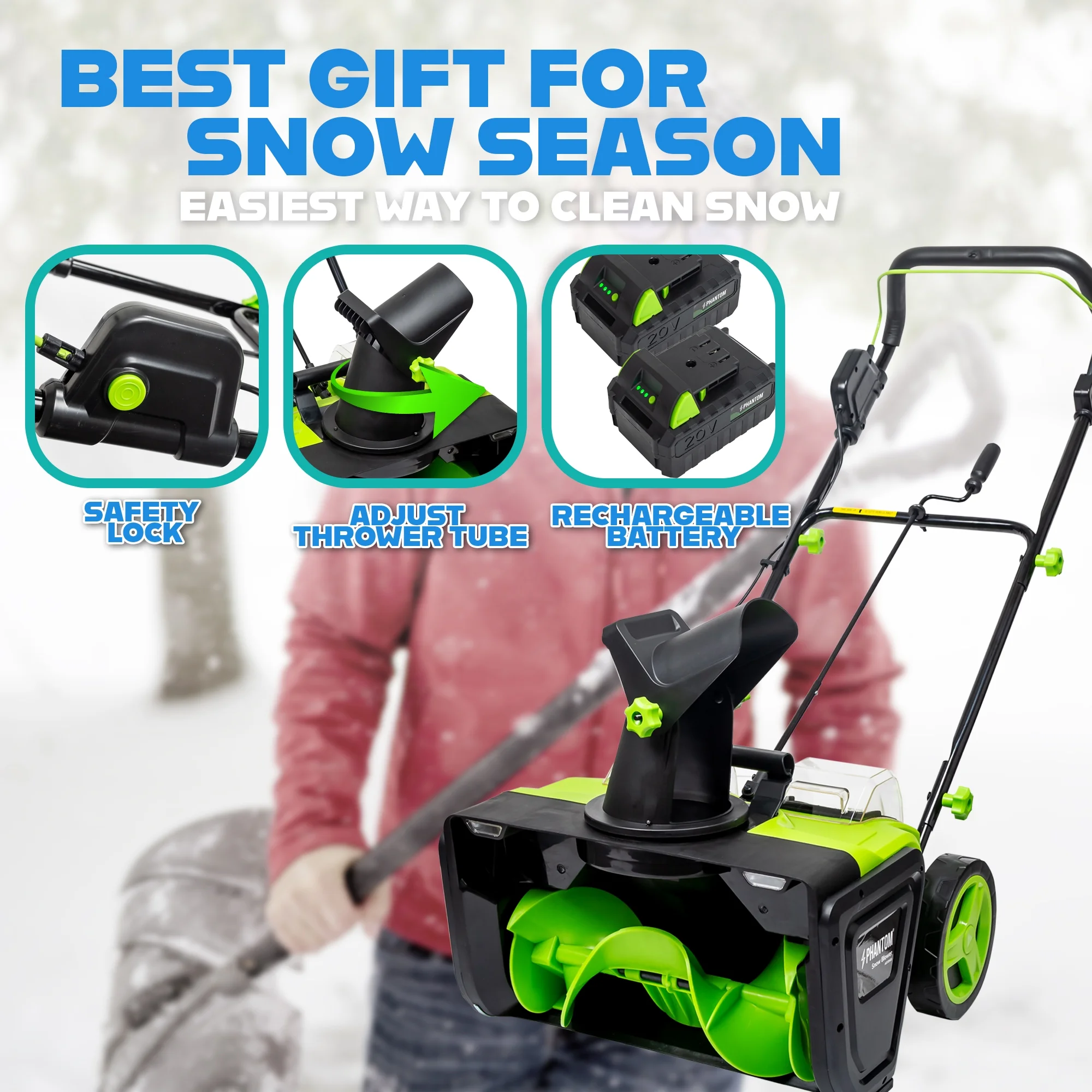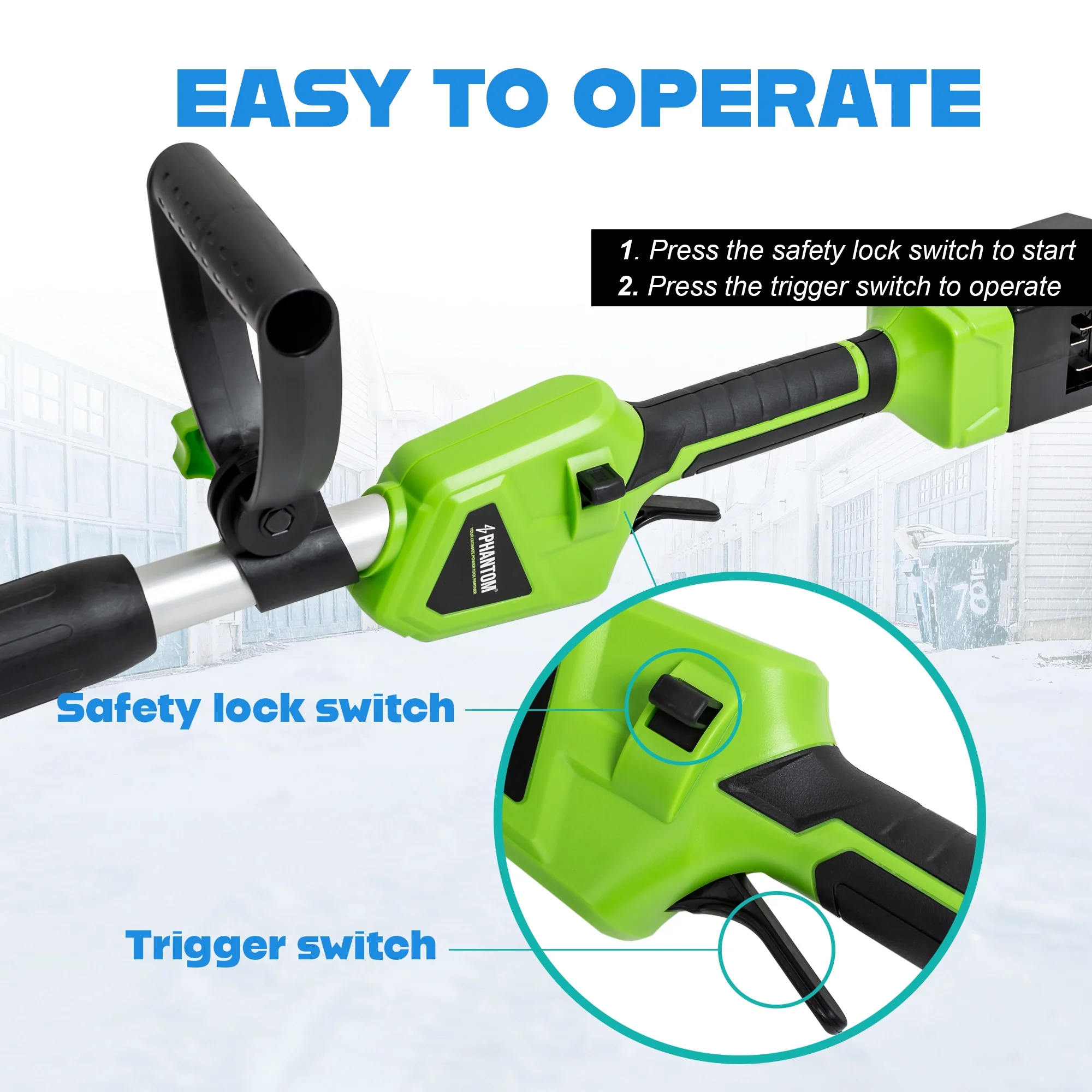 - Ergonomic Adjustable Handle: Designed with user comfort in mind, the ergonomic handle adjusts to suit your usage habits. Paired with dual safety switches and anti-slip grips, this cordless snow thrower ensures safe, comfortable, and efficient snow removal.