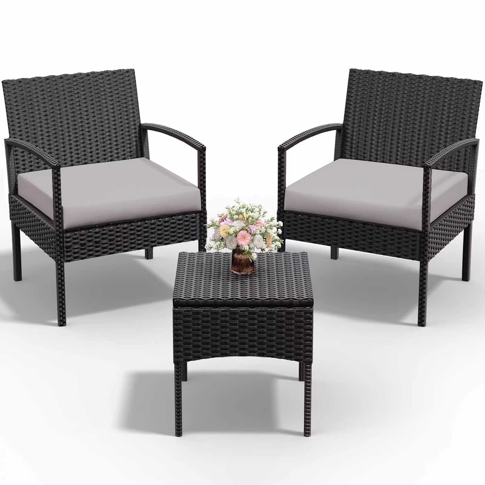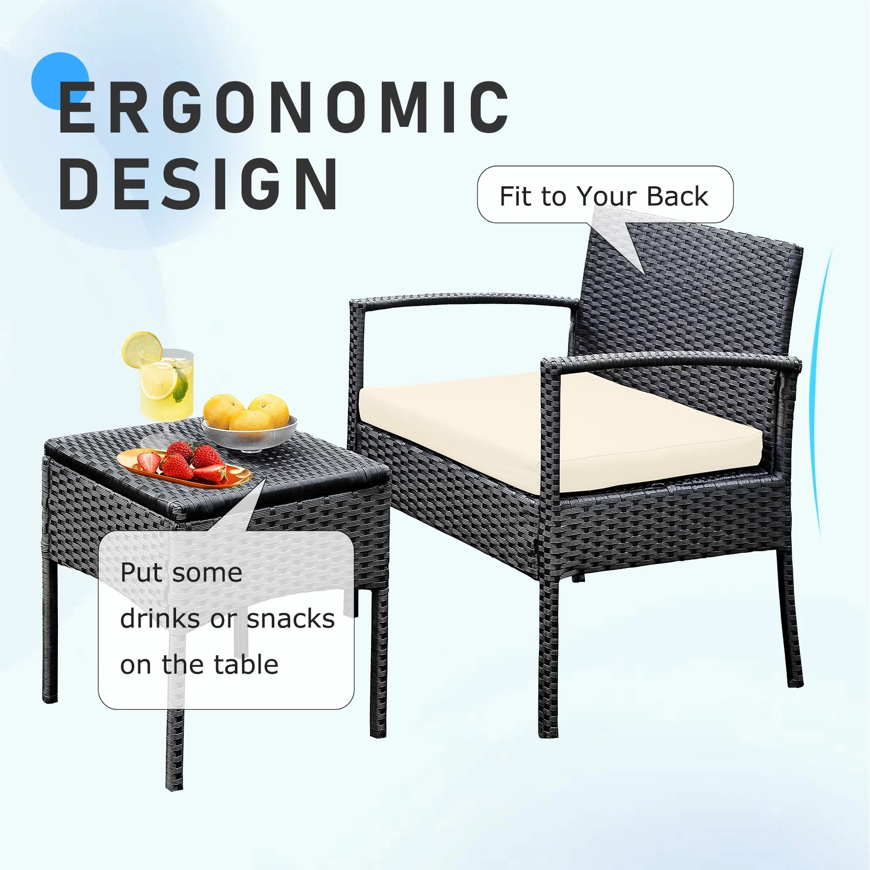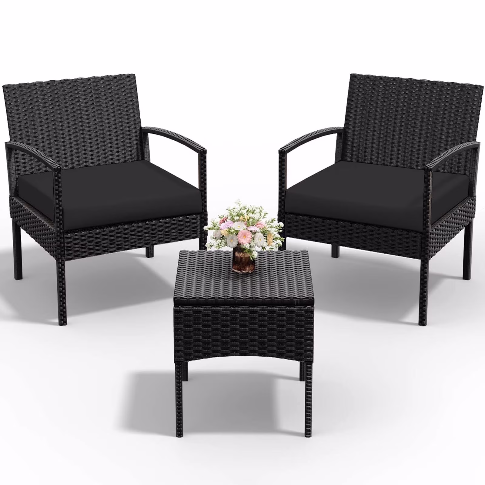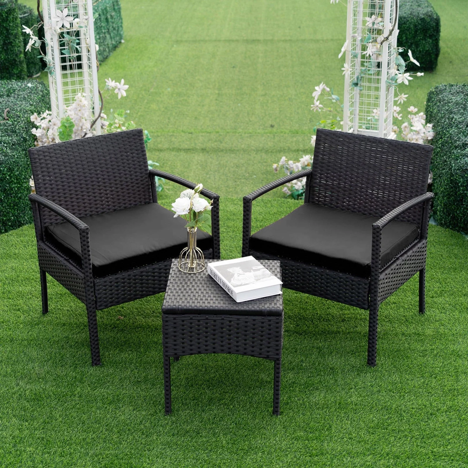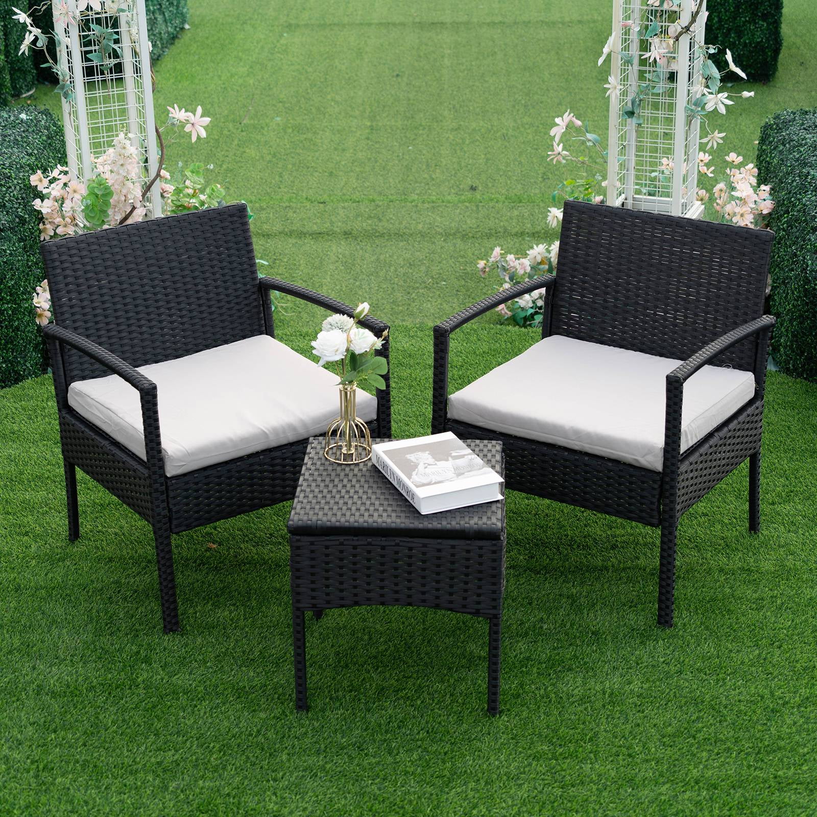 - [Ergonomic Patio Chairs Set] This outdoor furniture set comes with two rattan chairs and a coffee table. The curves of armrests on the both sides are soft and provide sufficient support, fits your arm lines. And the seat back with slight radian embraces your body to allow a better comfort of outdoor living.