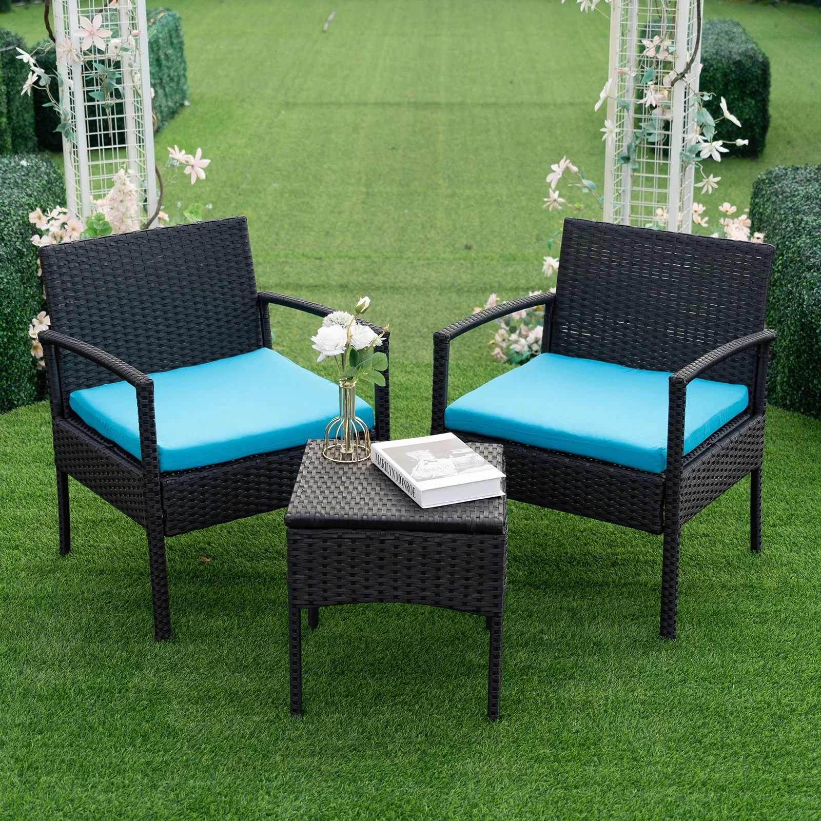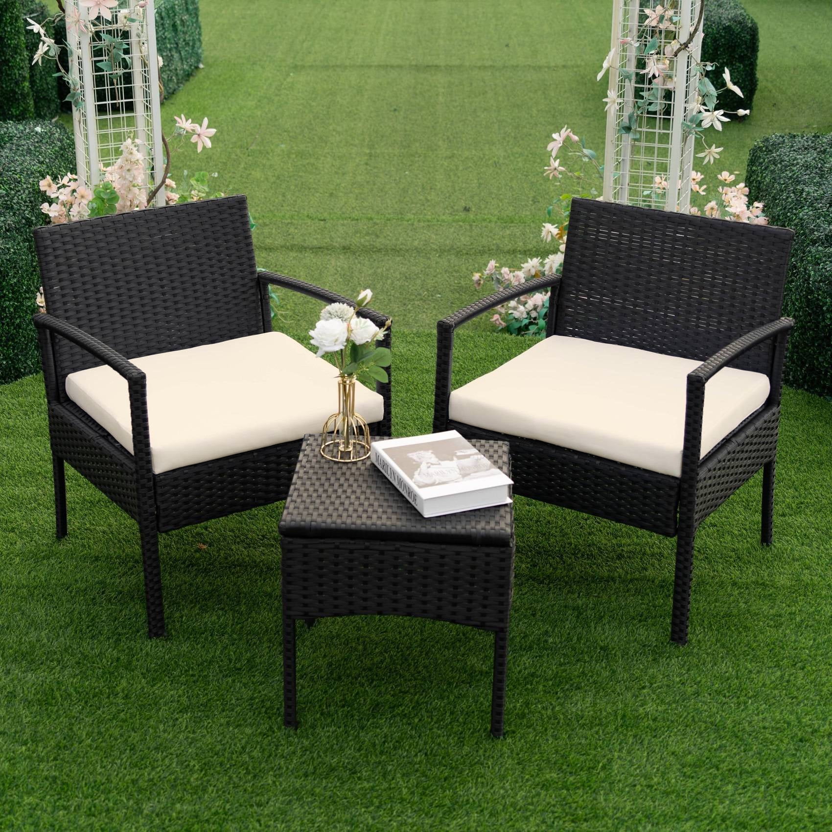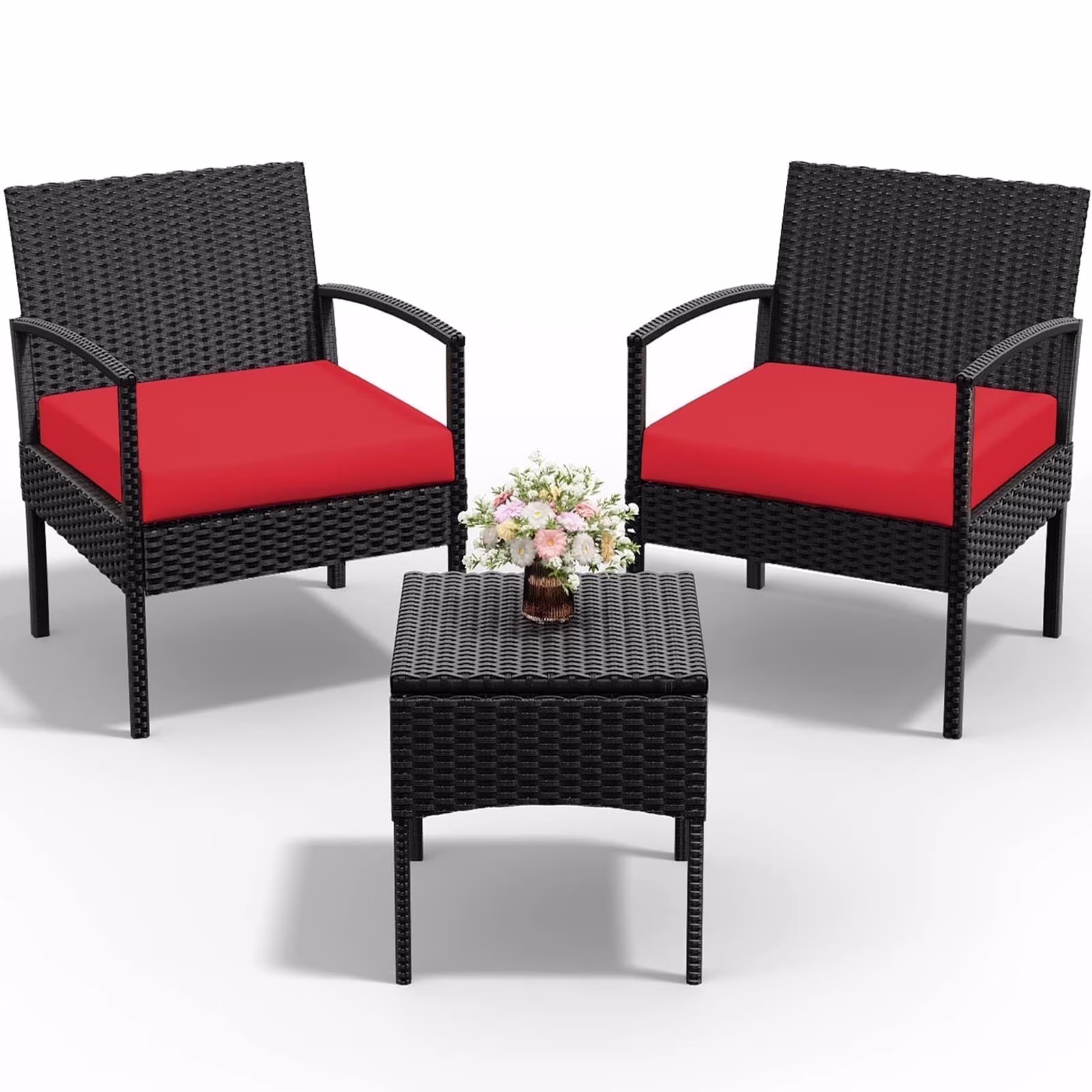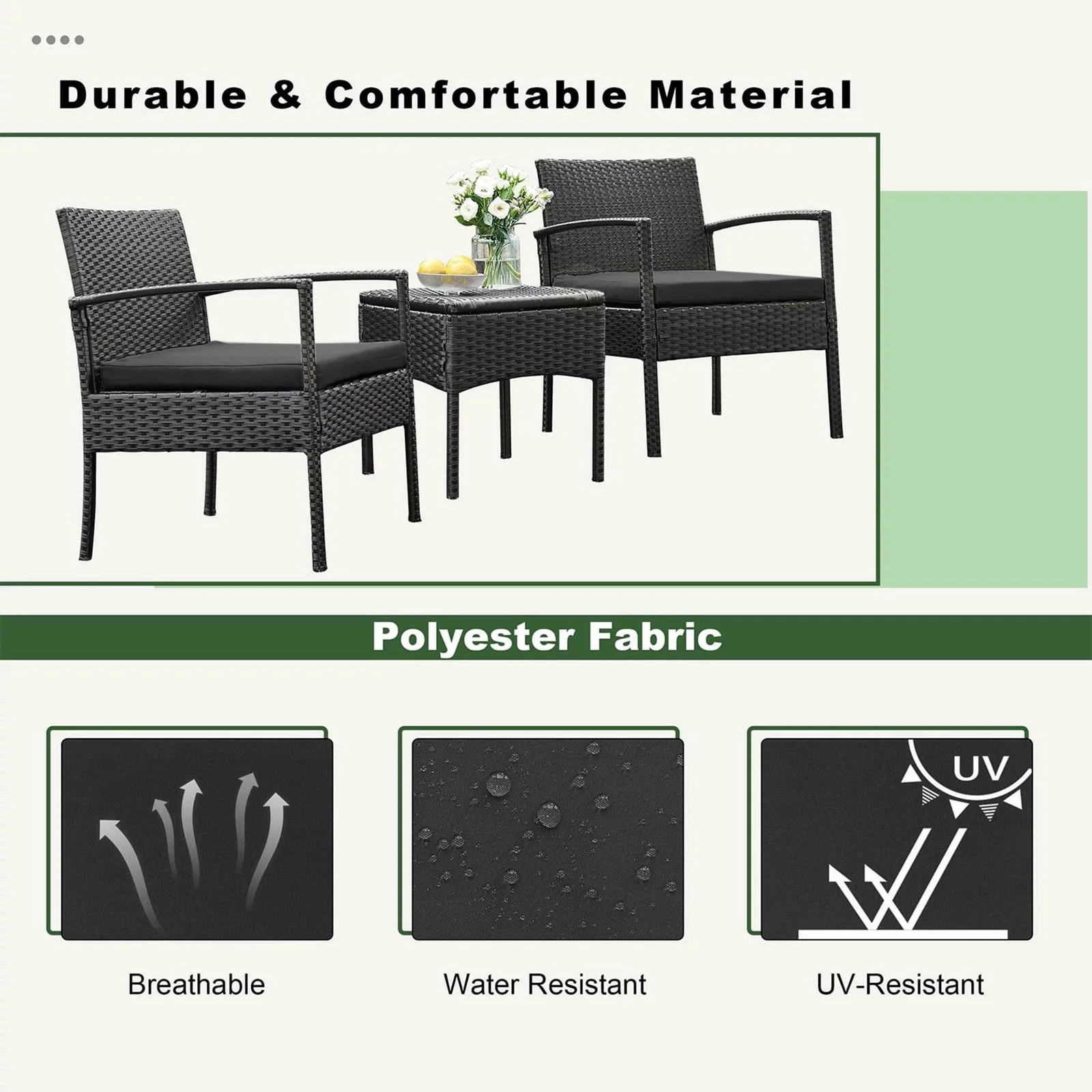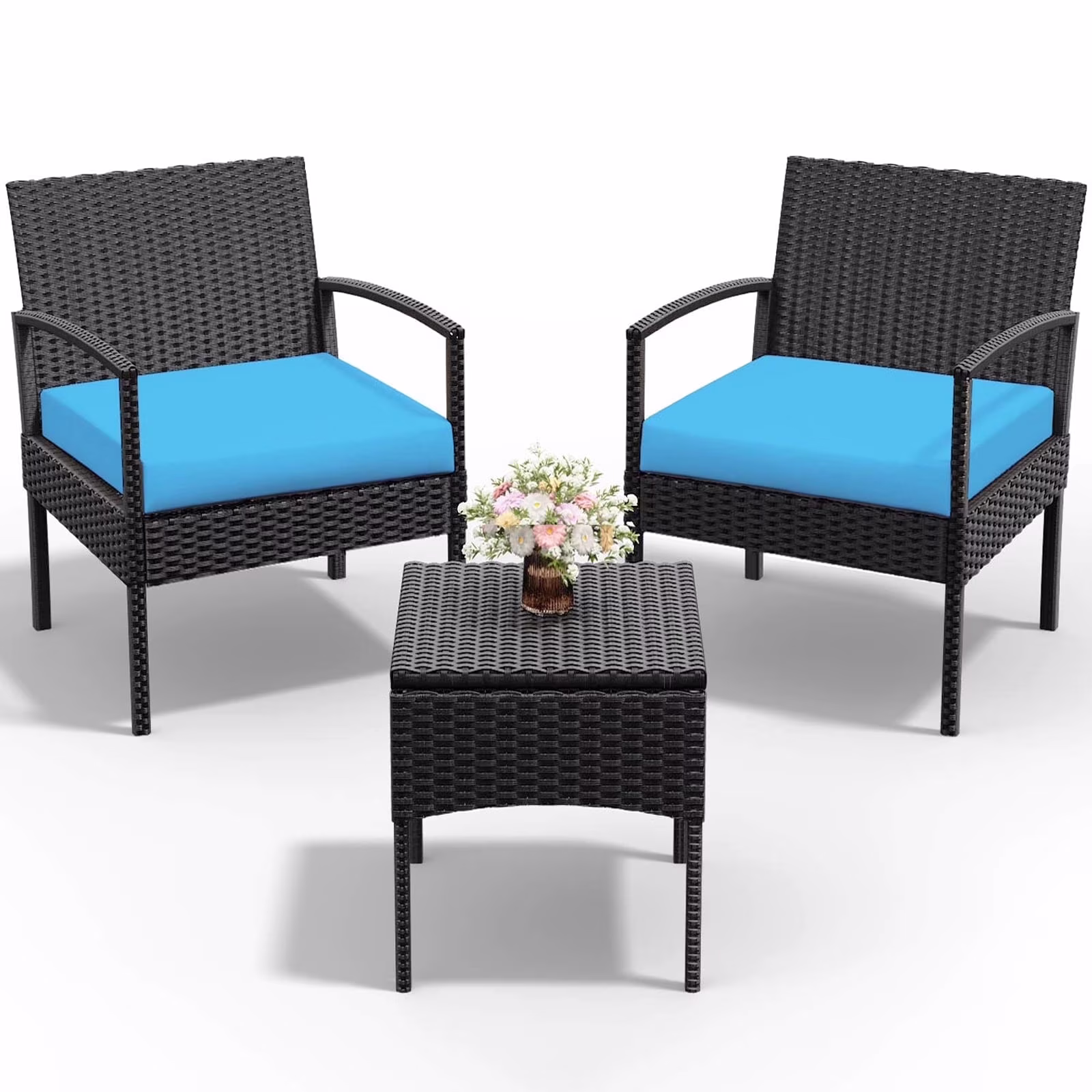 - [Ergonomic Patio Chairs Set] This outdoor furniture set comes with two rattan chairs and a coffee table. The curves of armrests on the both sides are soft and provide sufficient support, fits your arm lines. And the seat back with slight radian embraces your body to allow a better comfort of outdoor living.