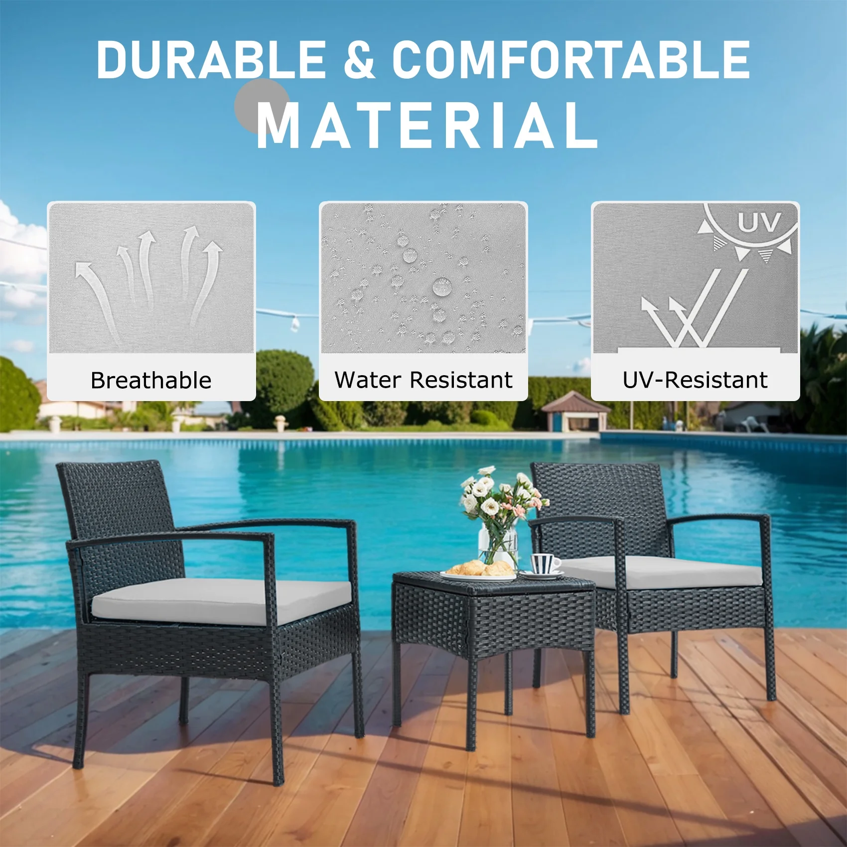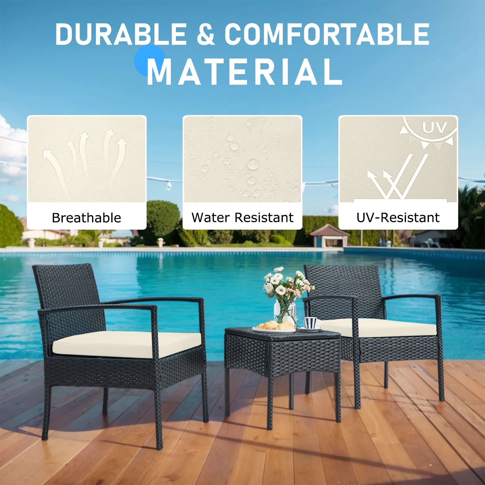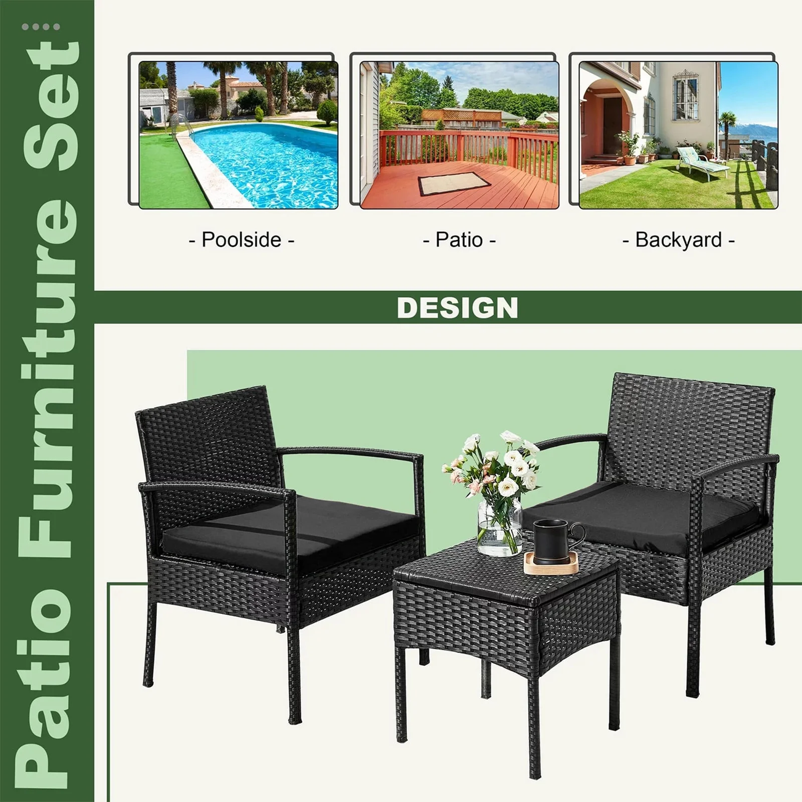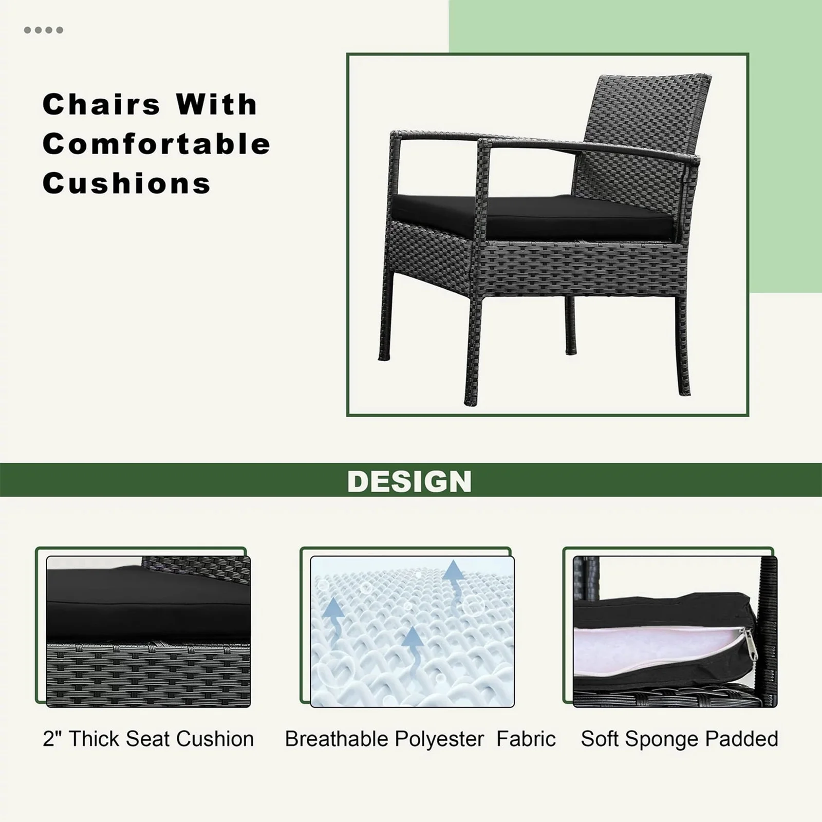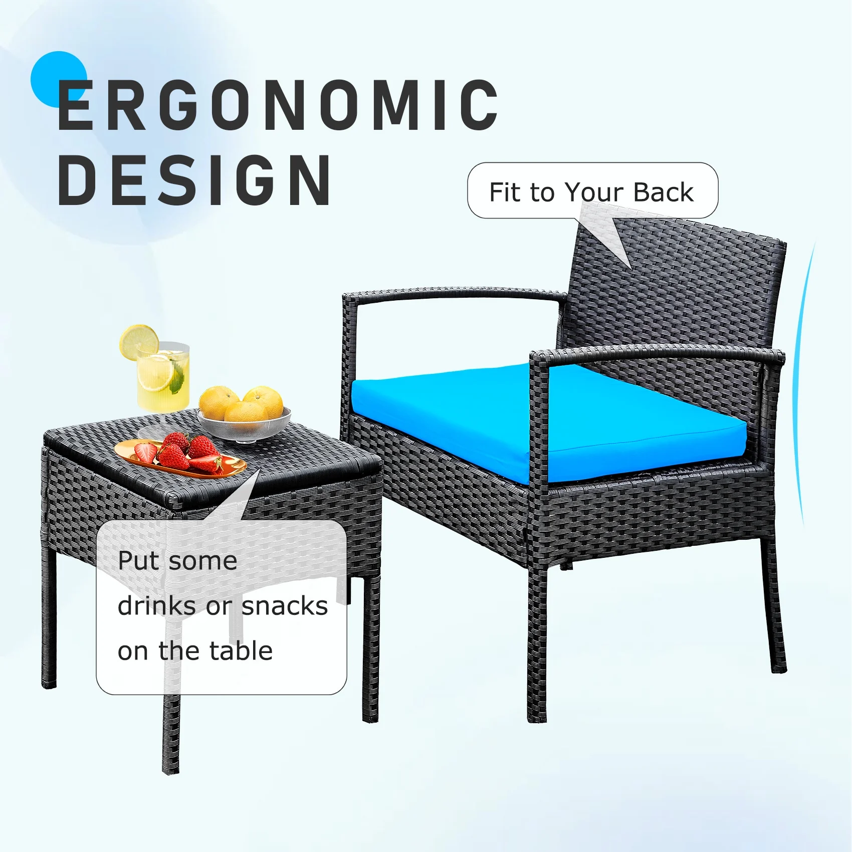- [Ergonomic Patio Chairs Set] This outdoor furniture set comes with two rattan chairs and a coffee table. The curves of armrests on the both sides are soft and provide sufficient support, fits your arm lines. And the seat back with slight radian embraces your body to allow a better comfort of outdoor living.