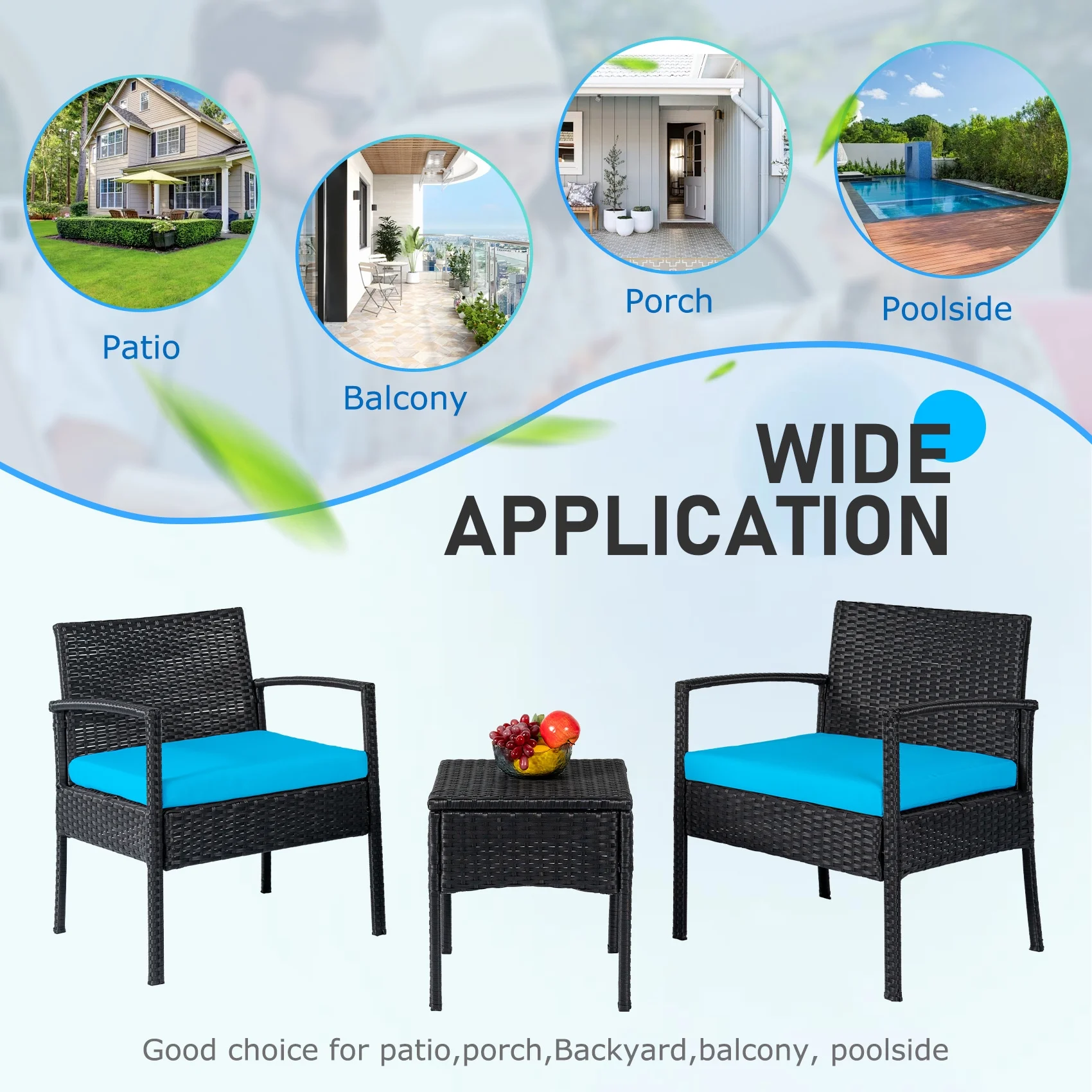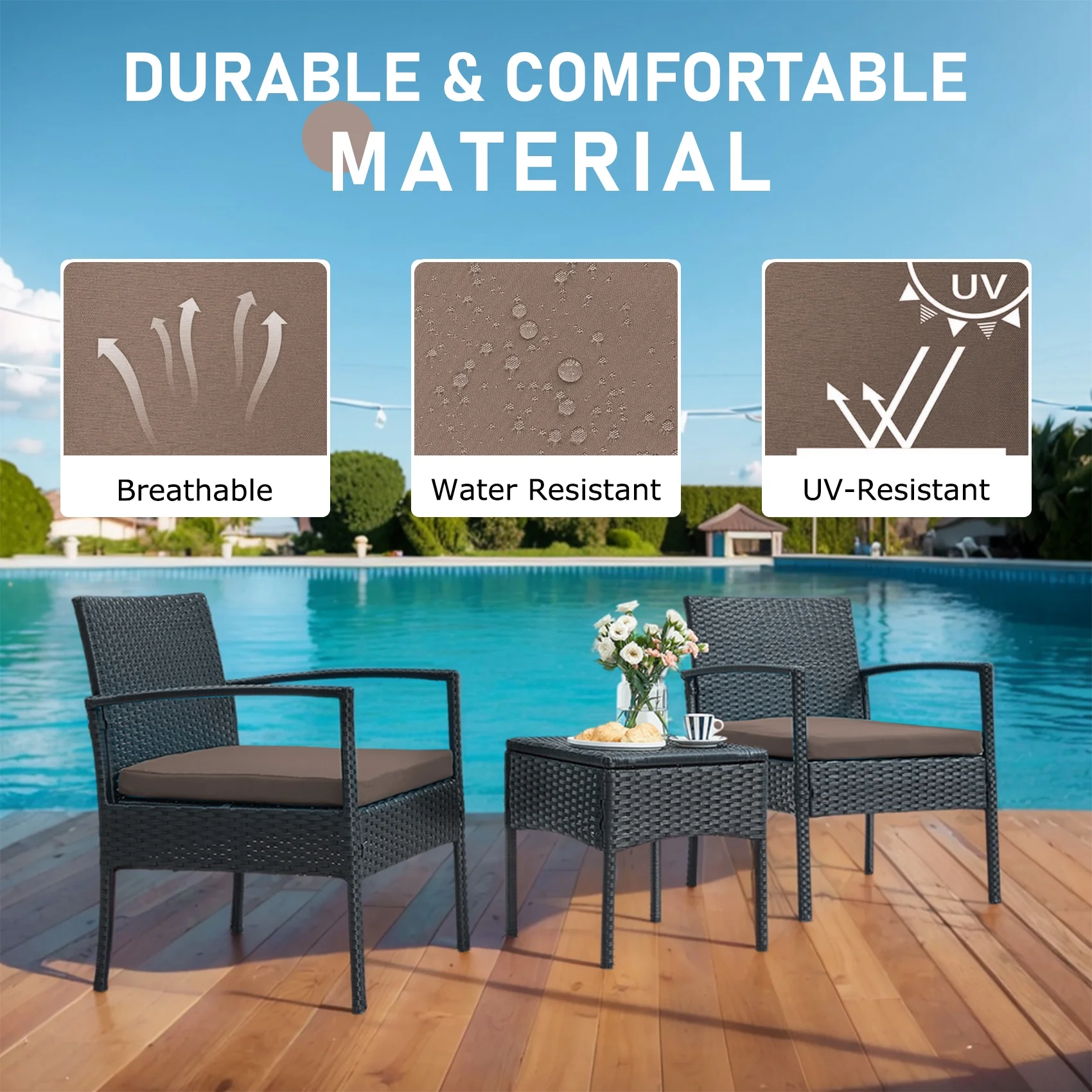 This outdoor furniture set comes with two chairs and a coffee table, providing the perfect setting for any occasion. The weather-resistant rattan chairs feature sturdy steel frames for a long-time use.