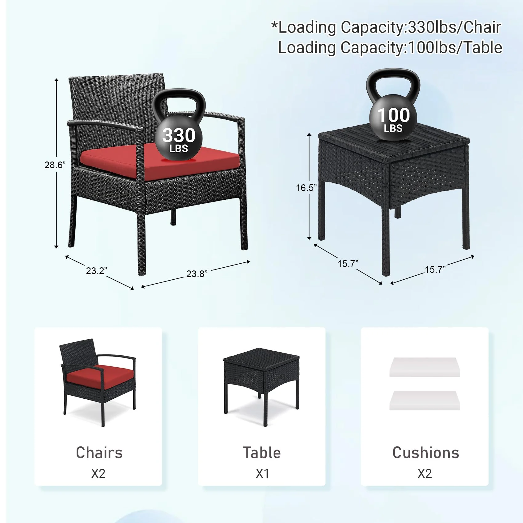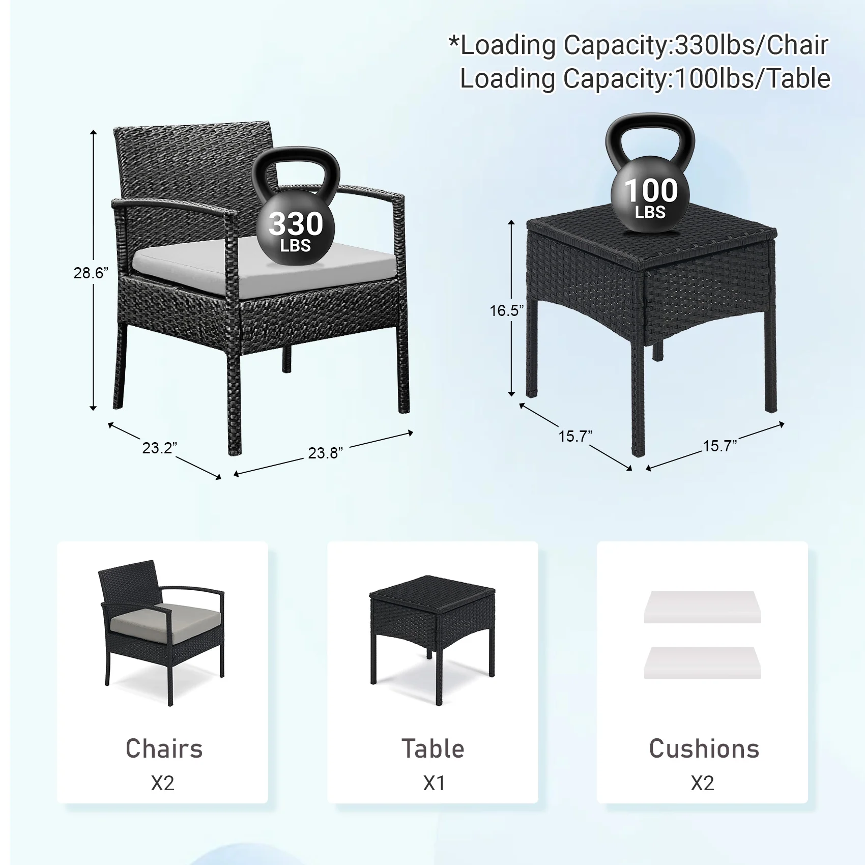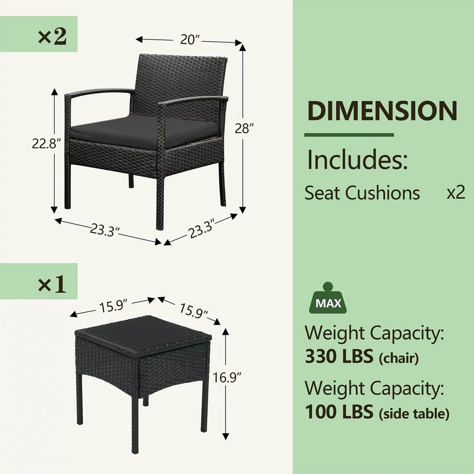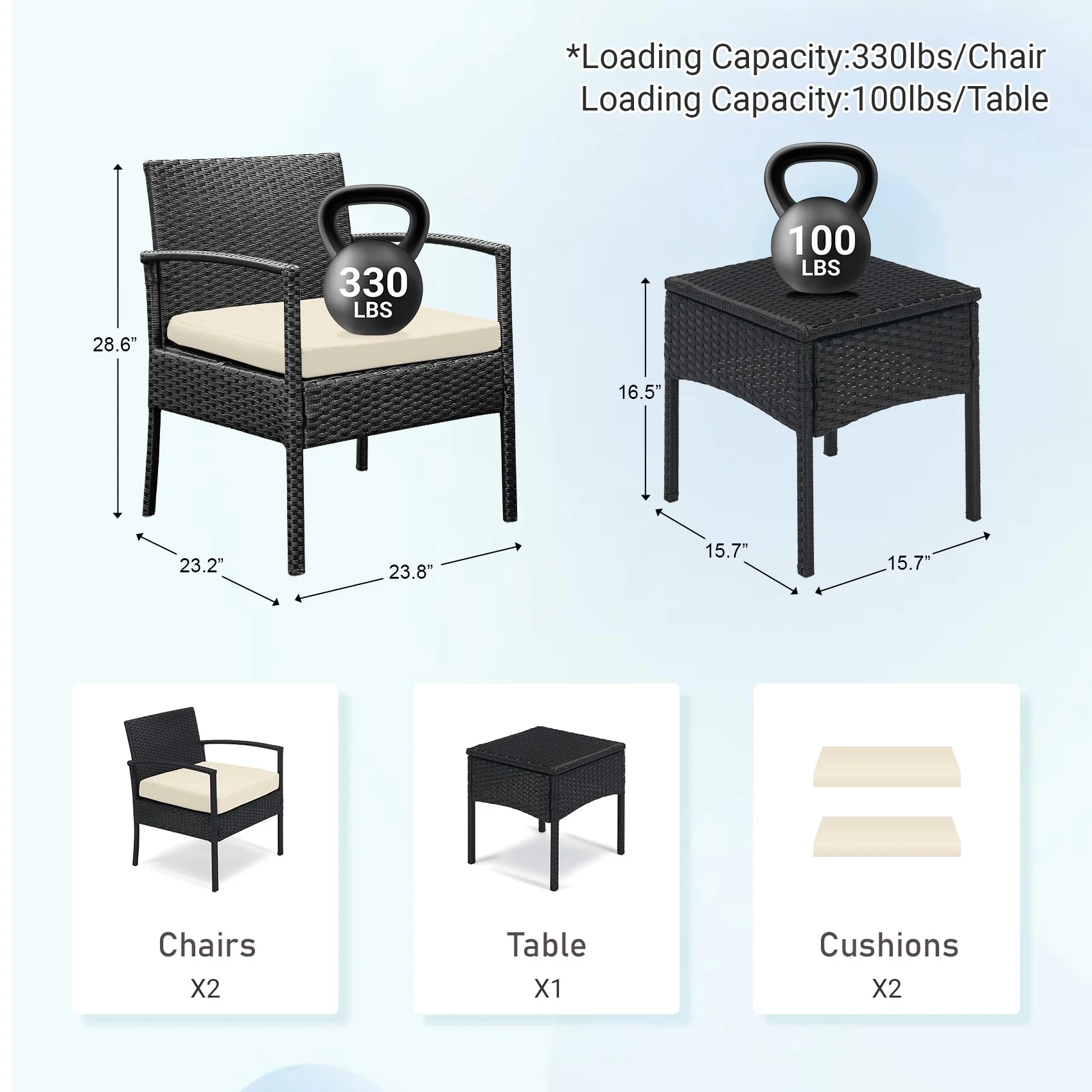 - [Size of Patio Furniture Set] Size of chair: 23'' x23'' x28''(Lx Wx H);Weight capacity of chair: 330lbs; Thickness of cushion: 2''; Size of coffee table: 16'' x16'' x17''(Lx Wx H); Weight capacity of coffee table: 100lbs.
