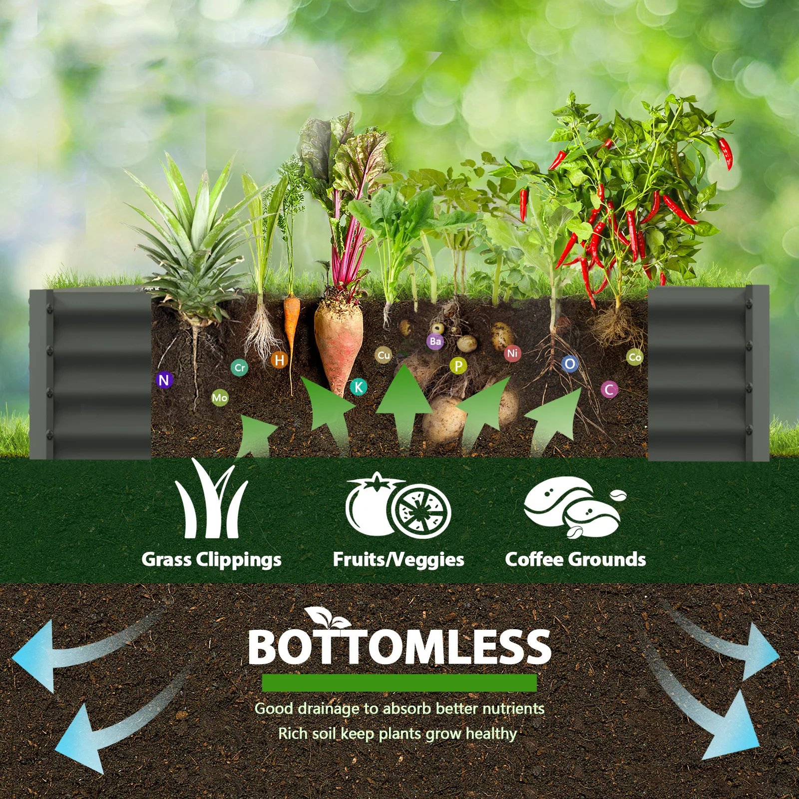- Open-bottom Garden Bed: Built with an open base to prevent water buildup and rot, while allowing roots easy access to nutrients which will improve their quality significantly.