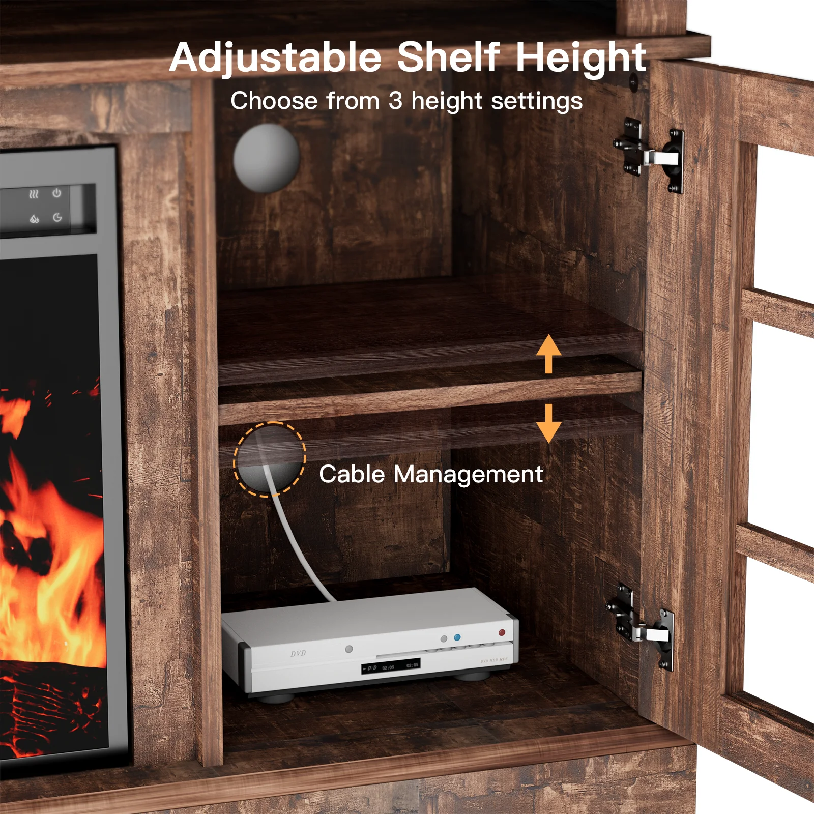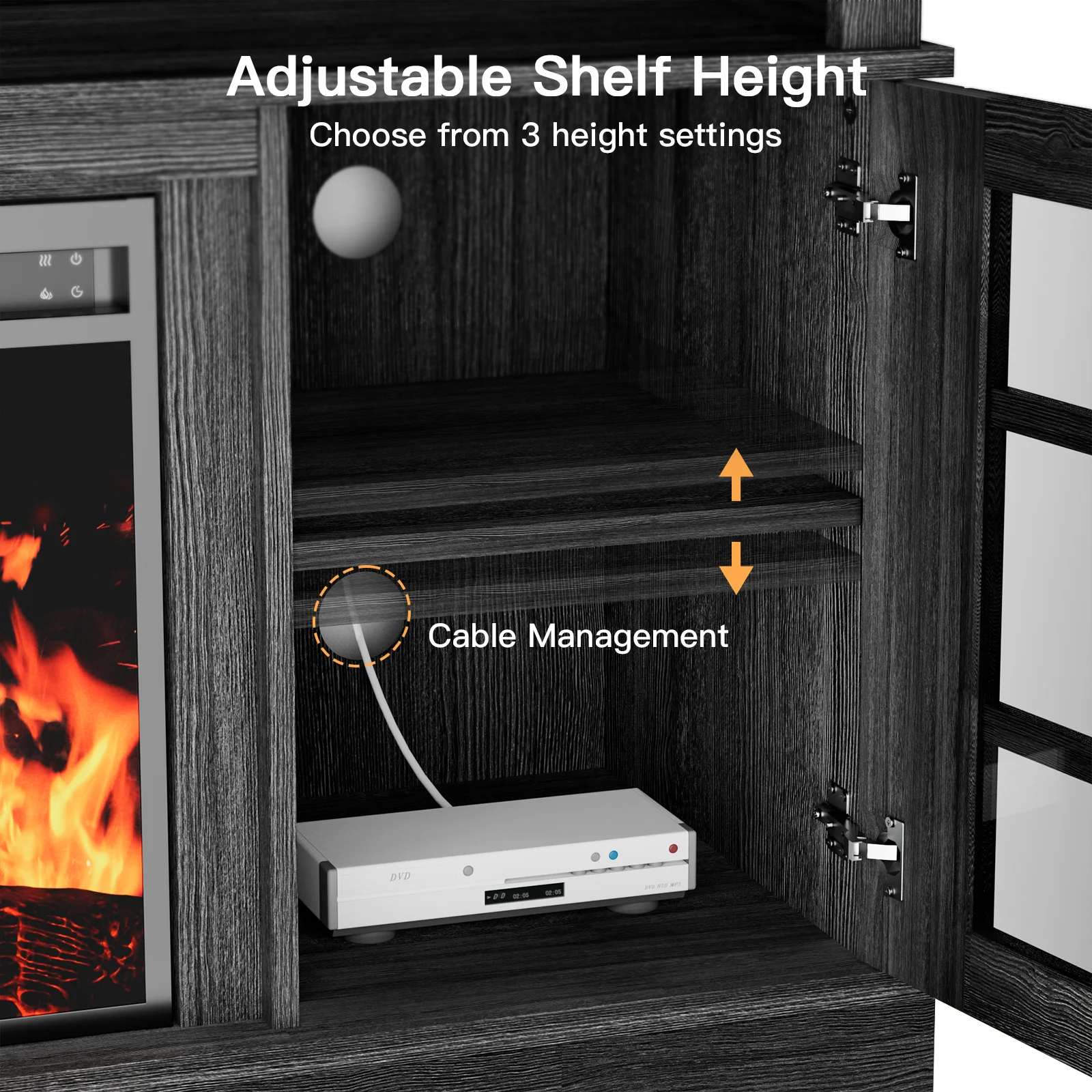 - Cable Management: The TV stand with fireplace is designed with cable holes for easy cable management. The shelves in the cabinets are adjustable to fit different sizes of items. Simply move the pegs higher or lower to configure one of three height positions