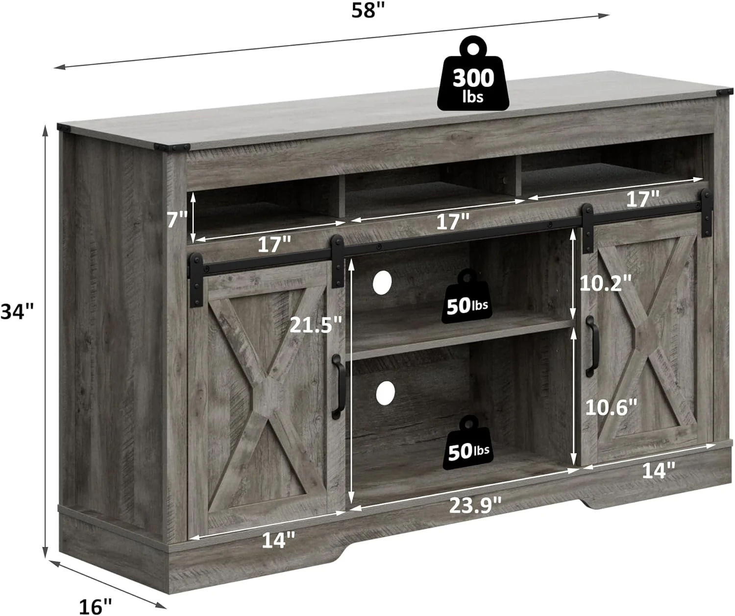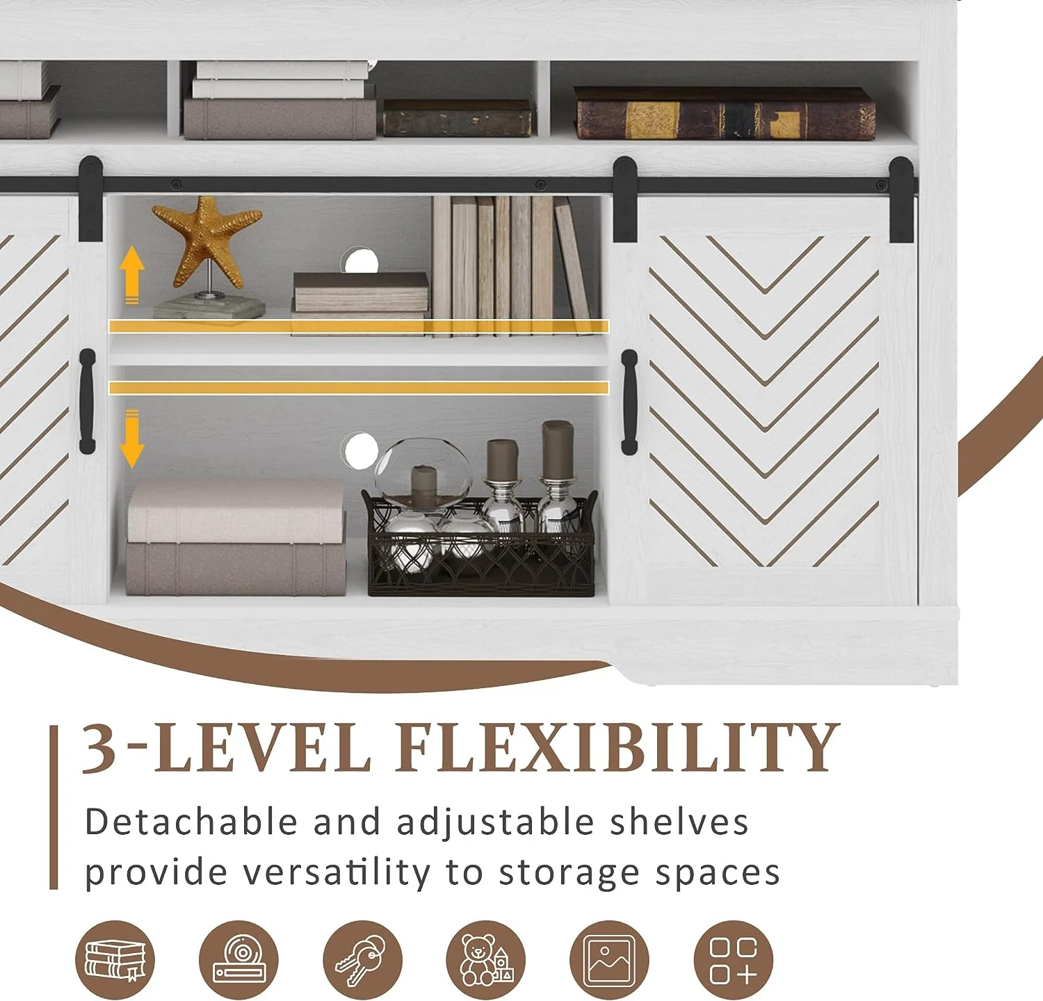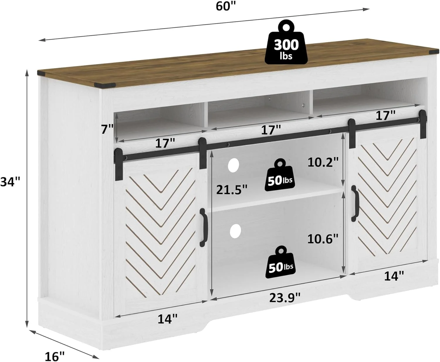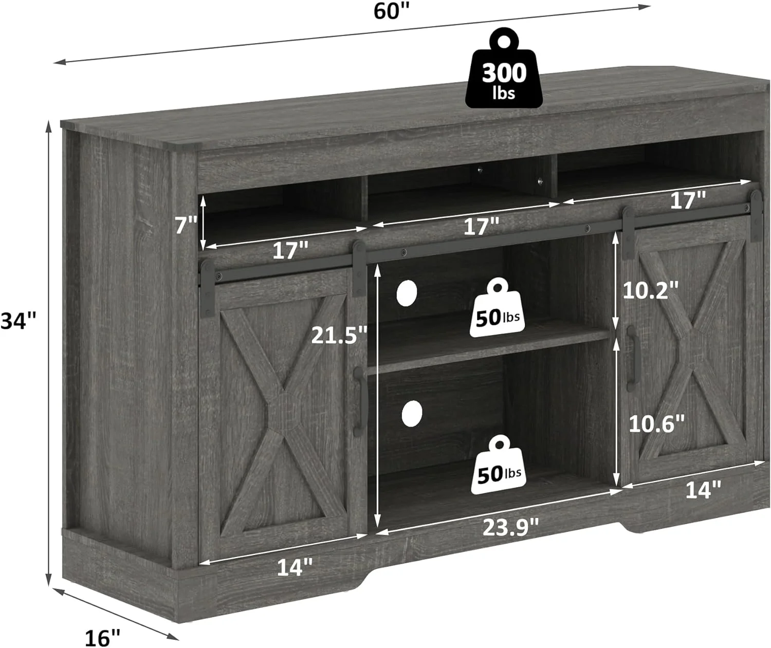 - Who knew storage could be this stylish? Measuring 60" W x 34" H x 16" D, this farmhouse TV stand offers the perfect blend of functionality and charm. Featuring both open and closed compartments, it allows you to showcase your favorite decor on the central shelves while keeping things organized with three adjustable inner shelves for customizable storage.