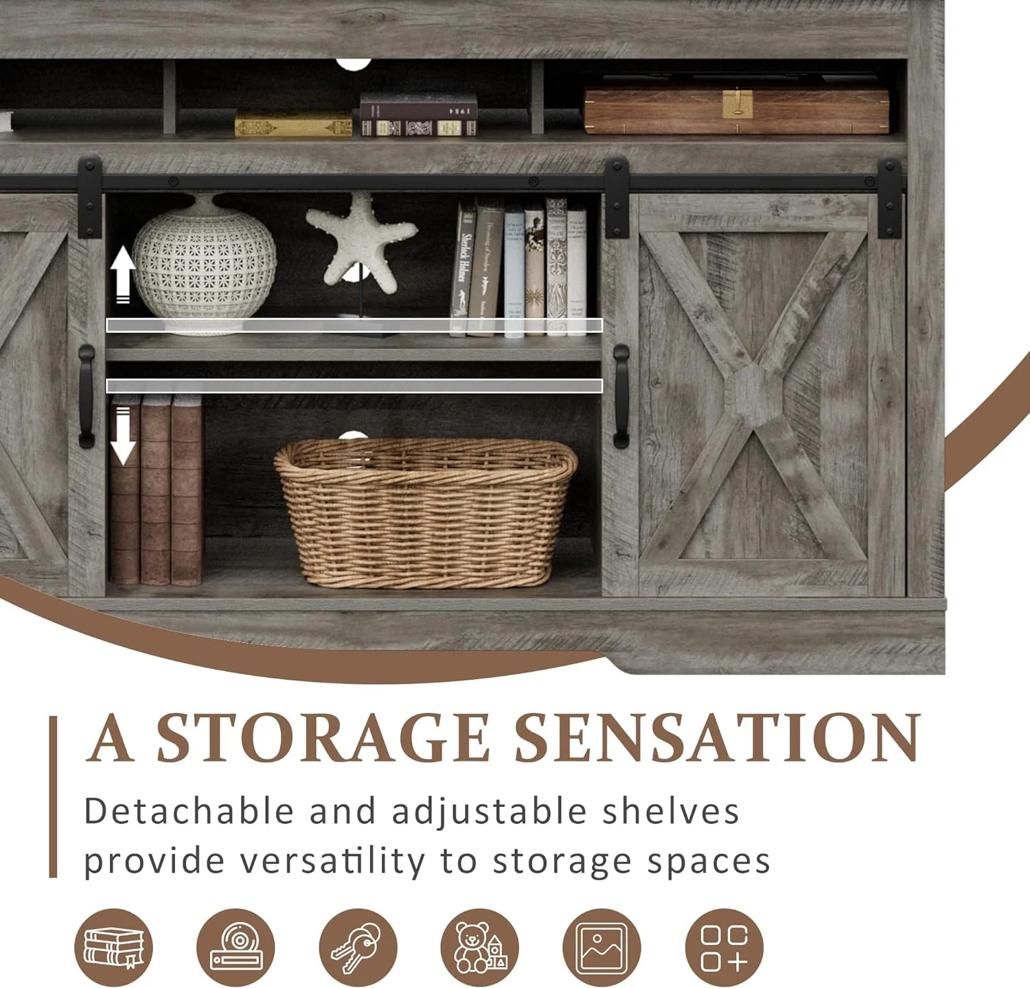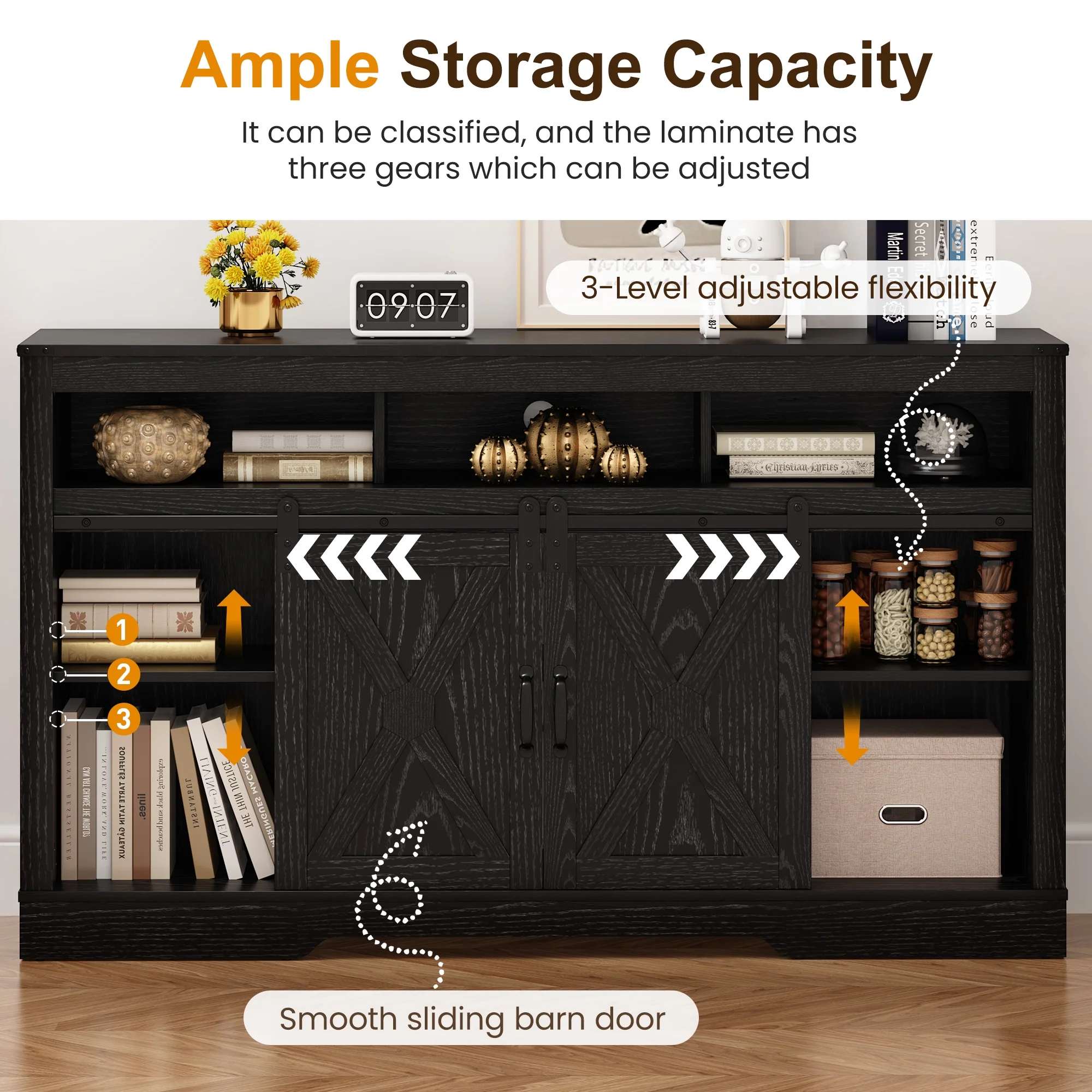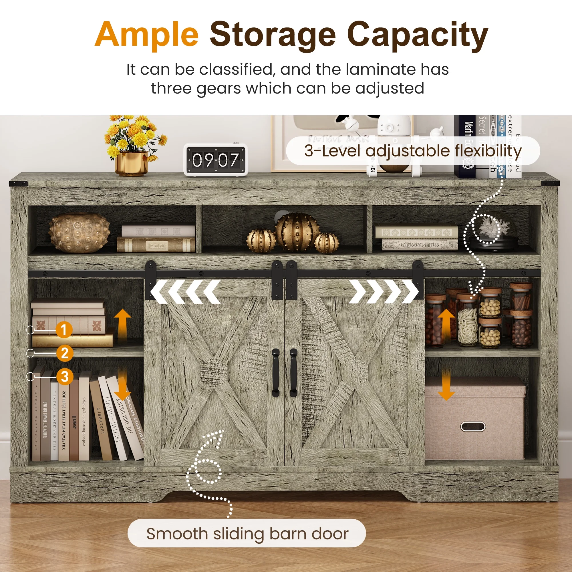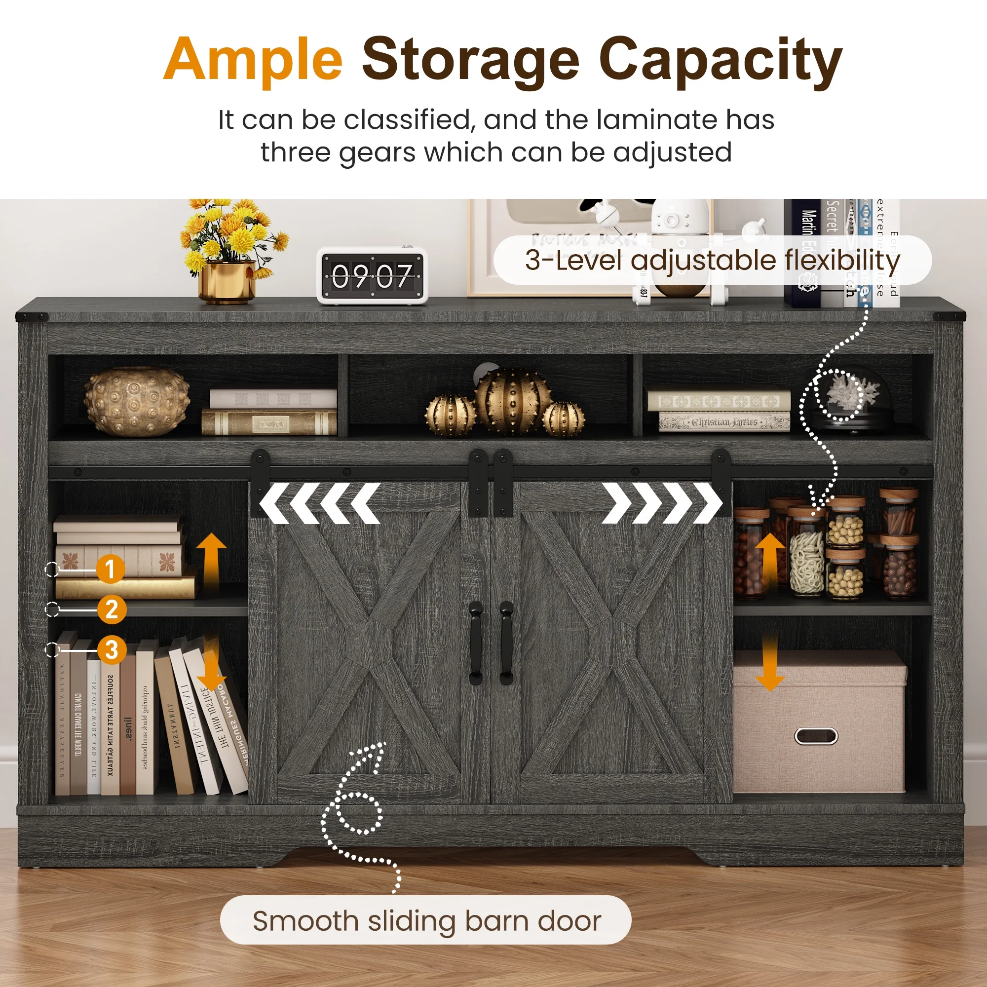 - Who knew storage could be this stylish? Measuring 60" W x 34" H x 16" D, this farmhouse TV stand offers the perfect blend of functionality and charm. Featuring both open and closed compartments, it allows you to showcase your favorite decor on the central shelves while keeping things organized with three adjustable inner shelves for customizable storage.