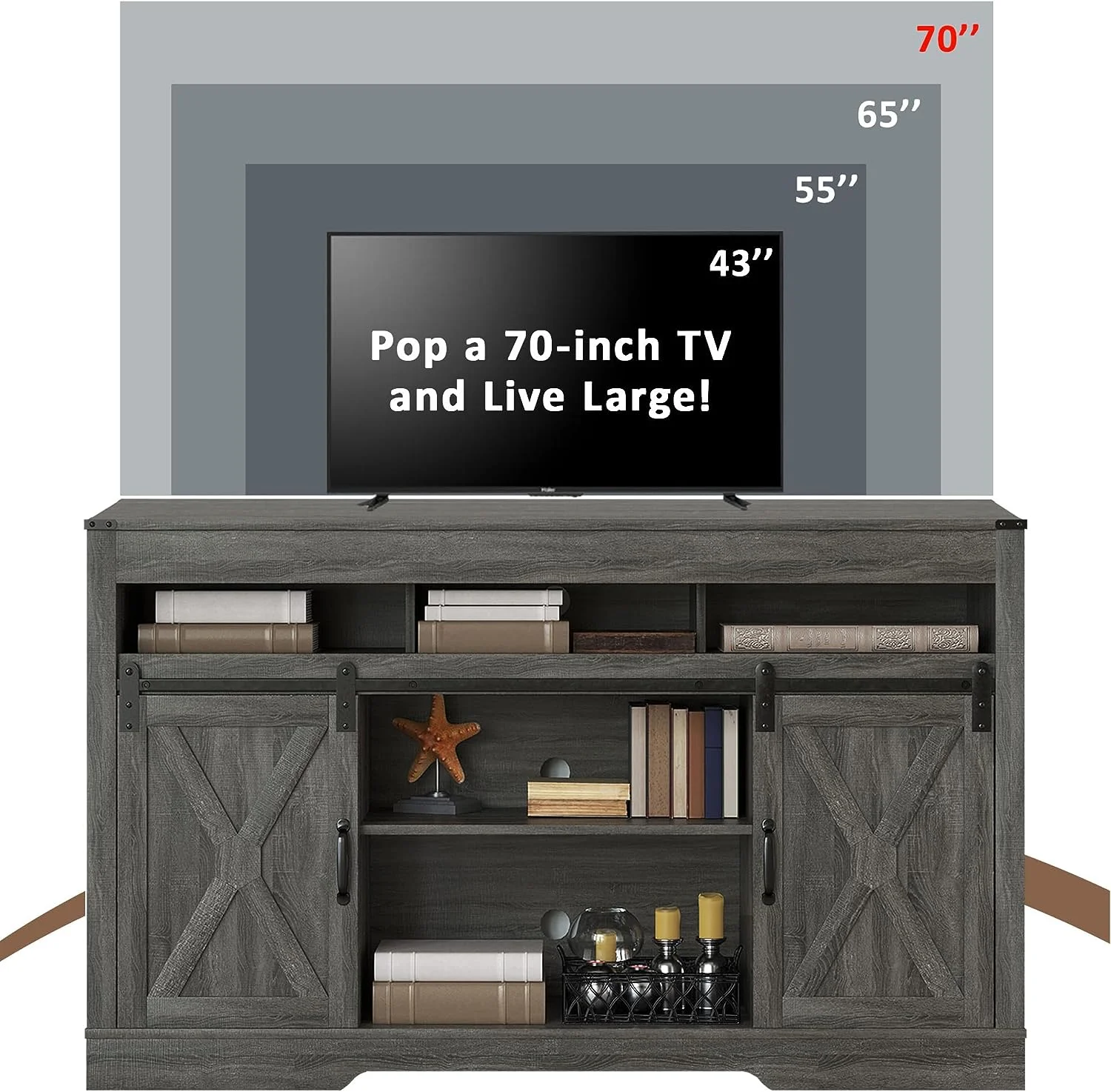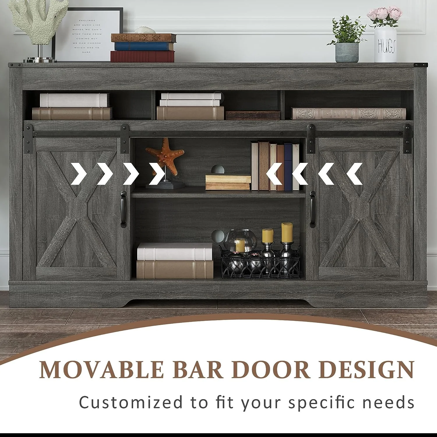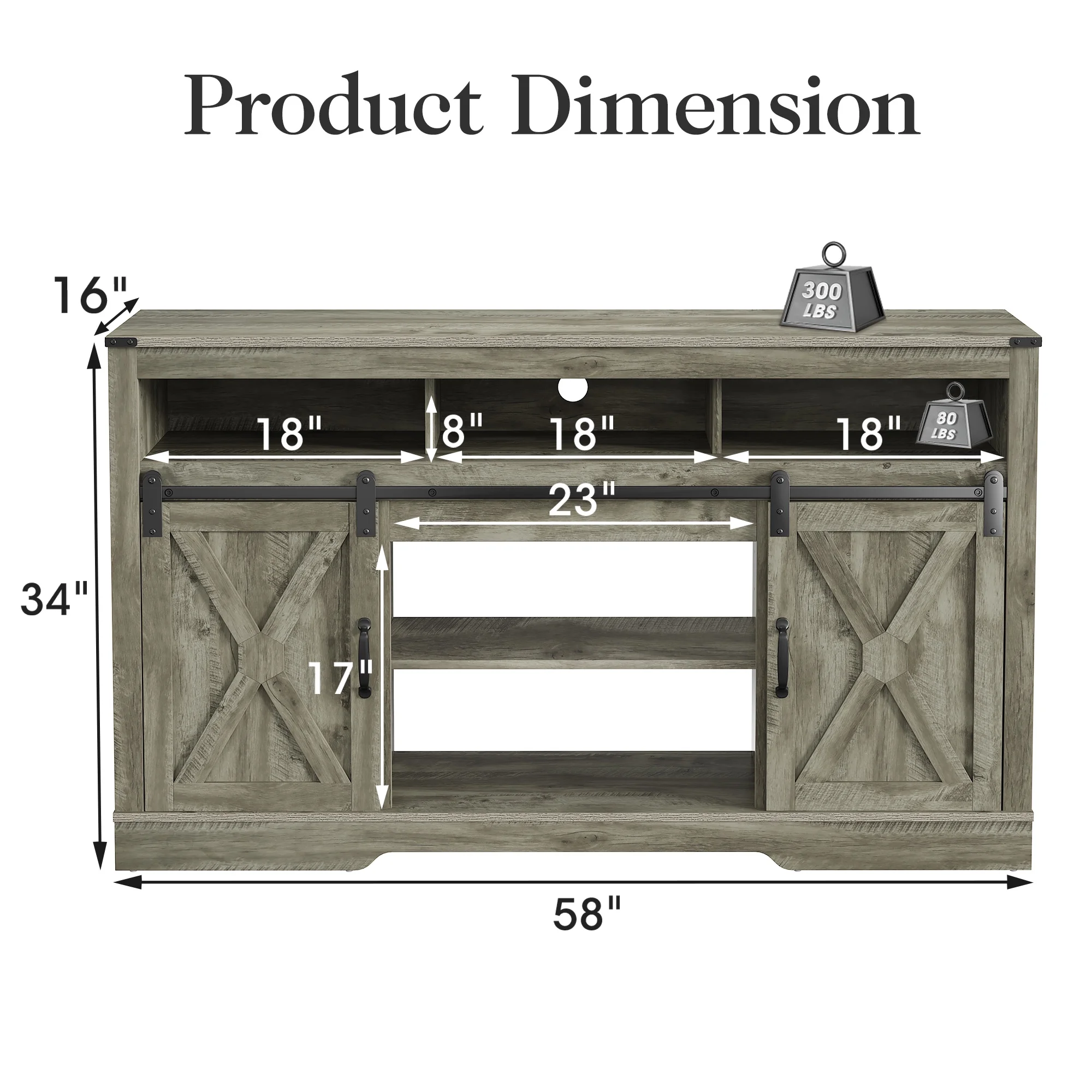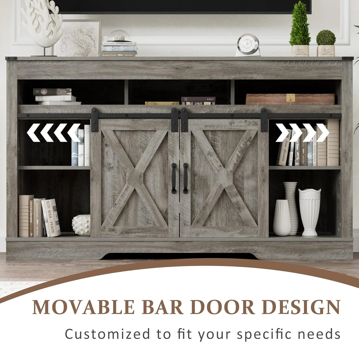 Mayincolor Farmhouse TV Stand for 65+ Inch TV, 34'' Tall Entertainment Center with Sliding Barn Doors, Rustic Wood Media Console Storage Cabinet Television Stand for Living Room, Light Grey