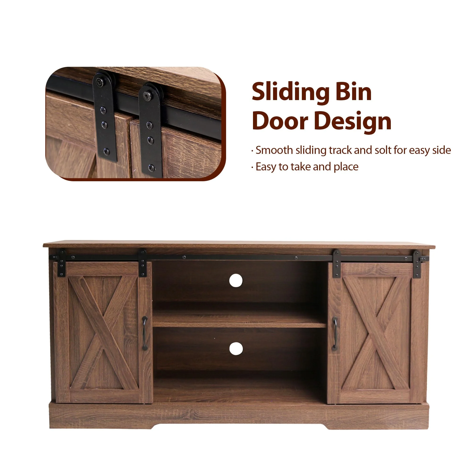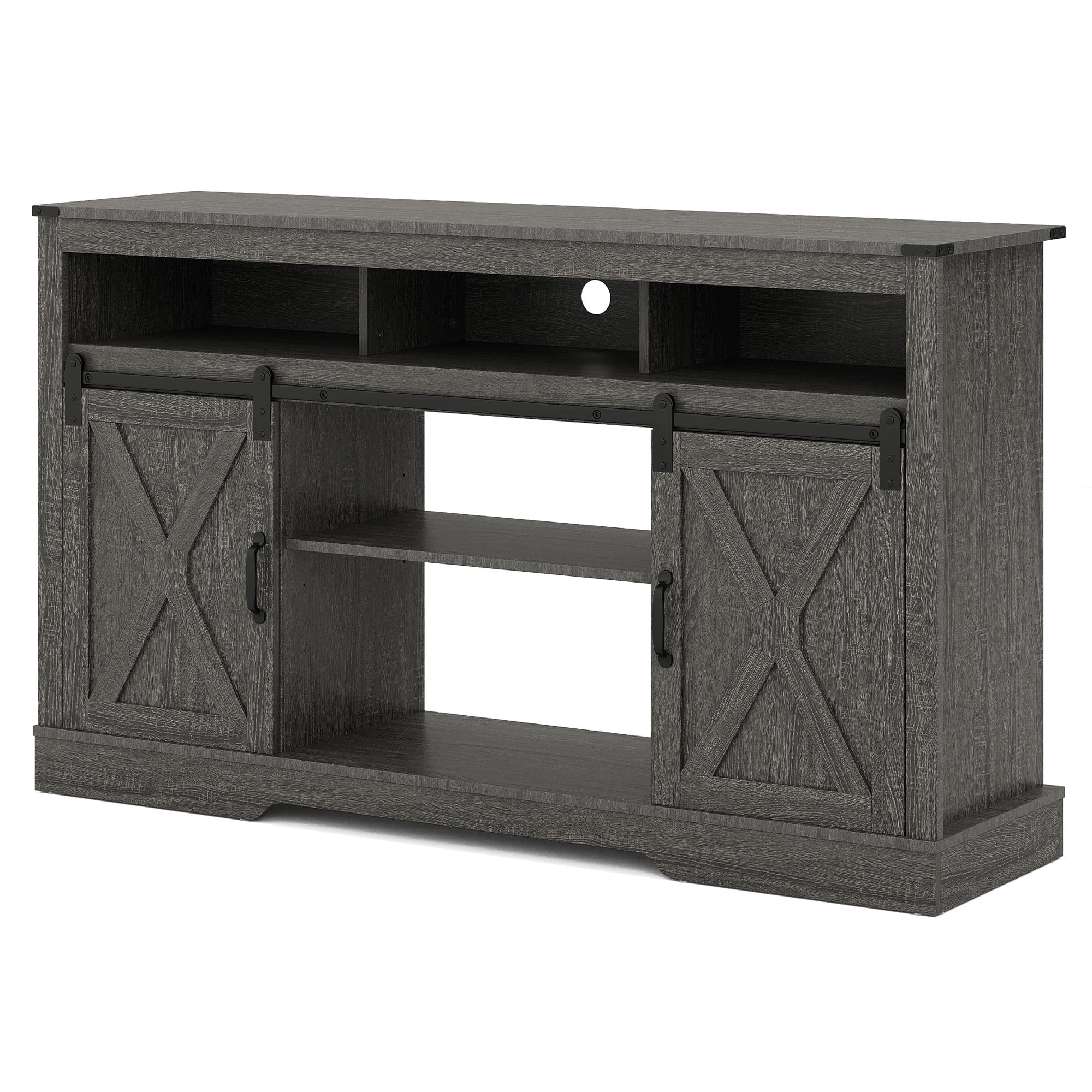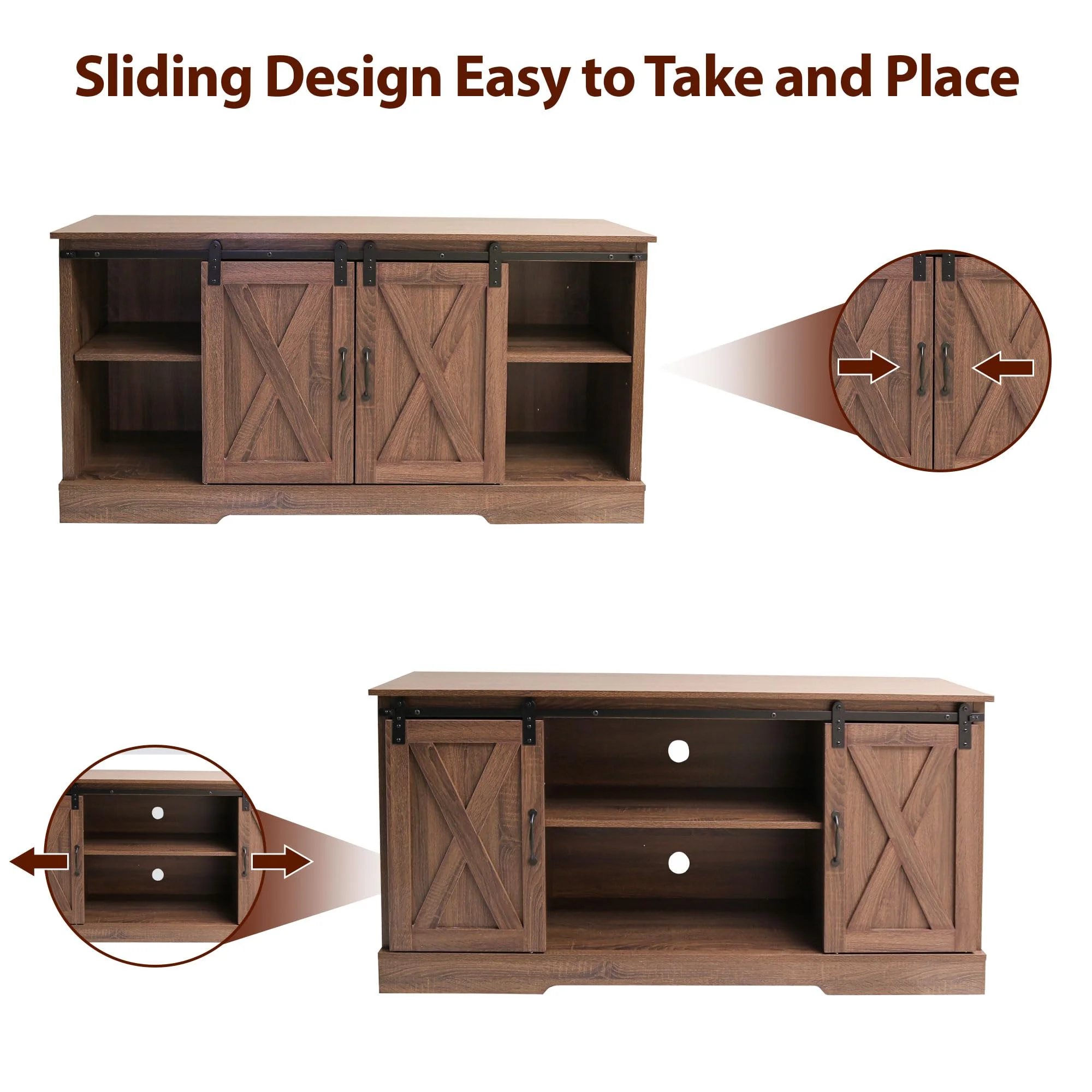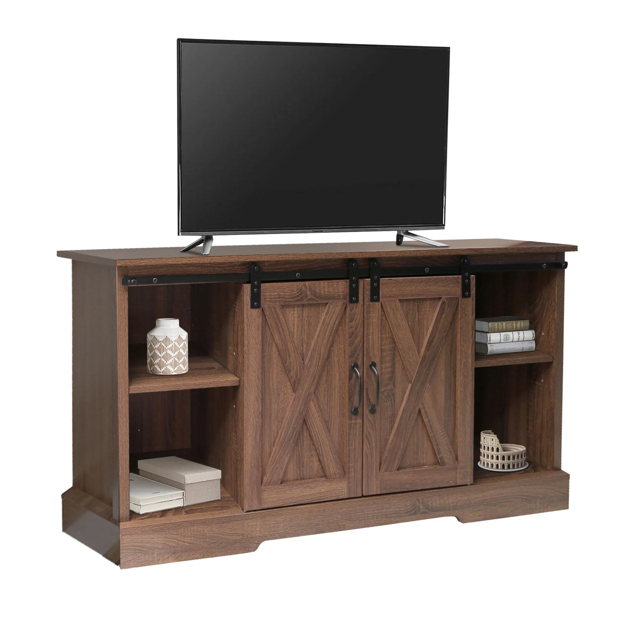 - Rustic charm meets modern convenience with this entertainment center. The barn-inspired doors glide effortlessly along steel rails with exposed wheels, providing easy access to your gadgets while discreetly concealing any clutter you prefer to keep hidden.