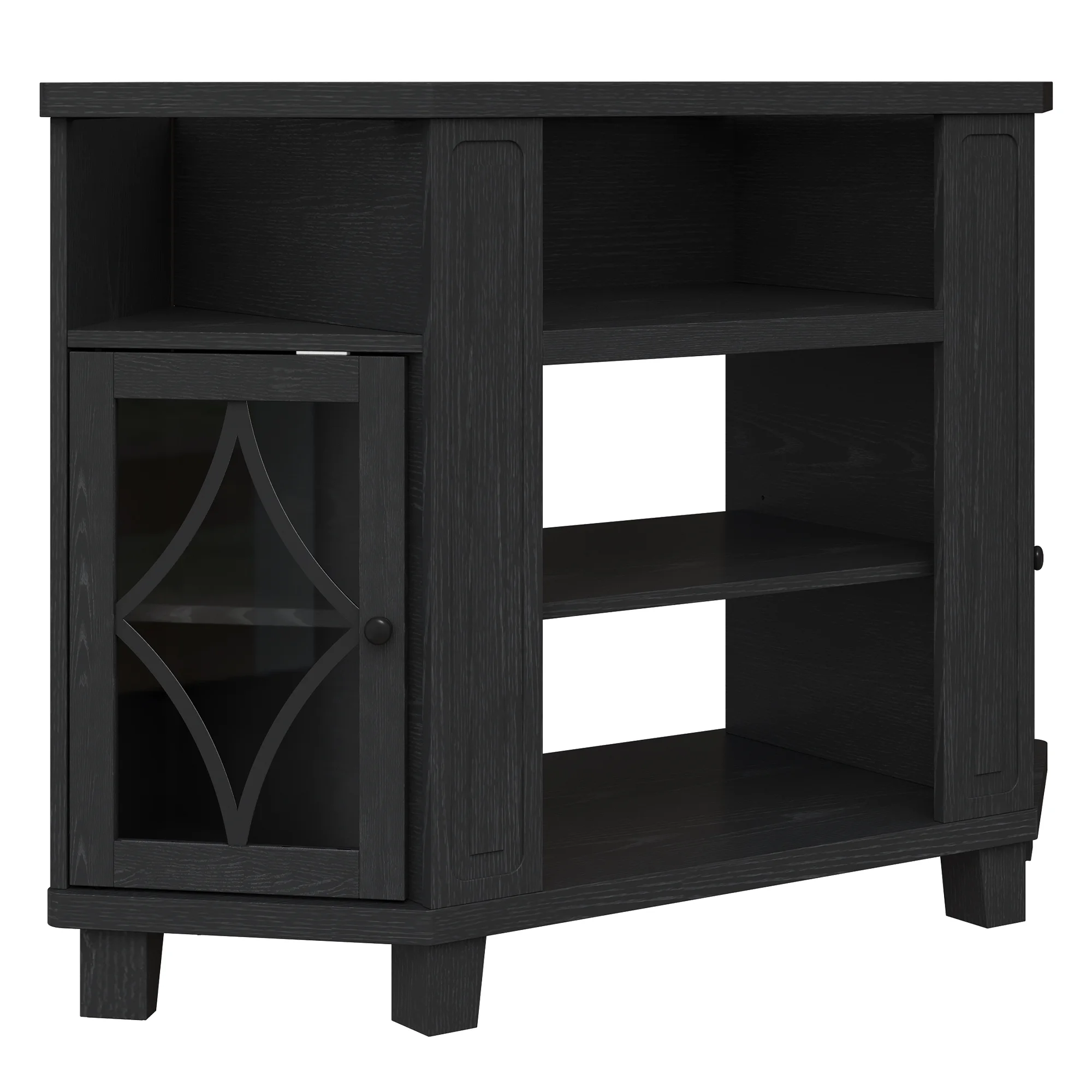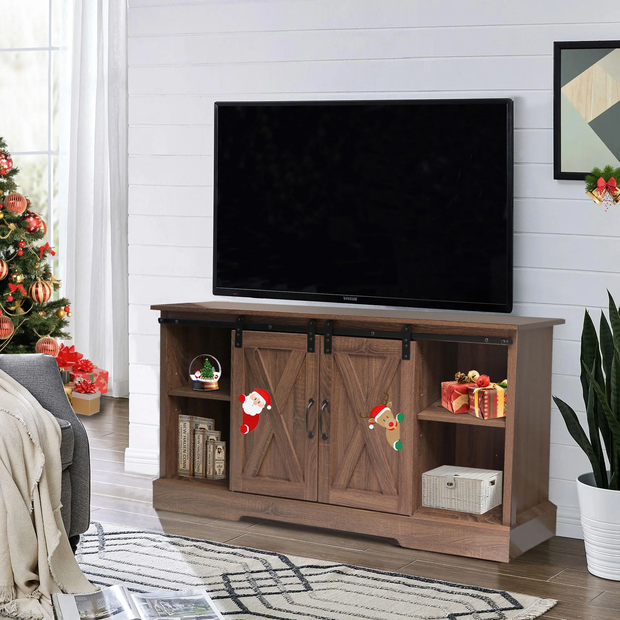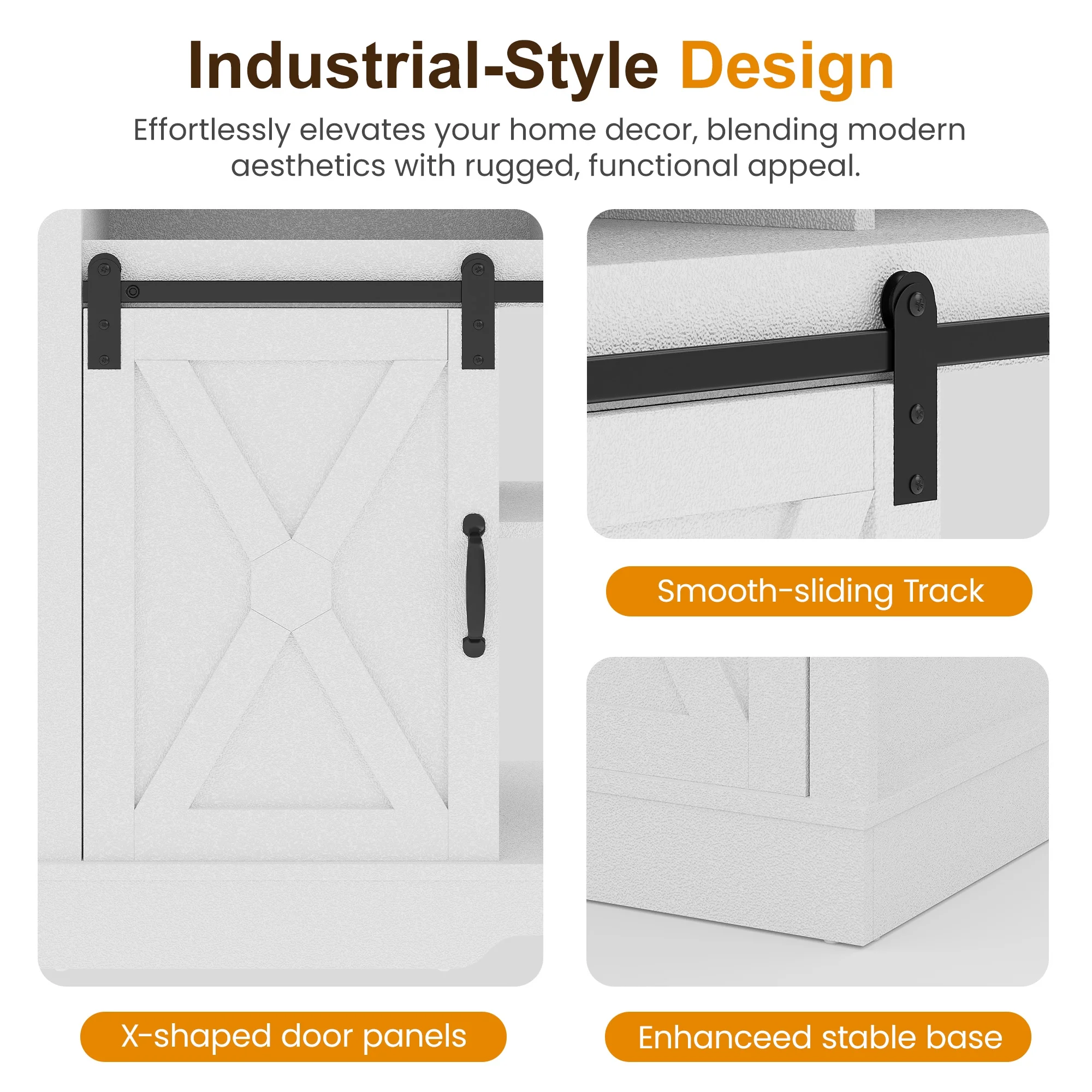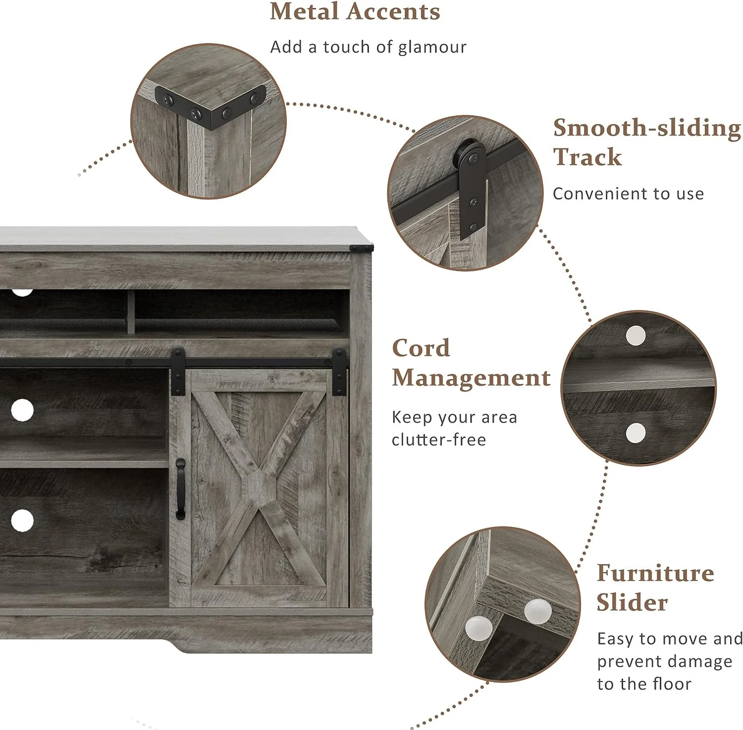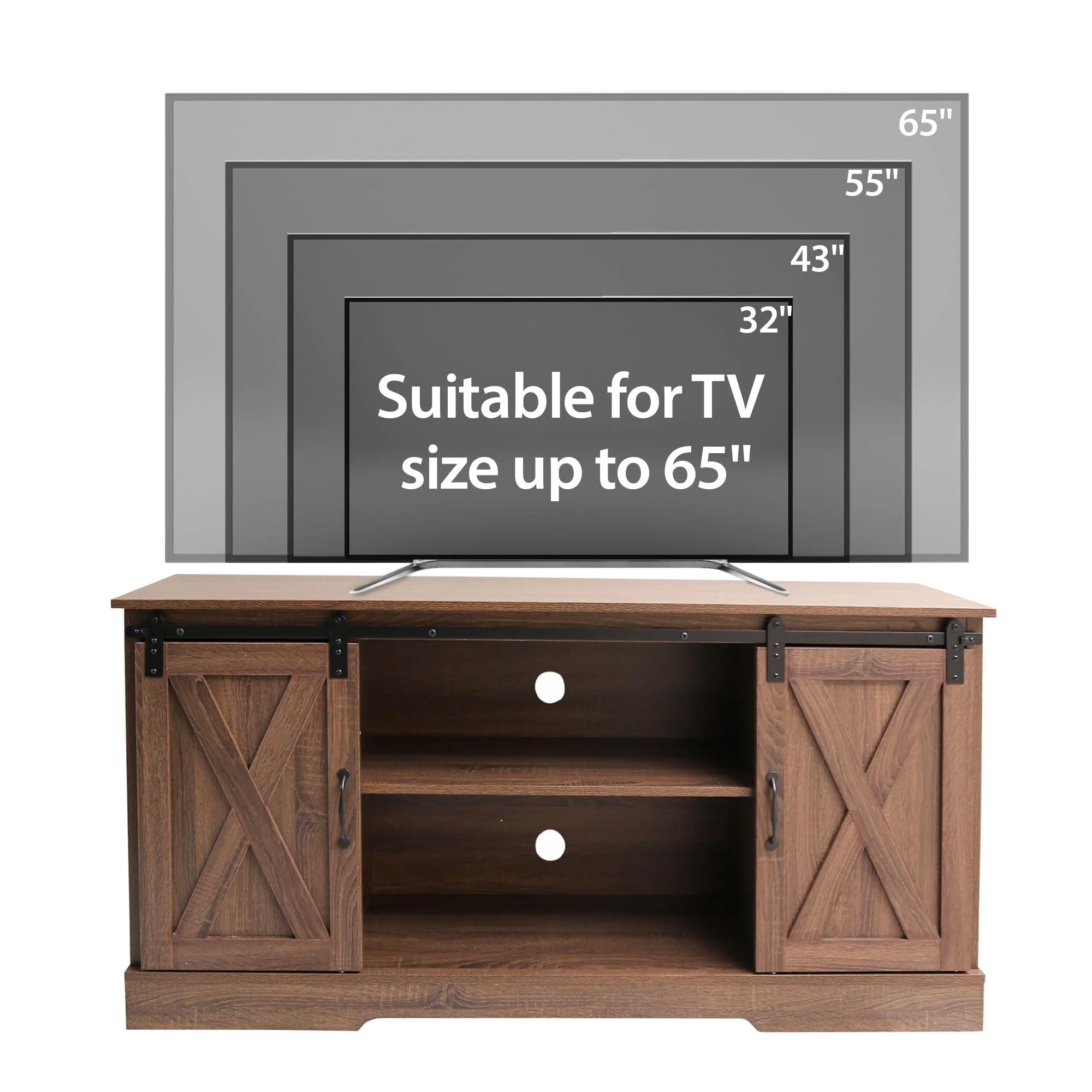 - Rustic charm meets modern convenience with this entertainment center. The barn-inspired doors glide effortlessly along steel rails with exposed wheels, providing easy access to your gadgets while discreetly concealing any clutter you prefer to keep hidden.