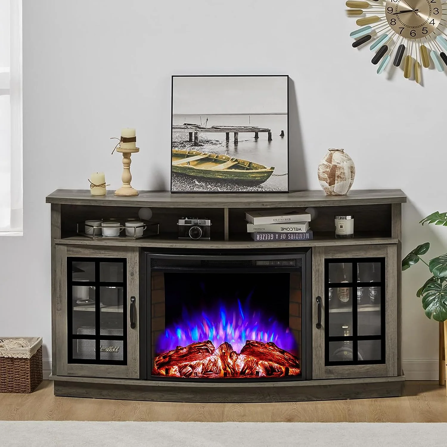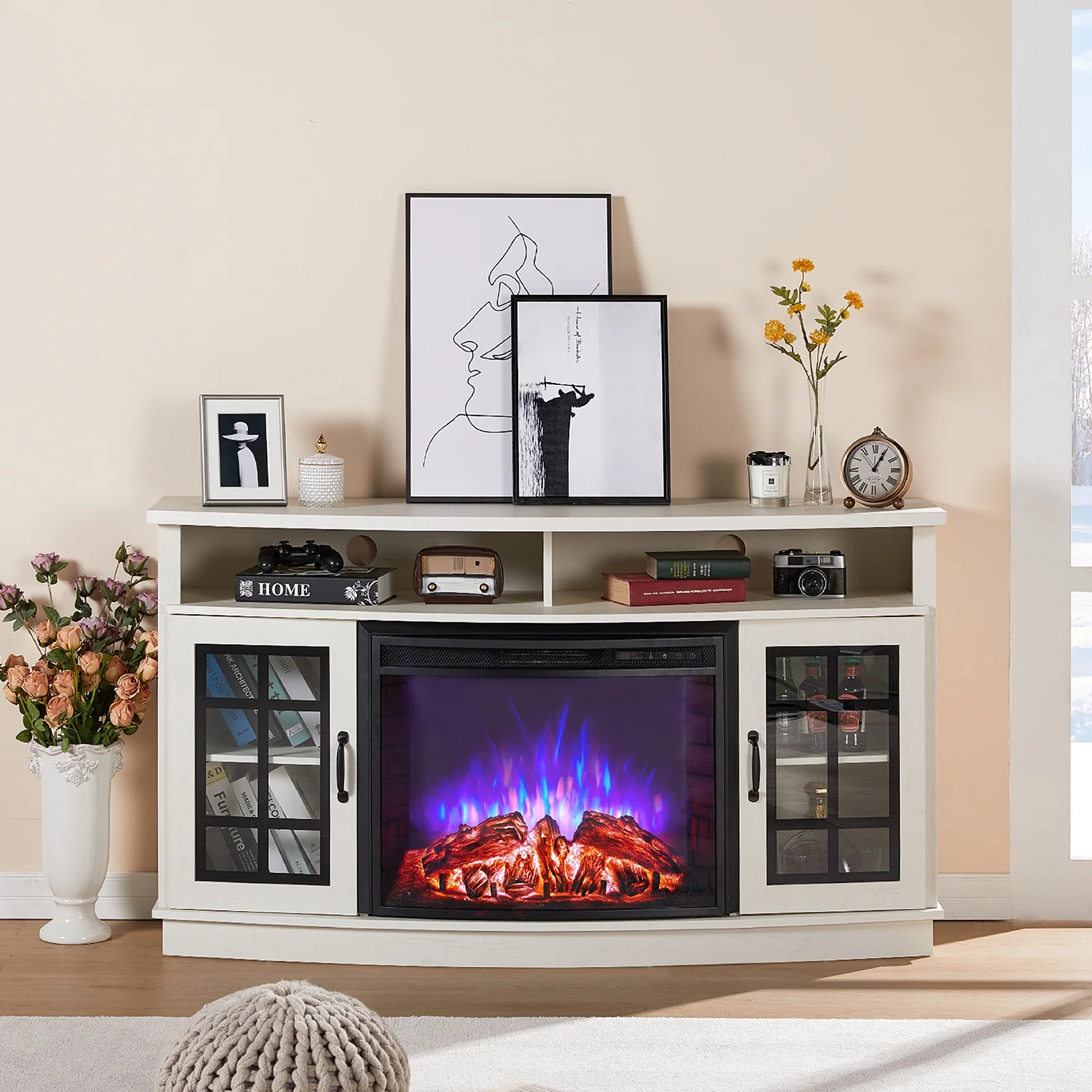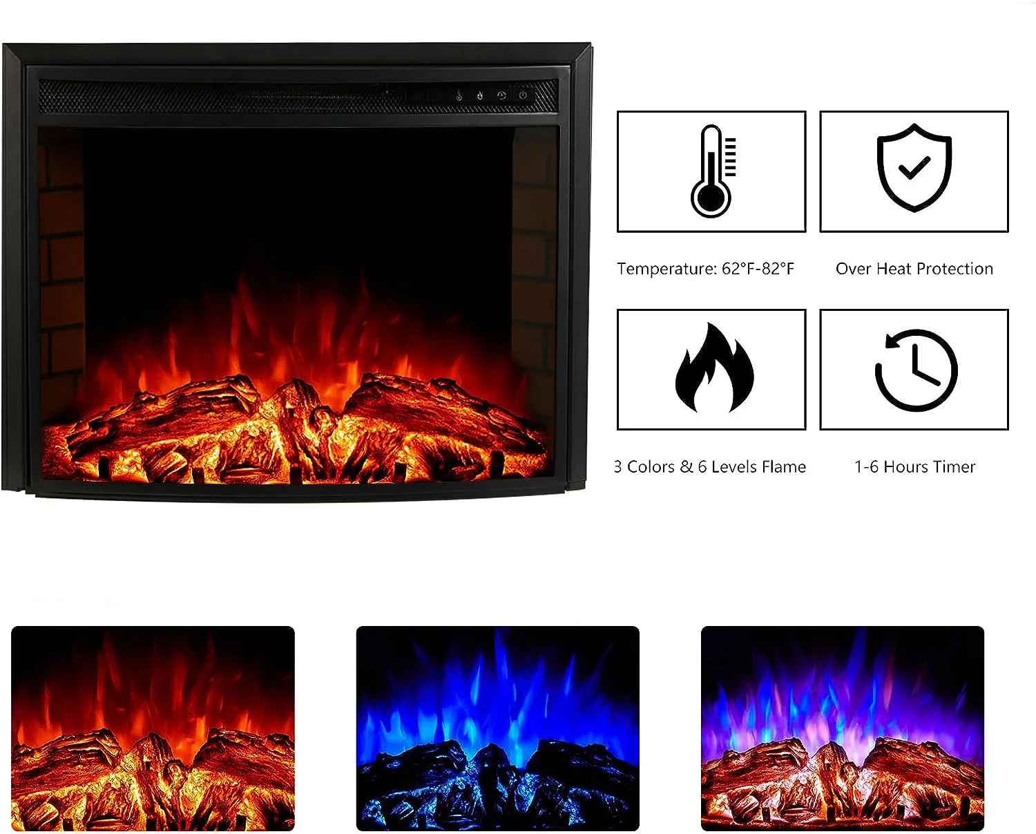 - 26" Curved Glass Fireplace: Lifelike 3D logs/rustic red brick walls/3 flame colors/6 levels dimmer.