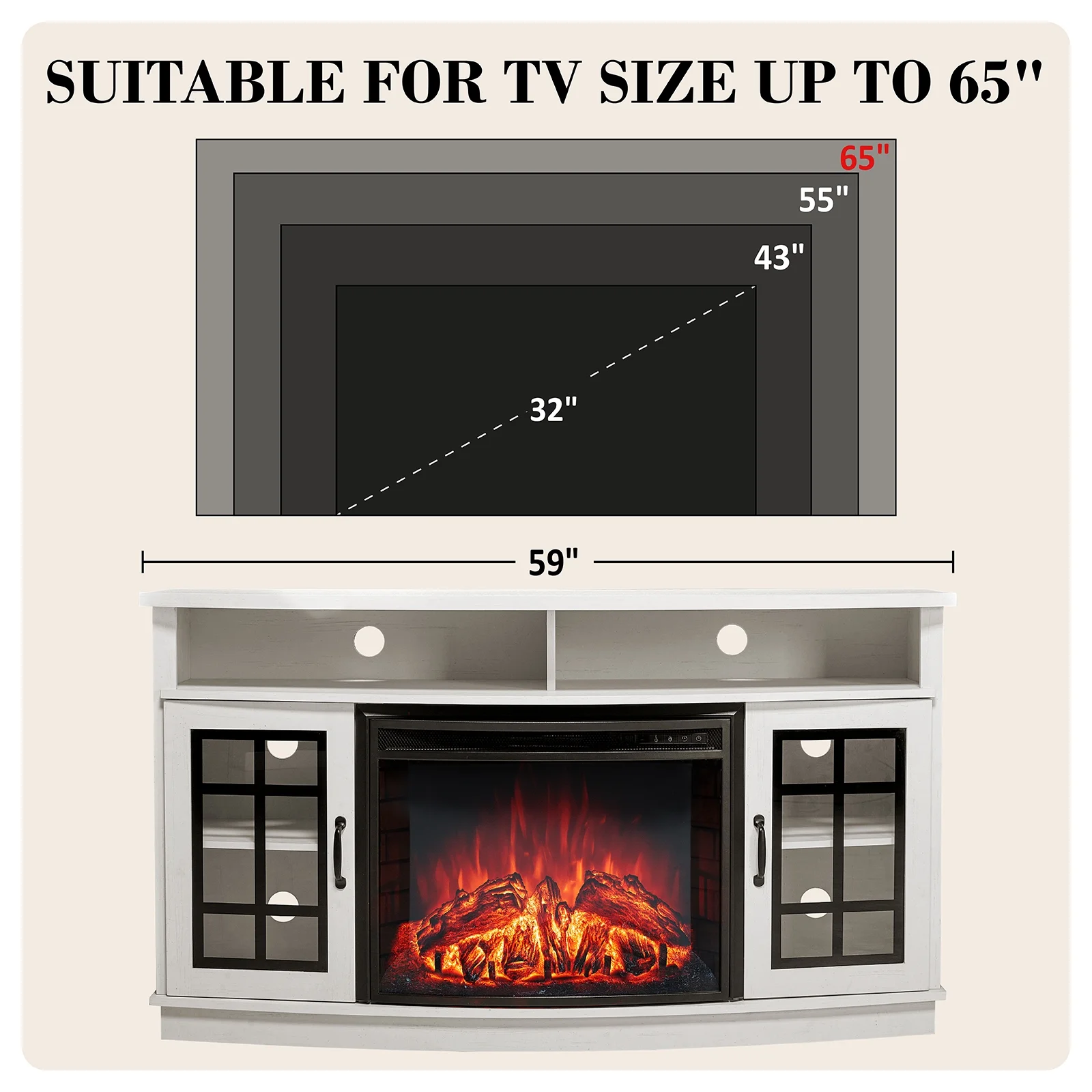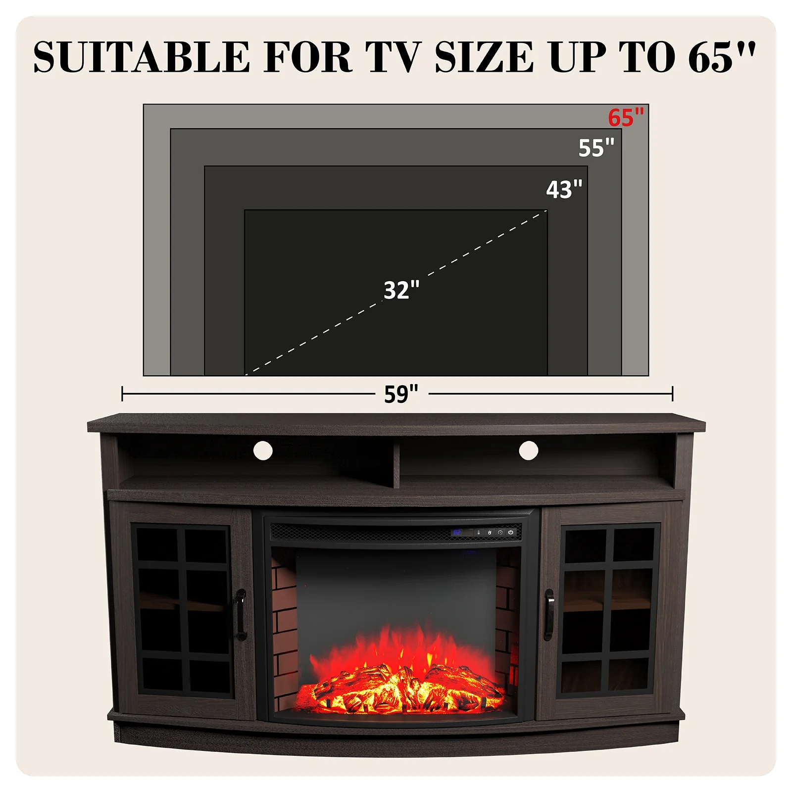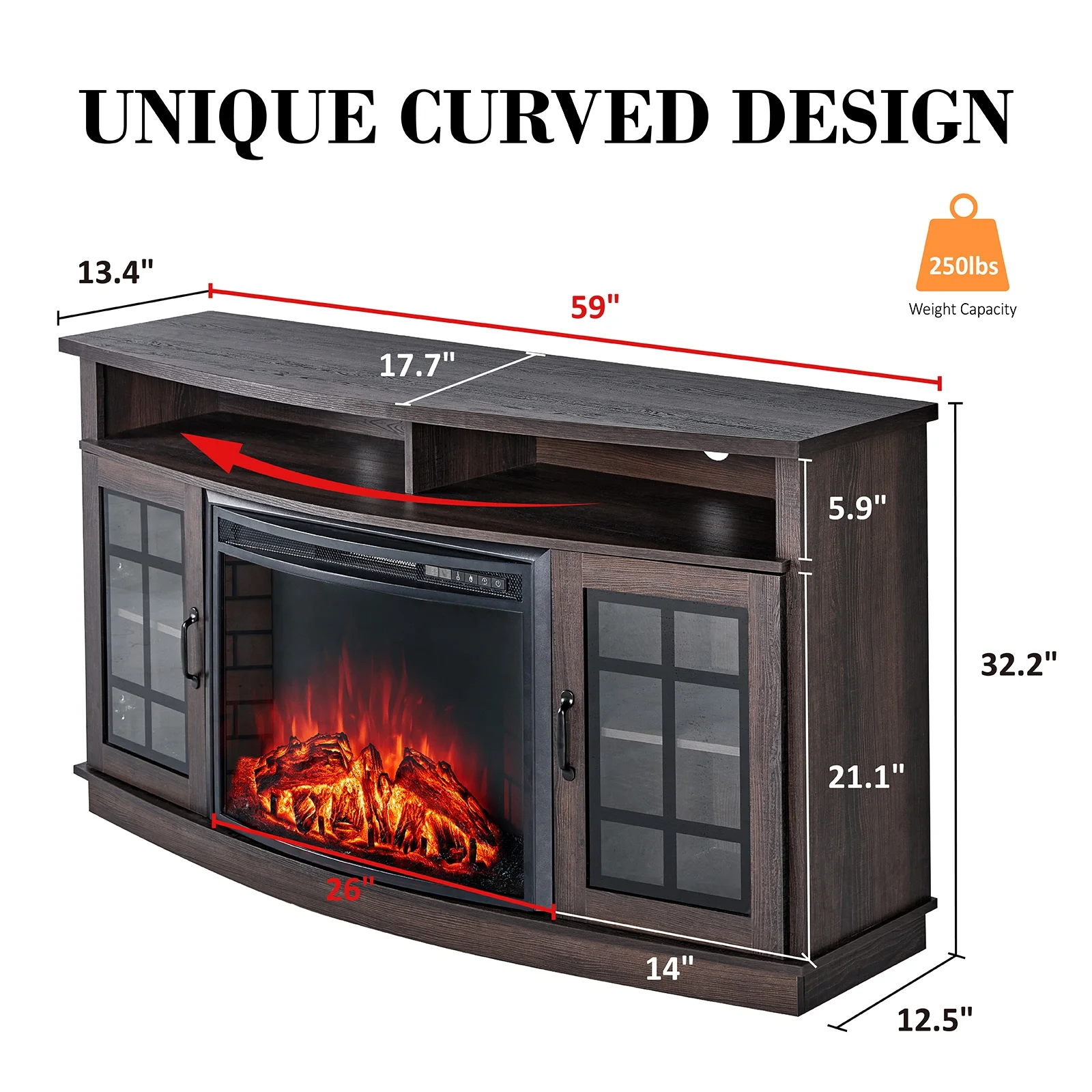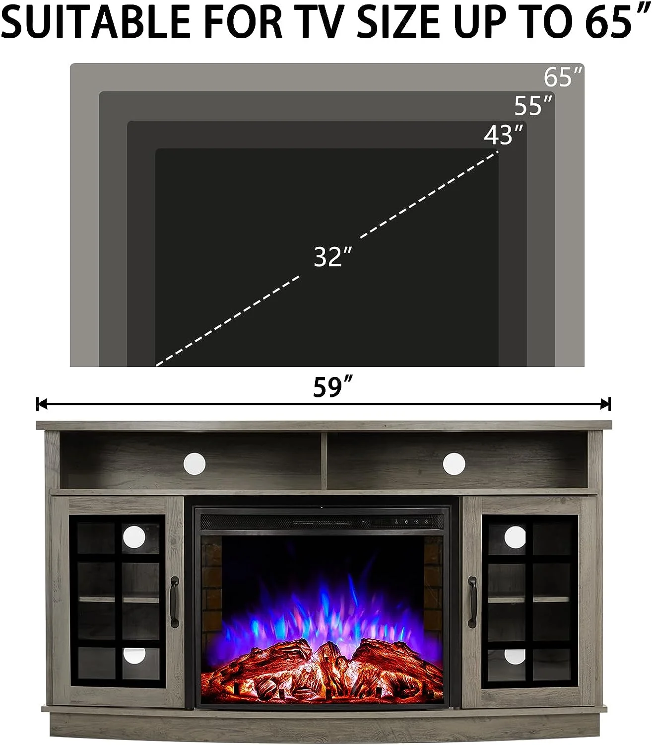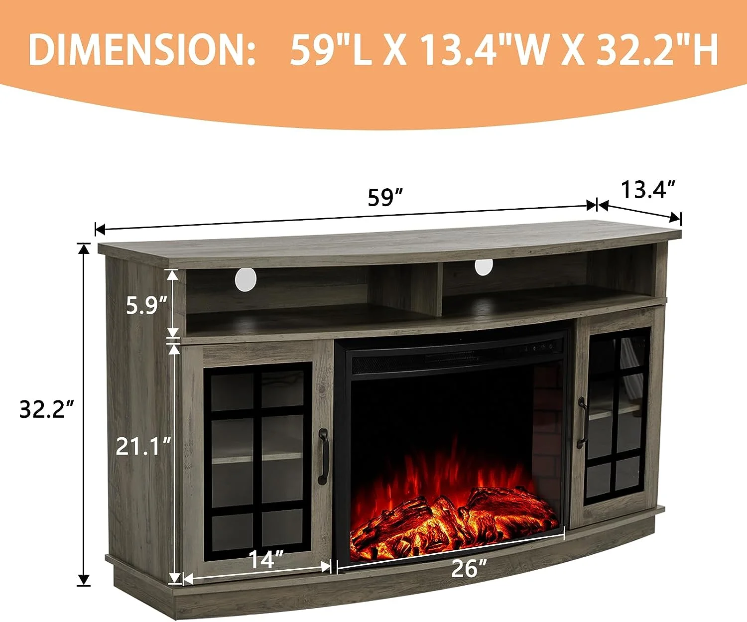 - Size: 59"(W) x 32.2"(H) x 17.7"(D). Electric Fireplace Dimensions: 26"(W) x 21.26"(H)