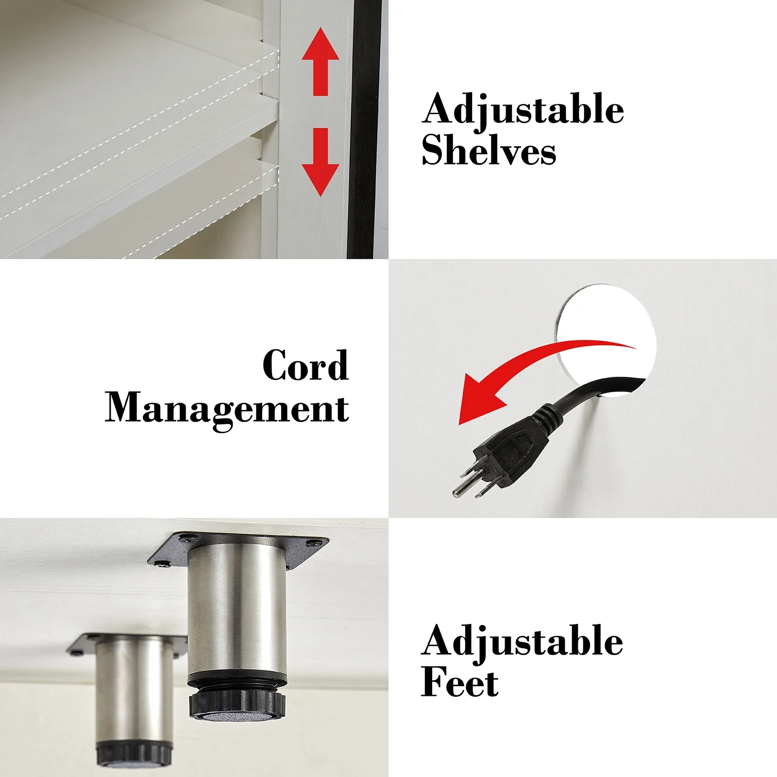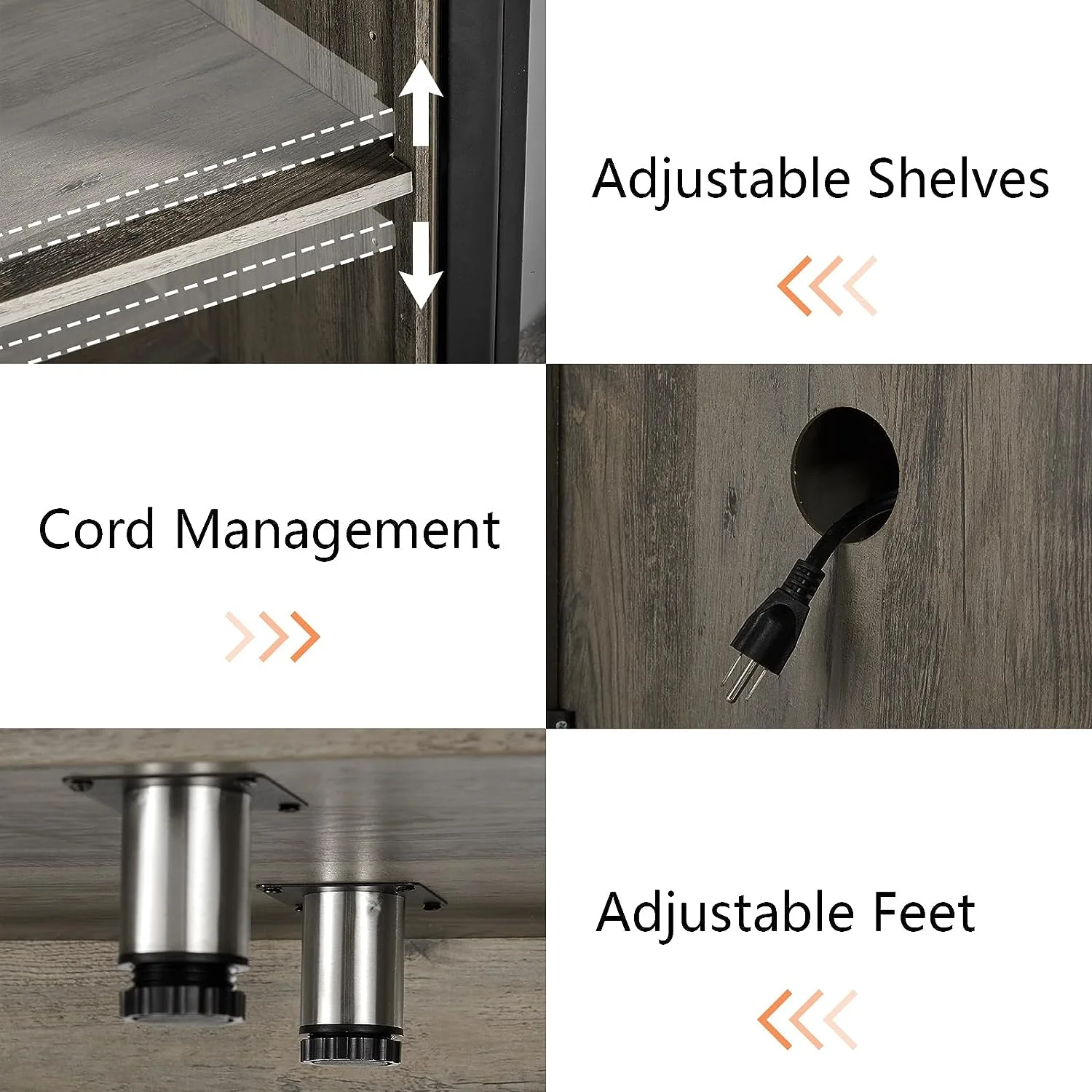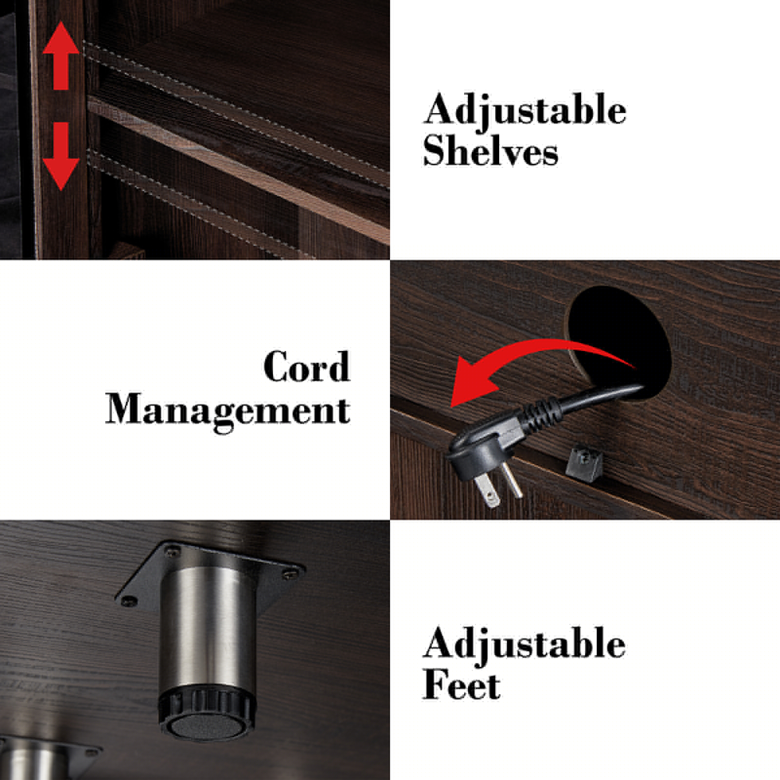 - Storage Space: Larger tabletop and open storage shelves, 2 closed cabinets with adjustable shelves.