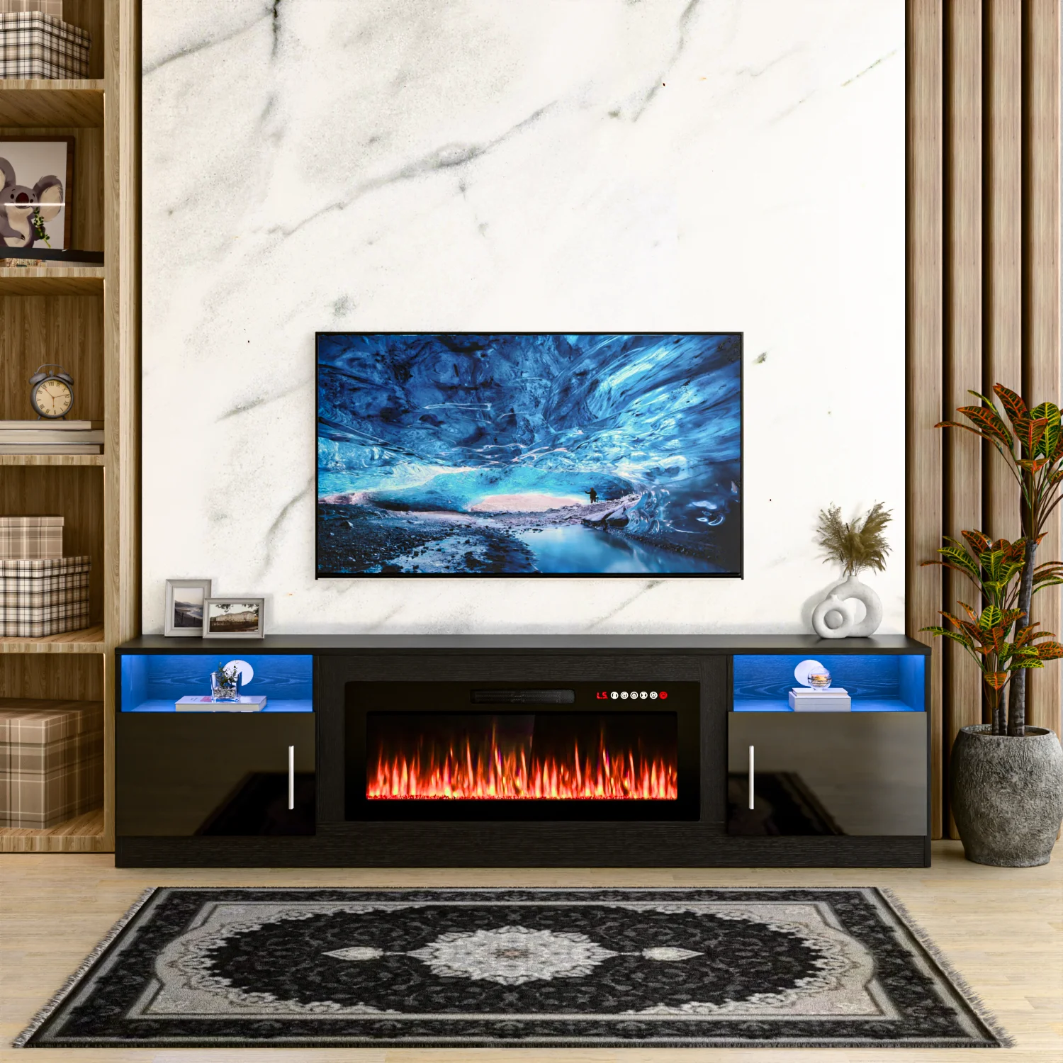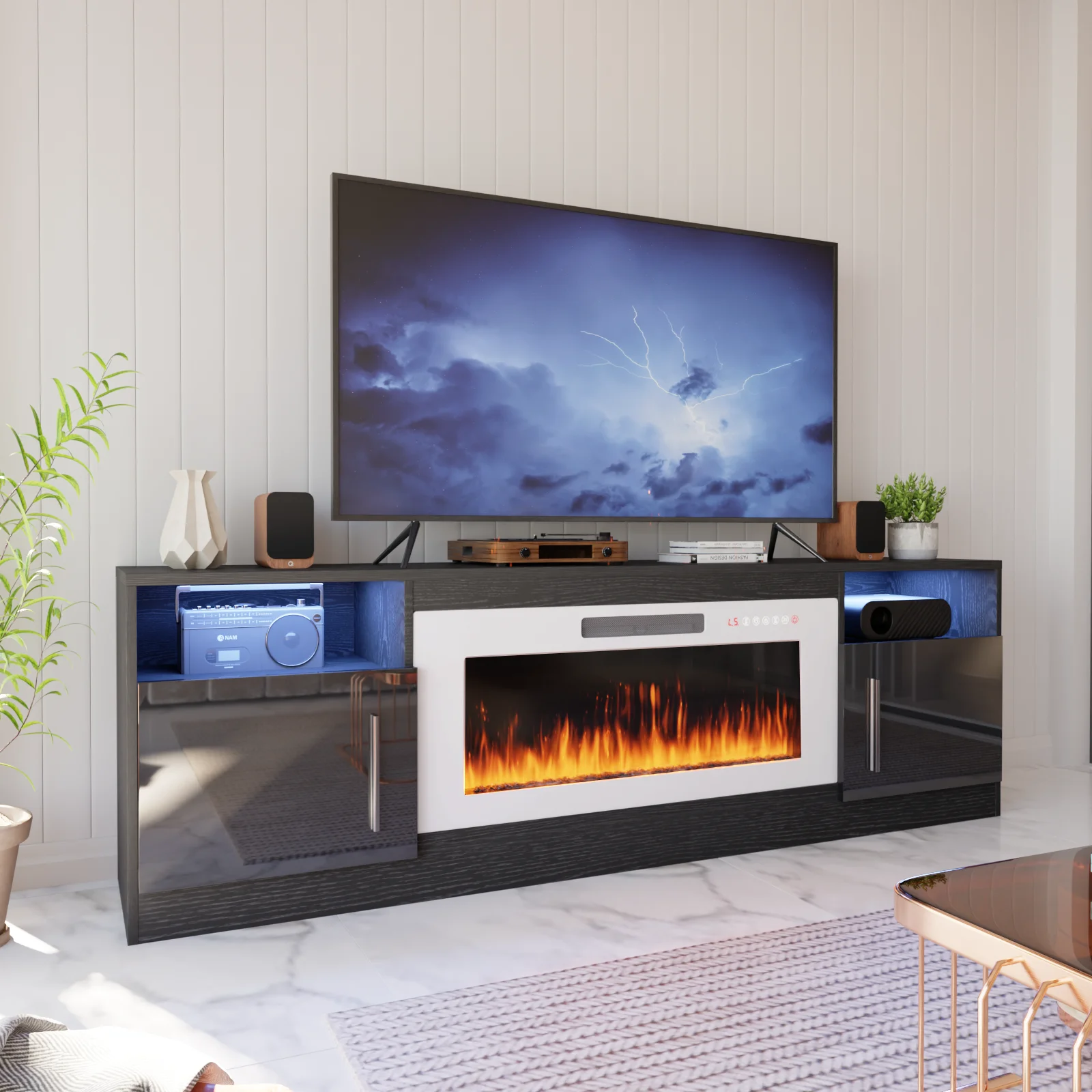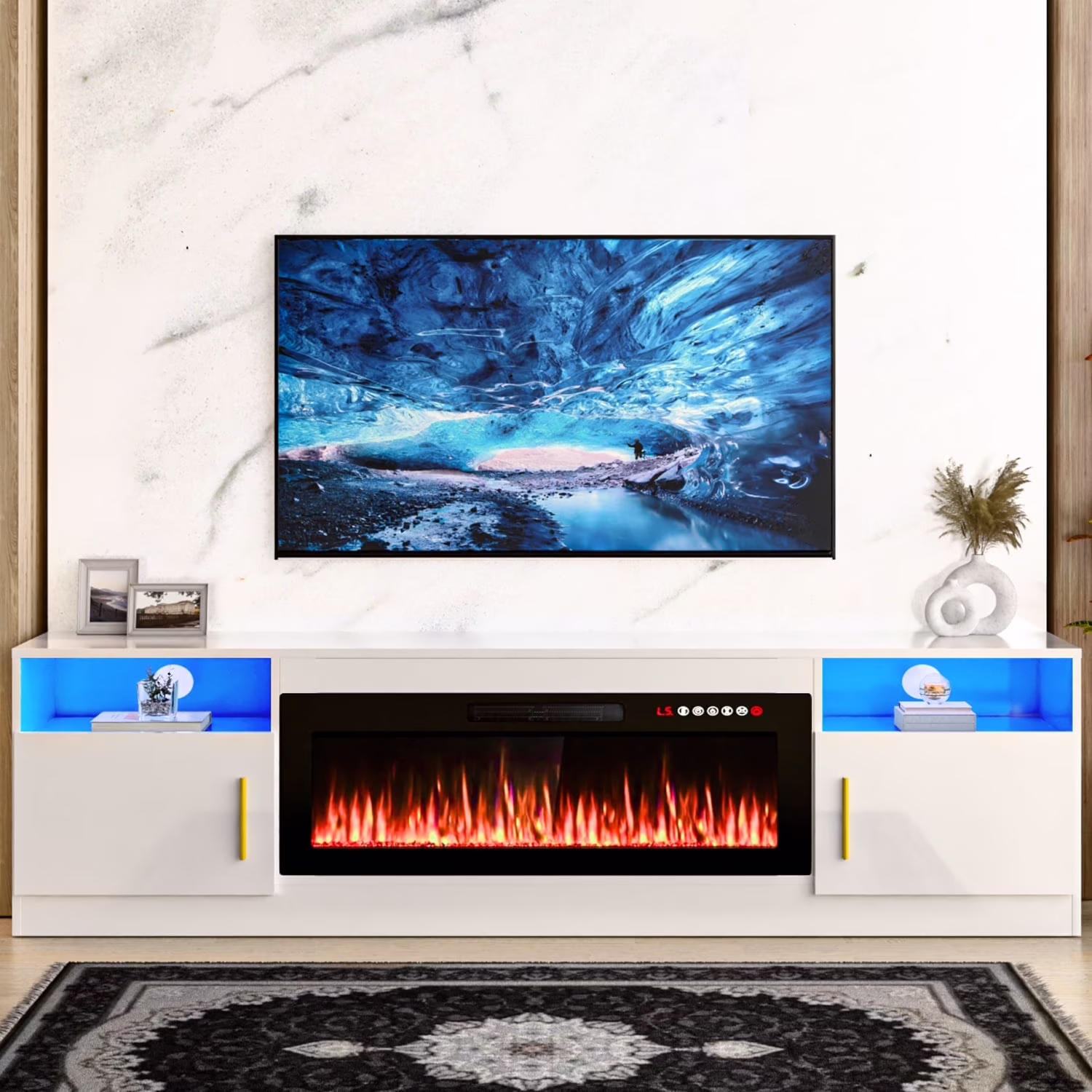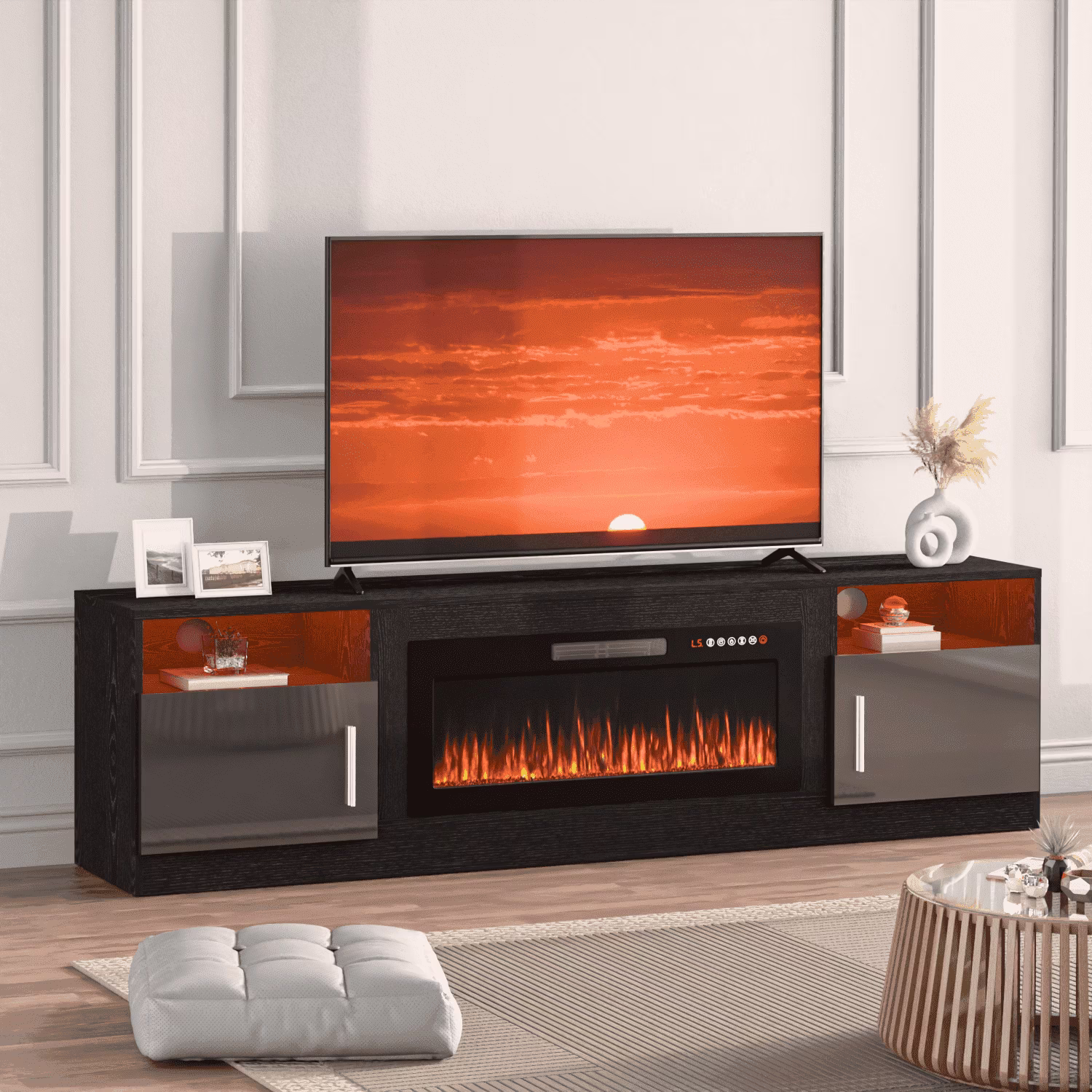 - Open shelves and side cabinets provide ample storage for electronics and decor