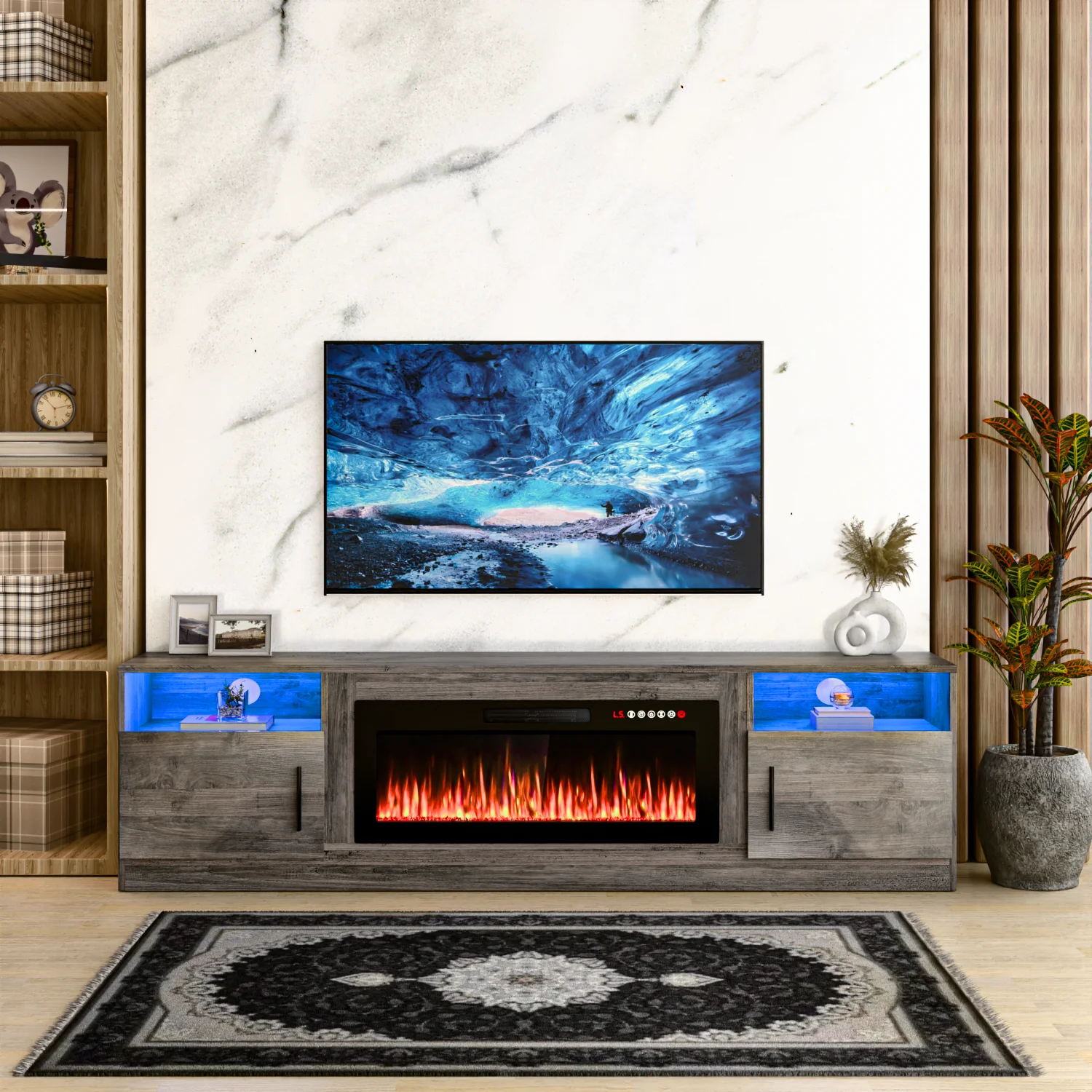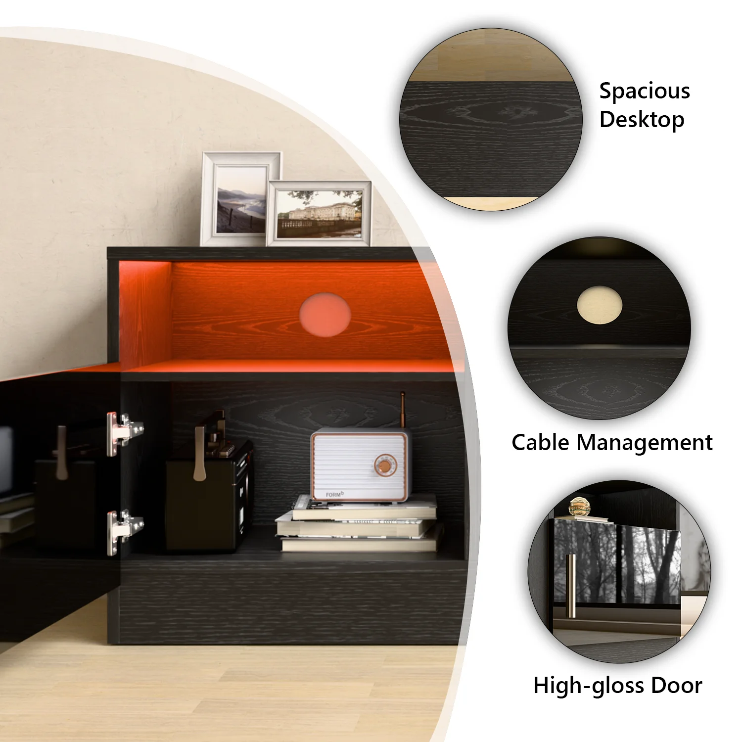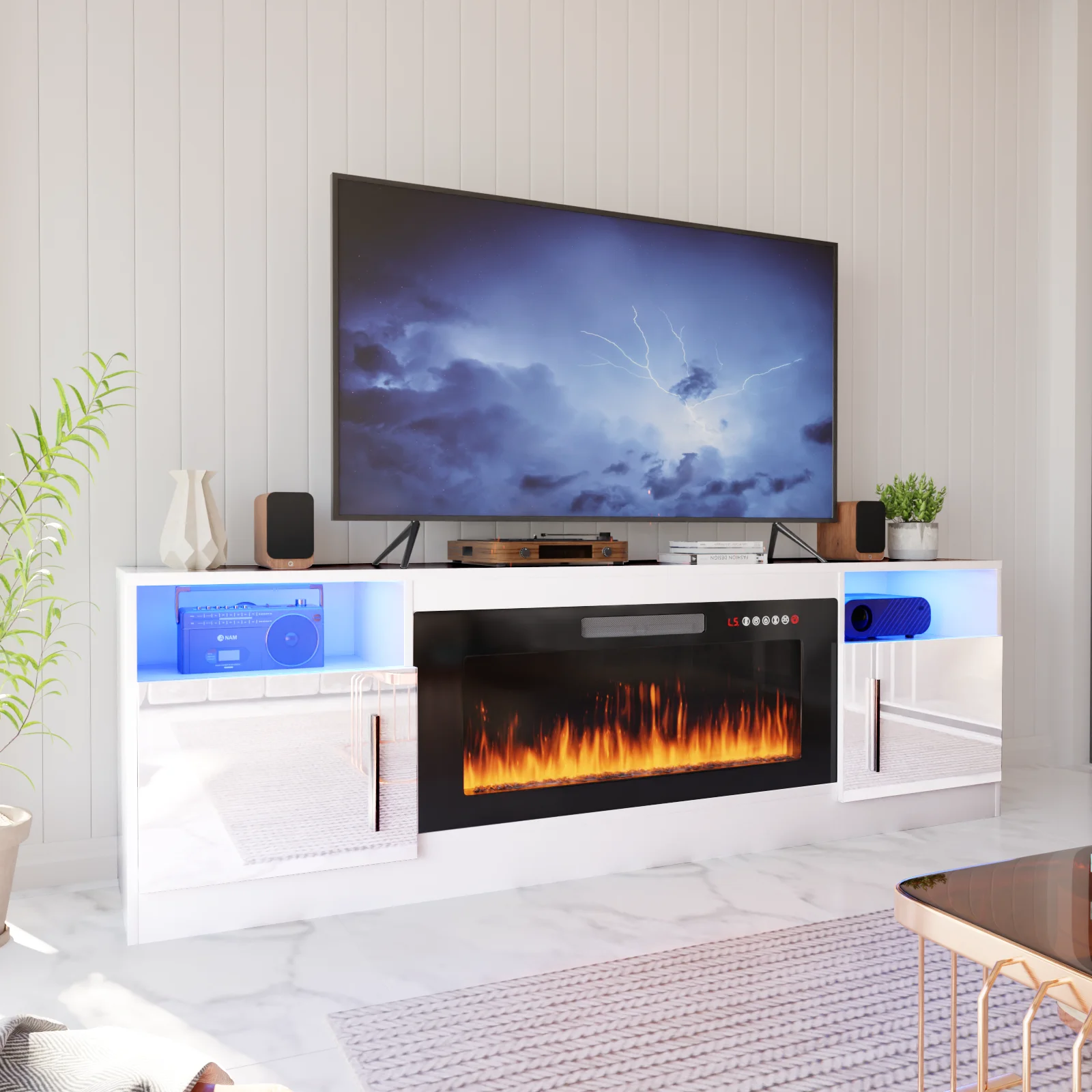 - Open shelves and side cabinets provide ample storage for electronics and decor