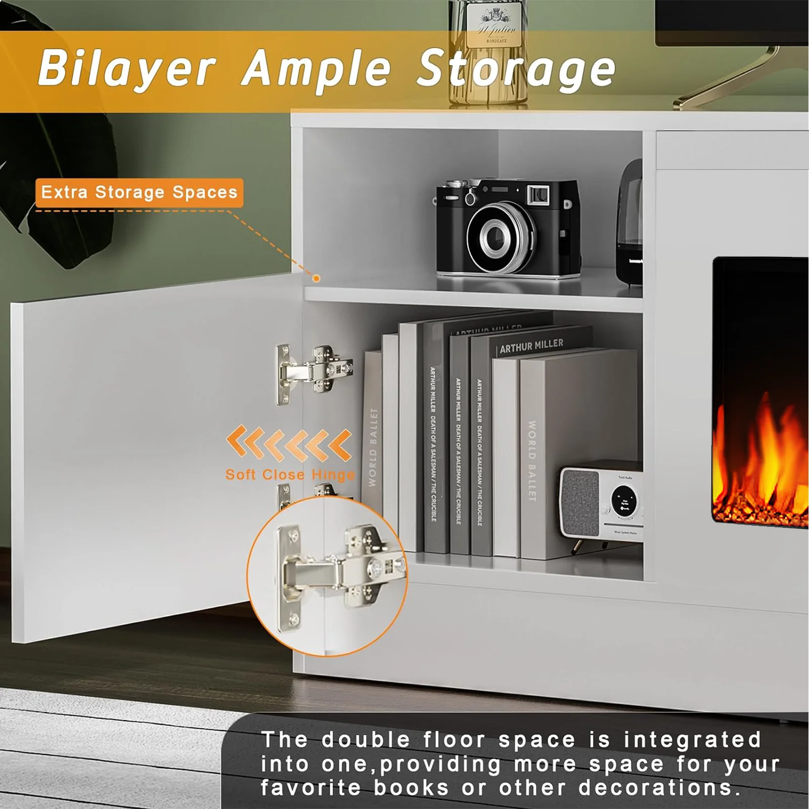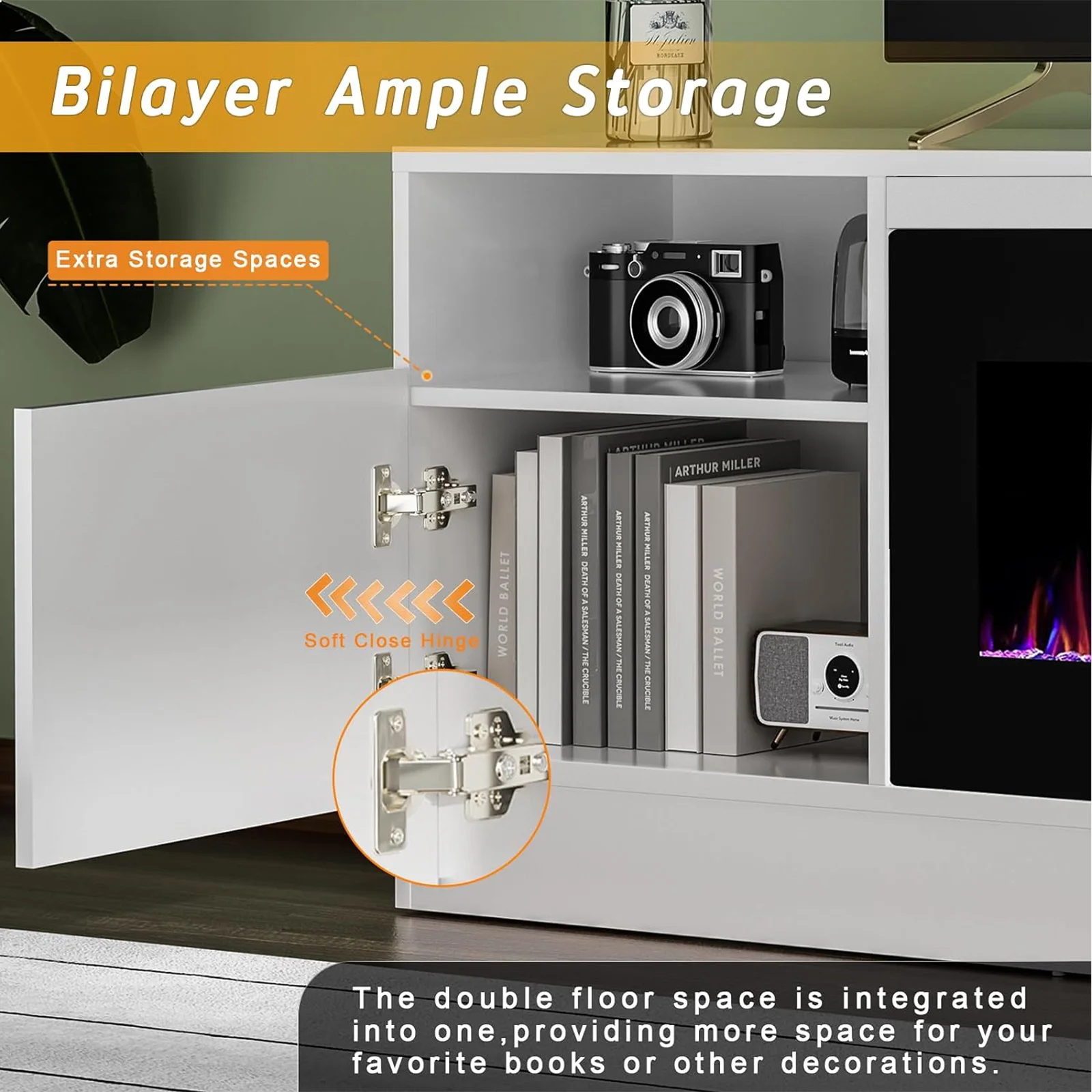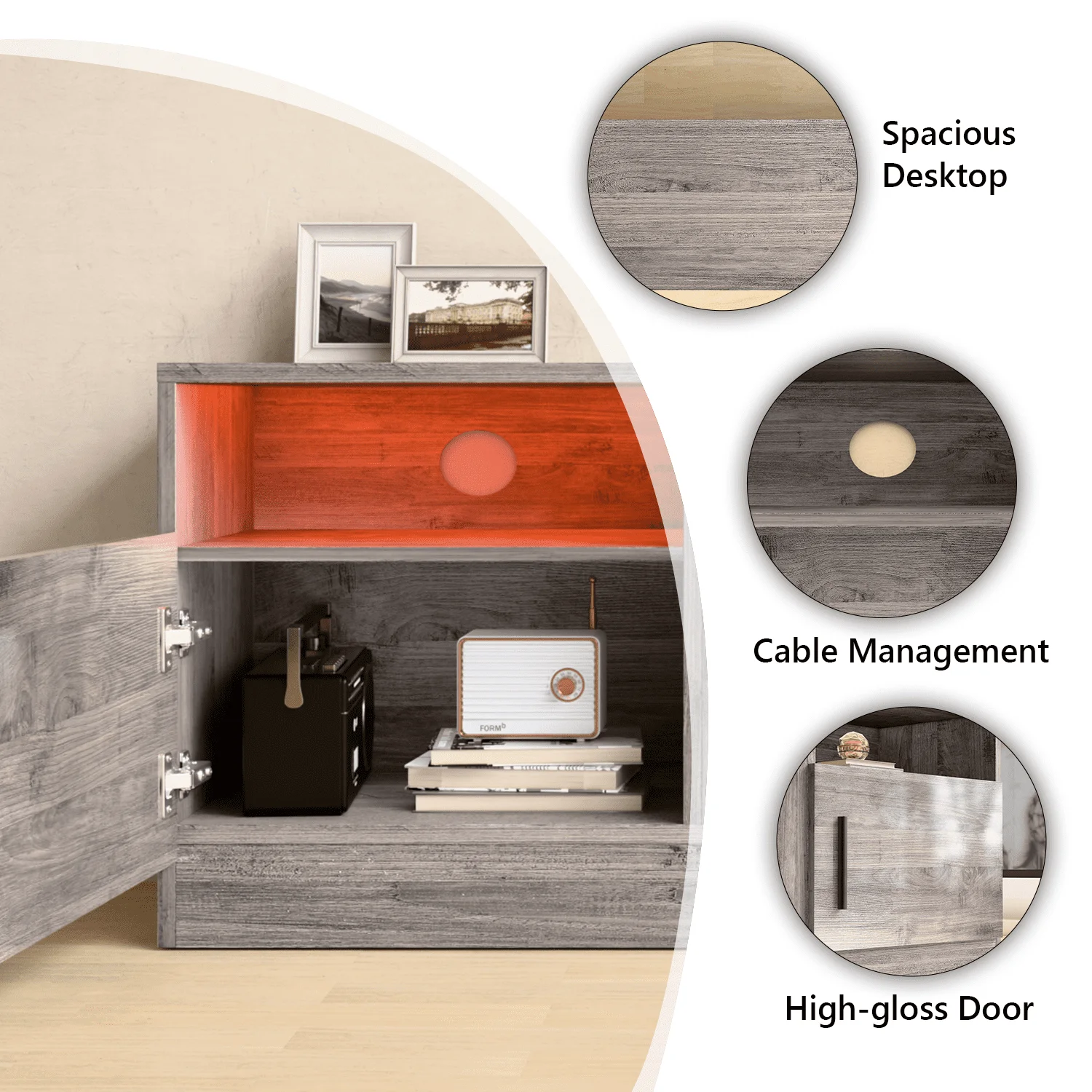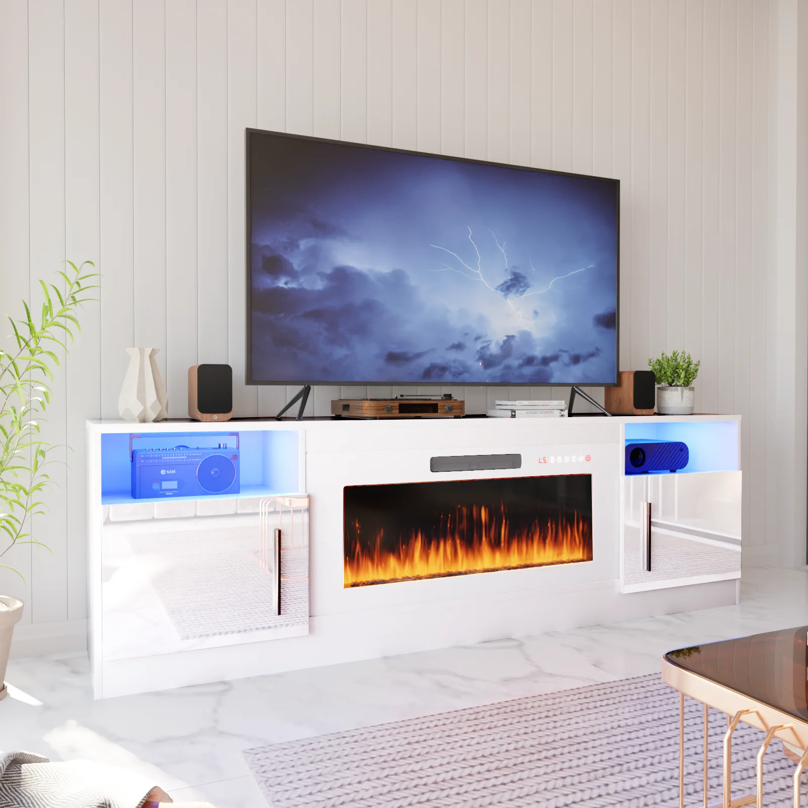 - Open shelves and side cabinets provide ample storage for electronics and decor