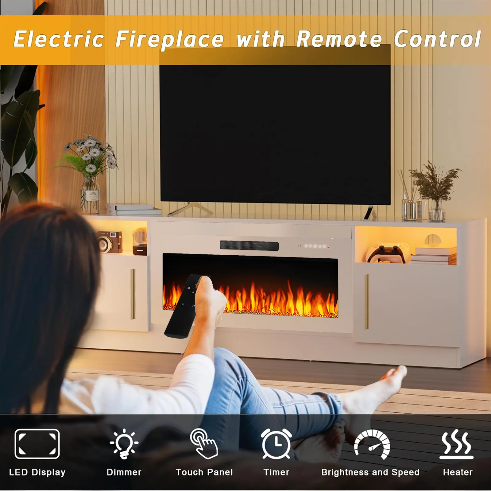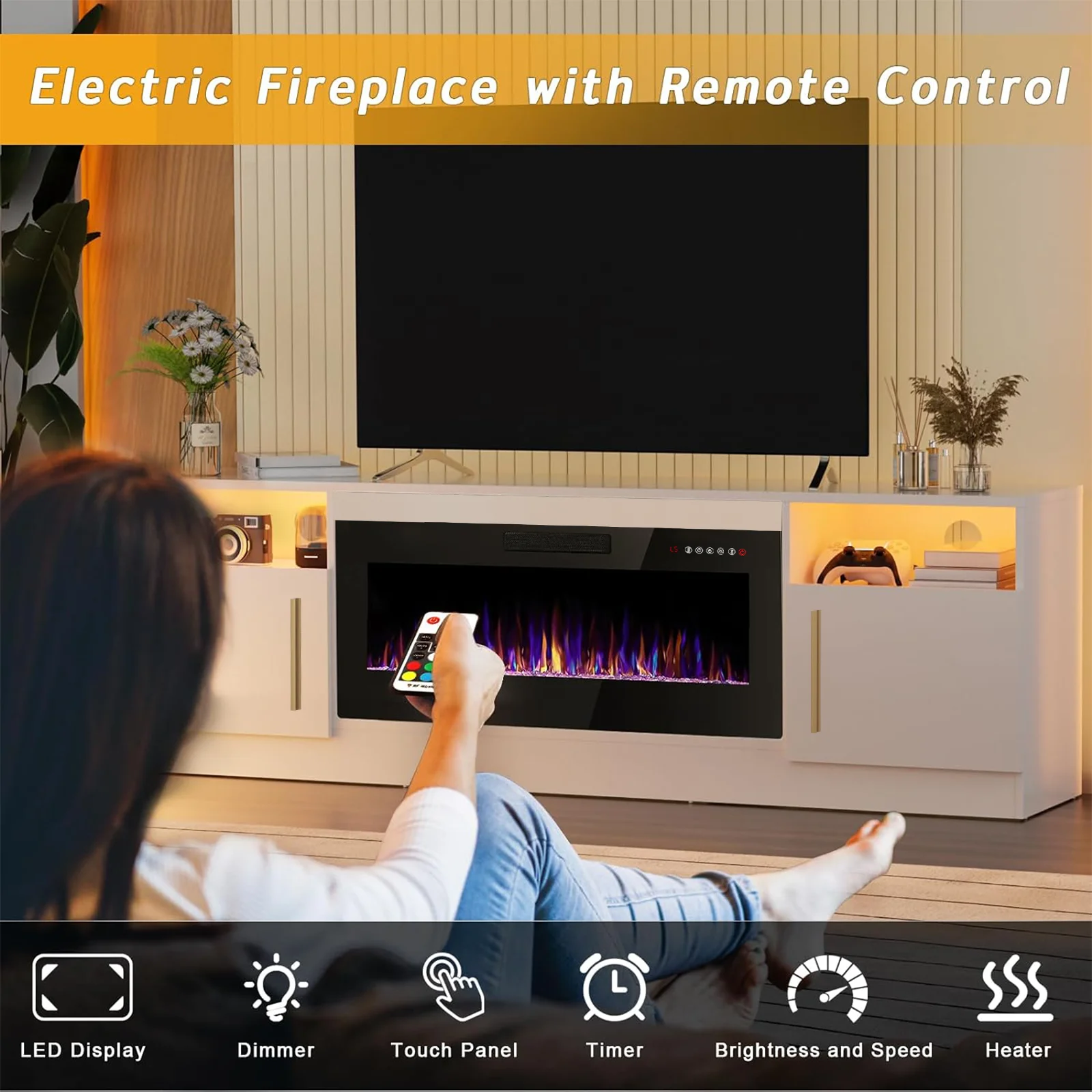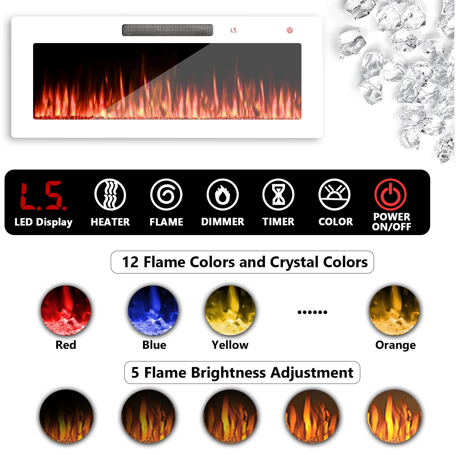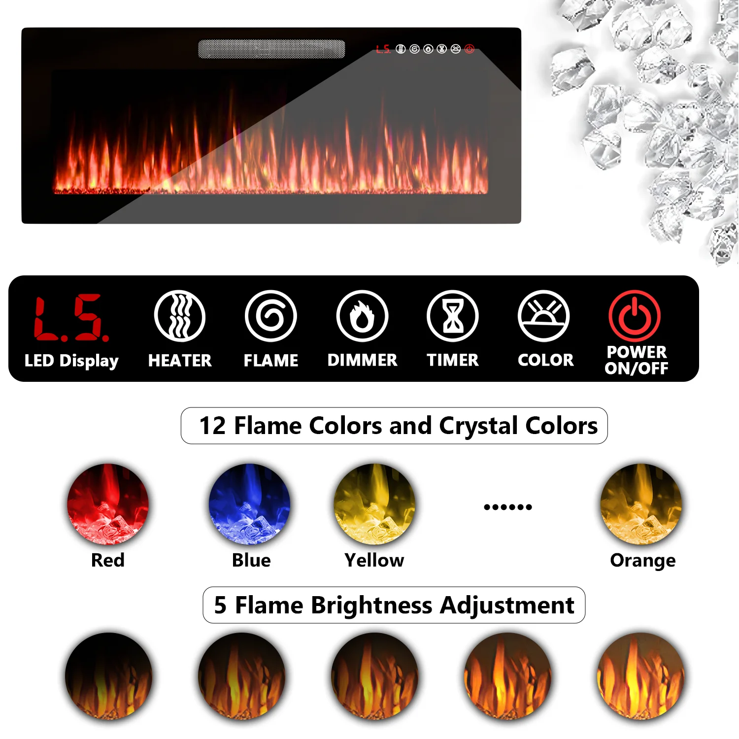 - 36-inch electric fireplace with adjustable flame color and brightness