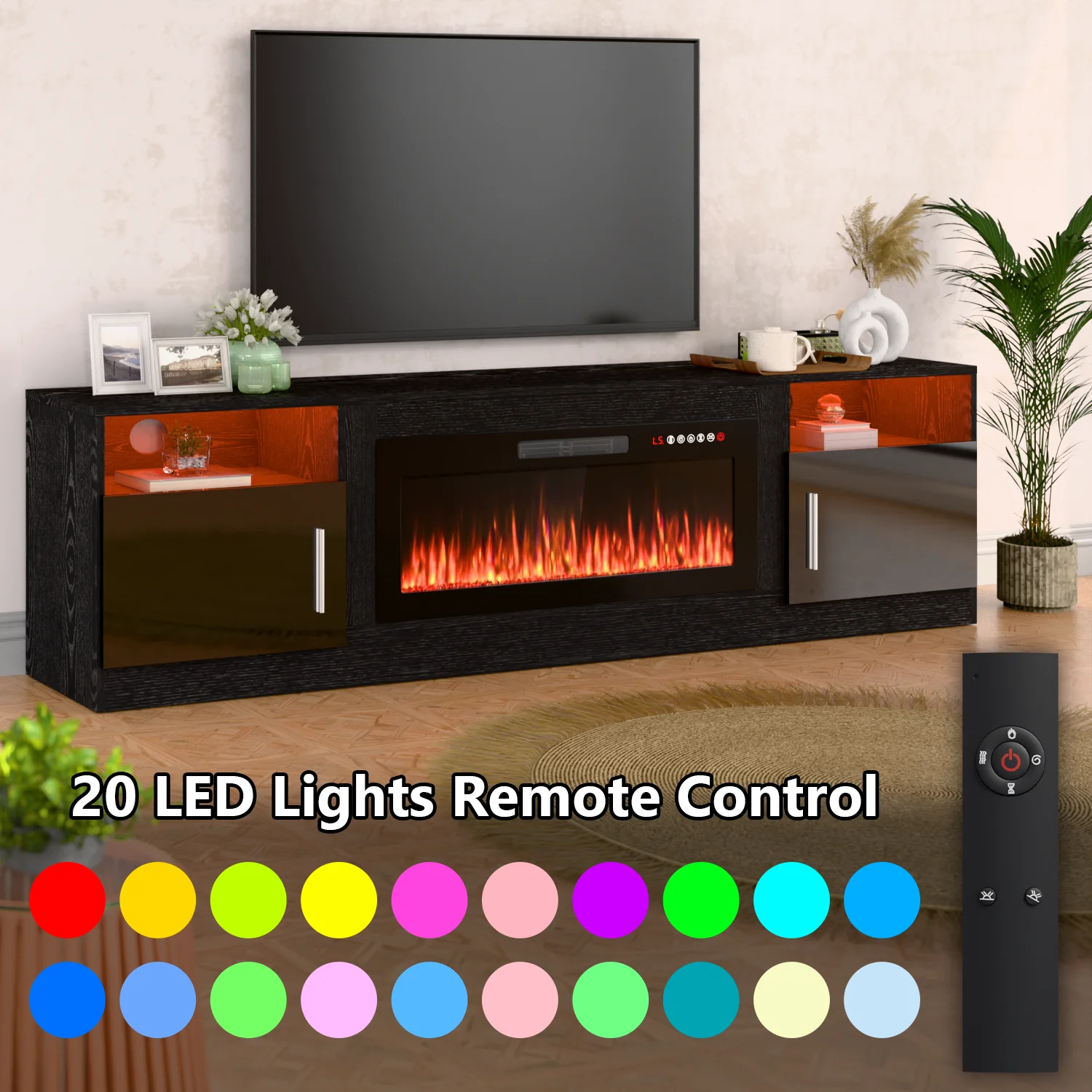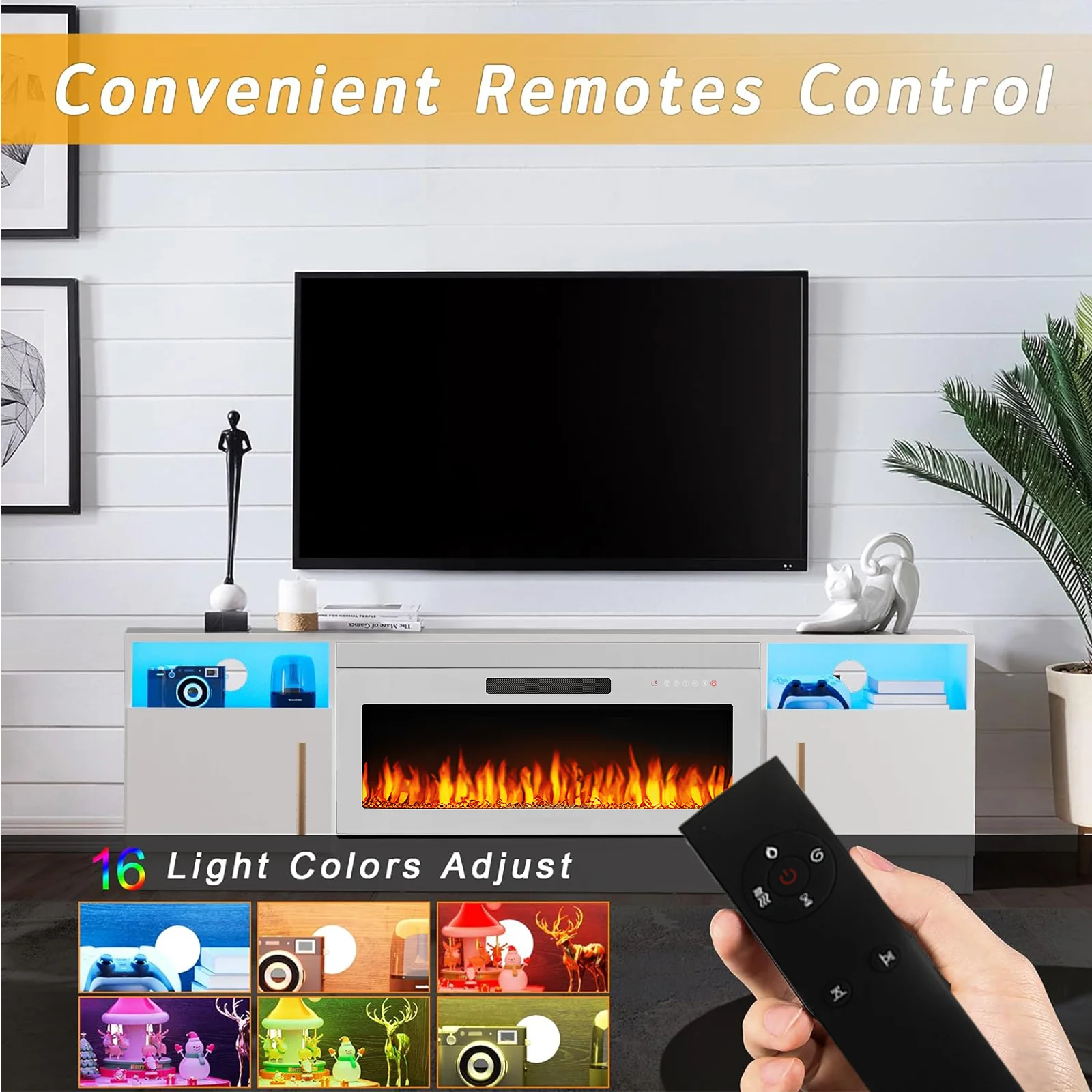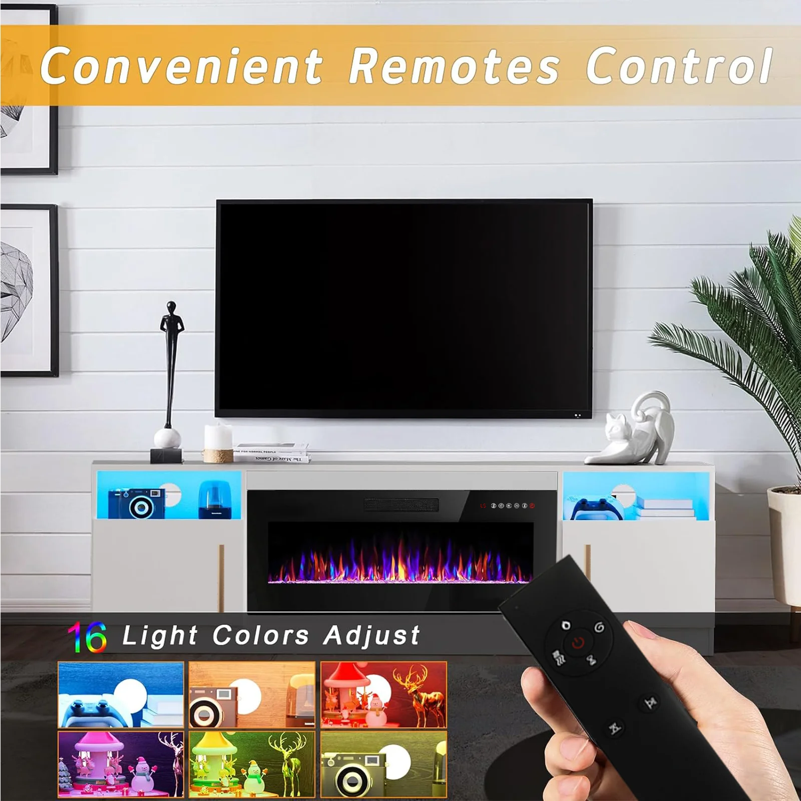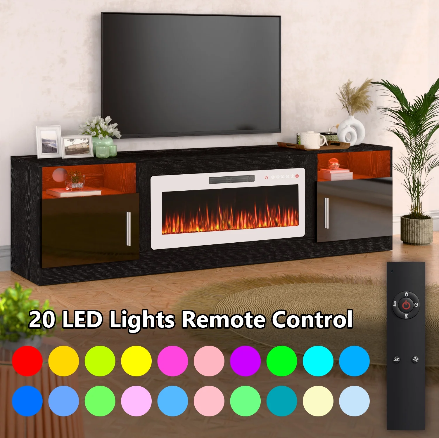 - 36-inch electric fireplace with adjustable flame color and brightness