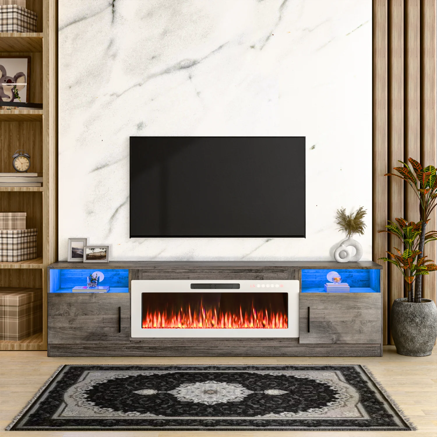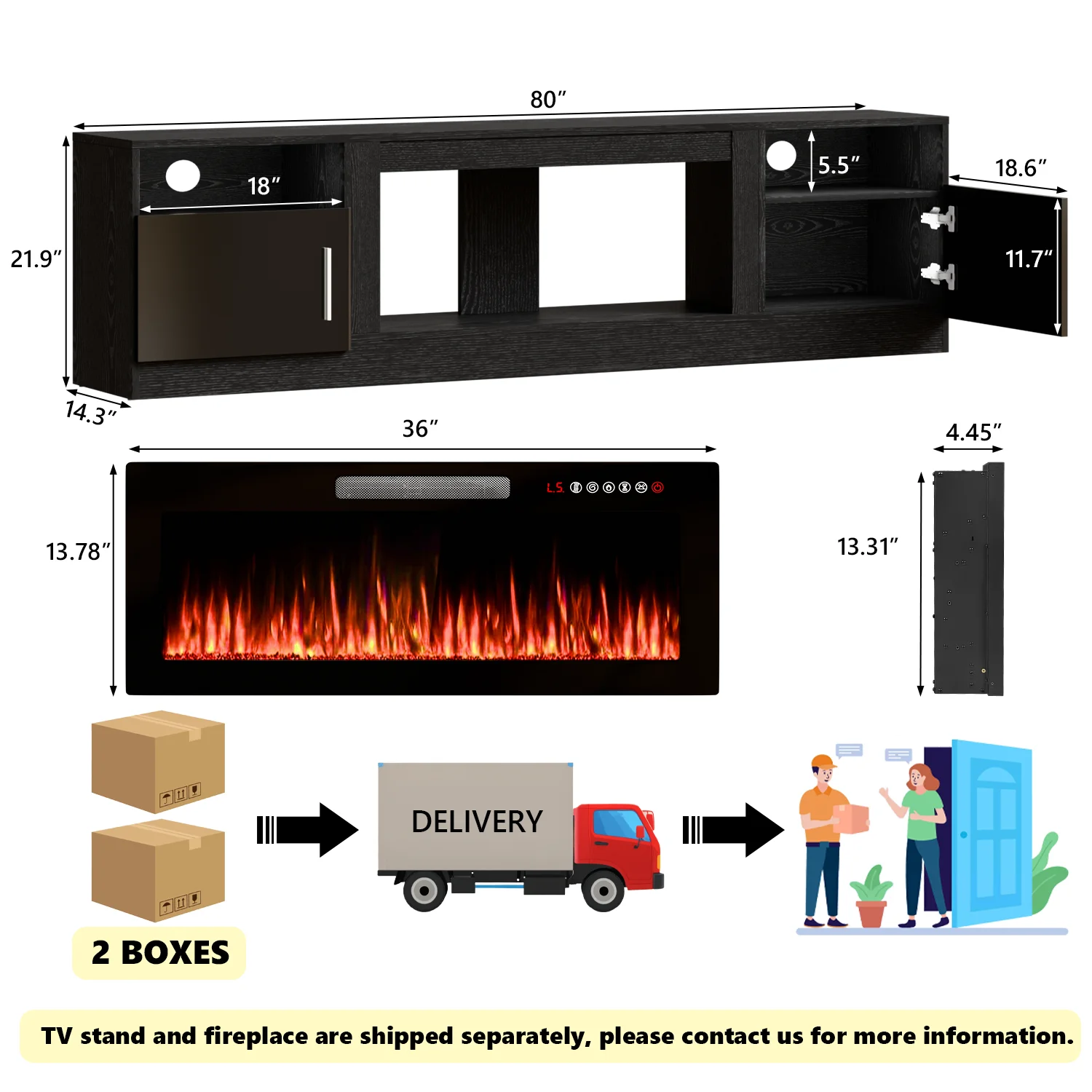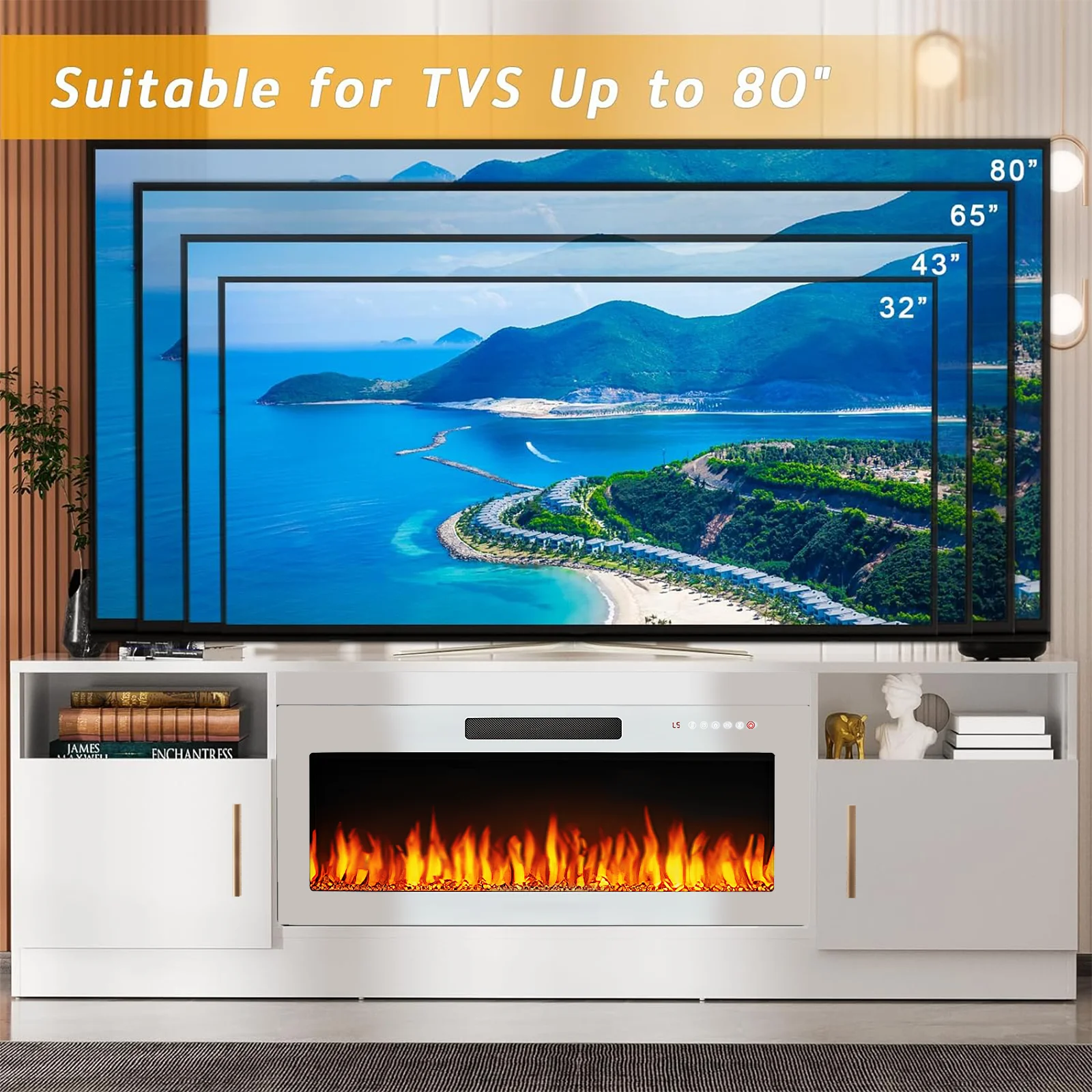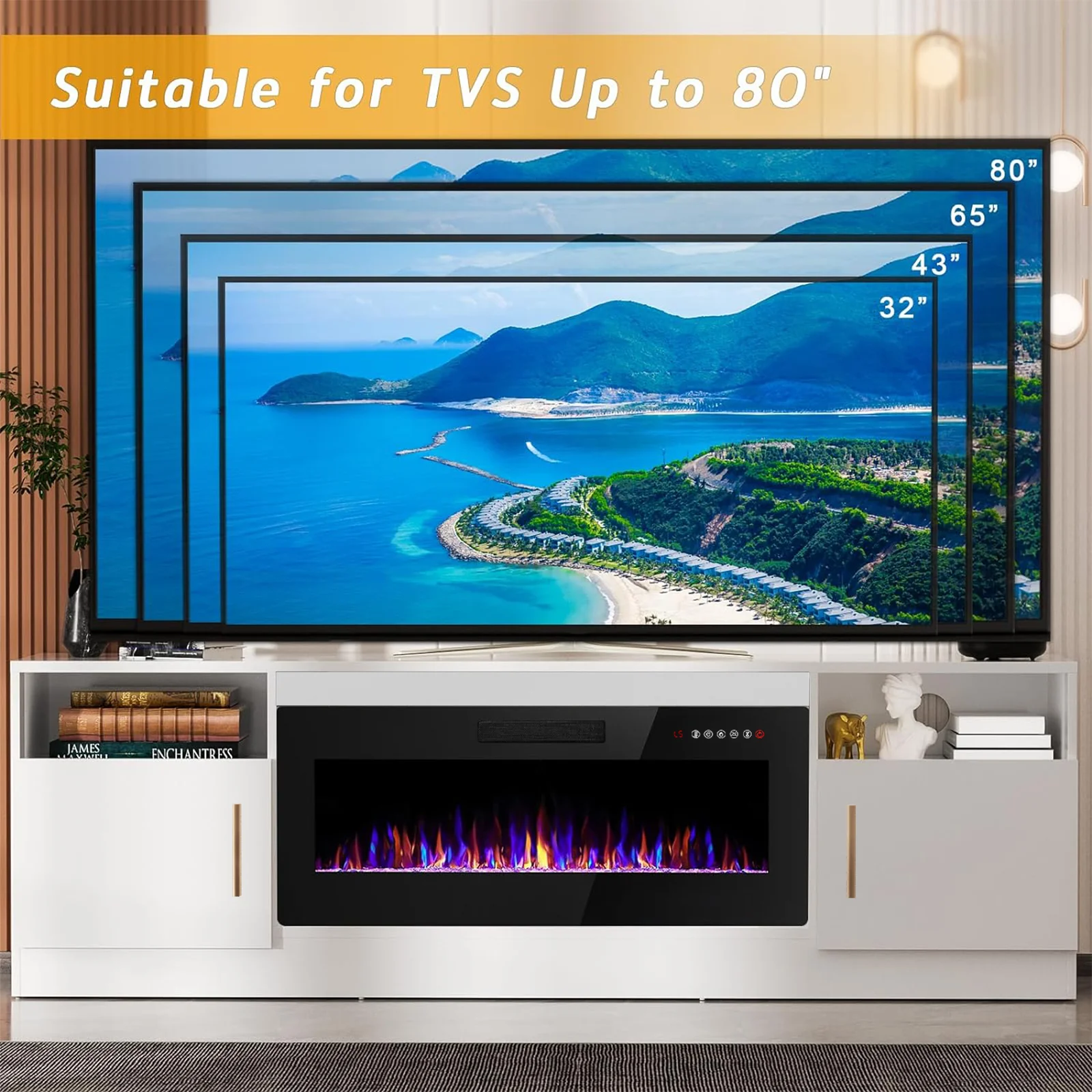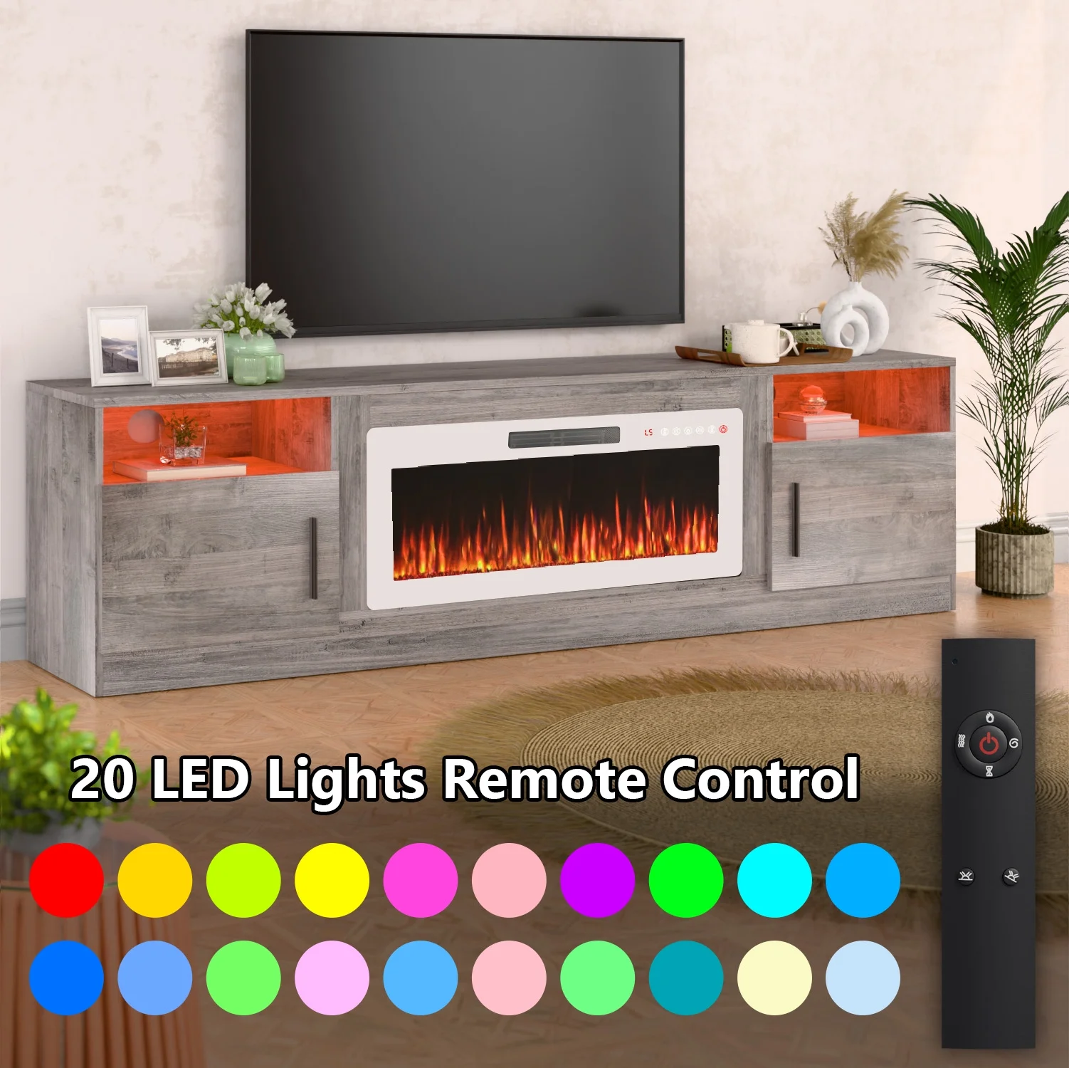 - 36-inch electric fireplace with adjustable flame color and brightness