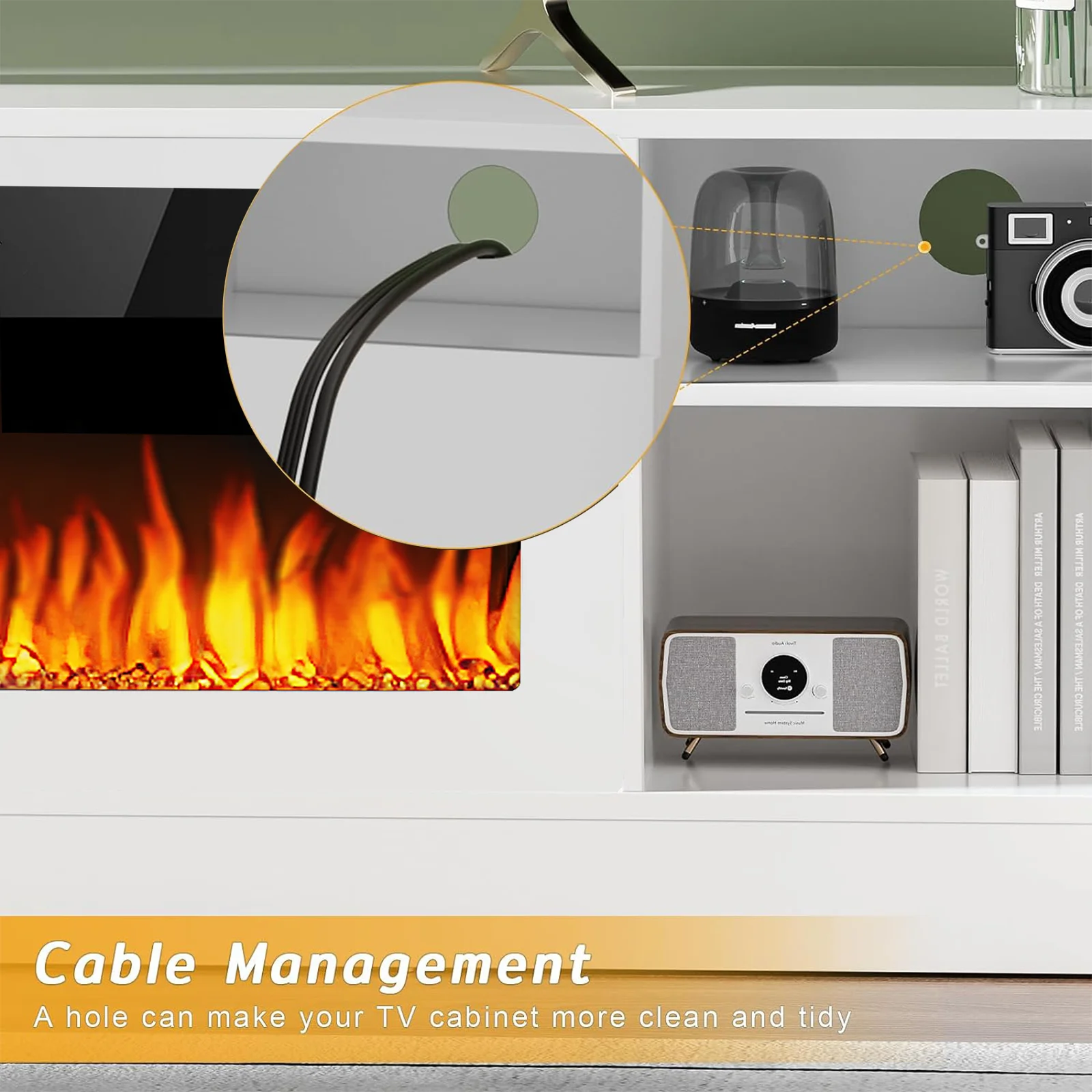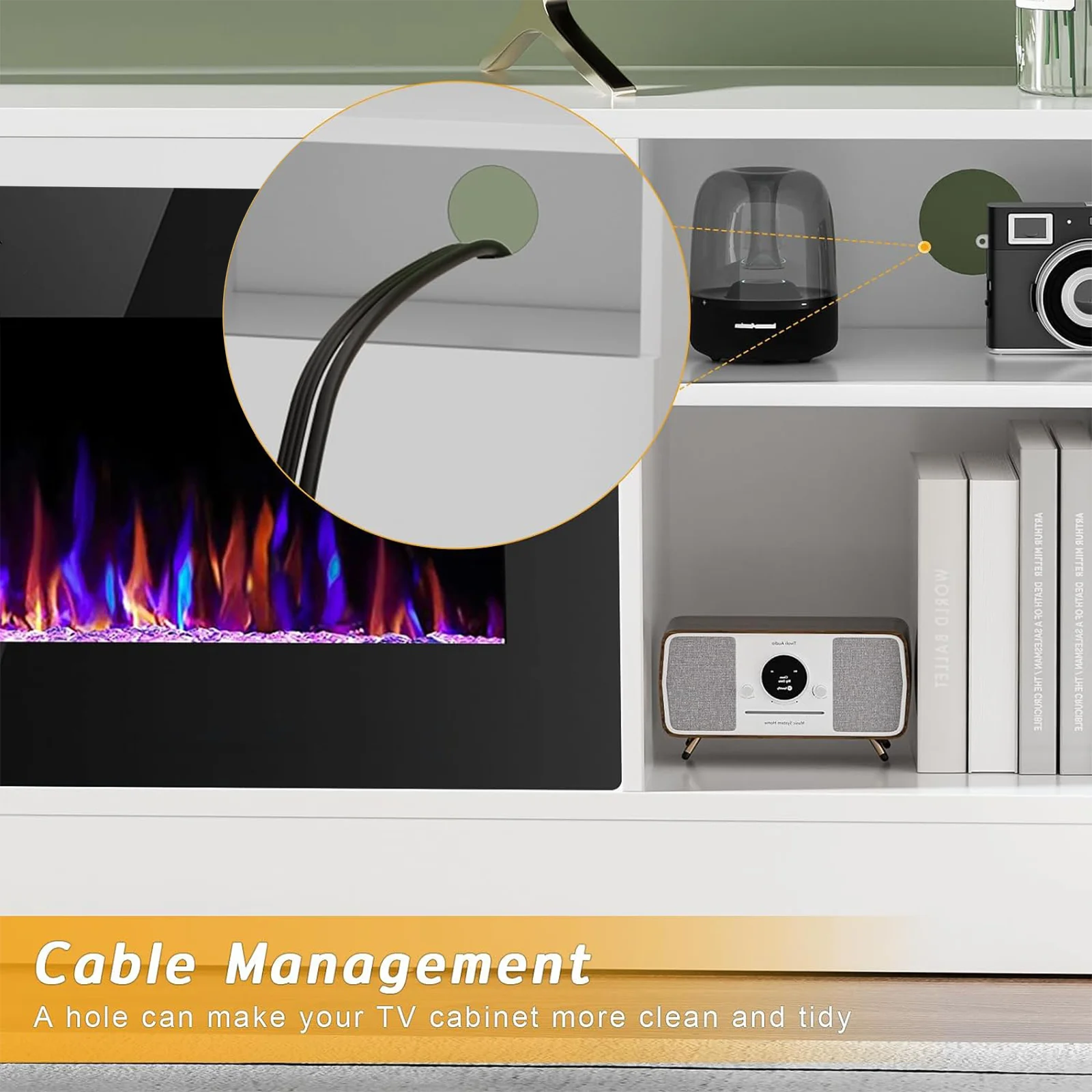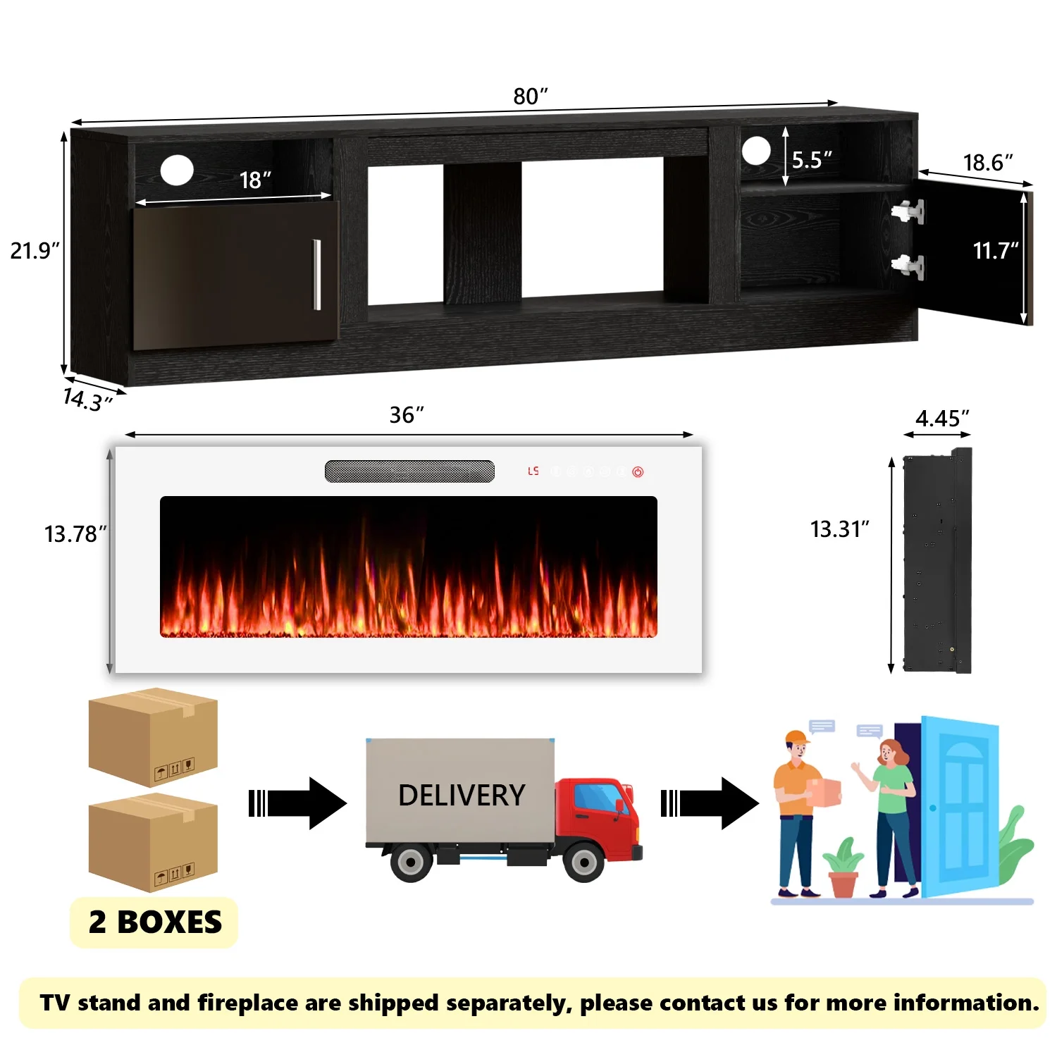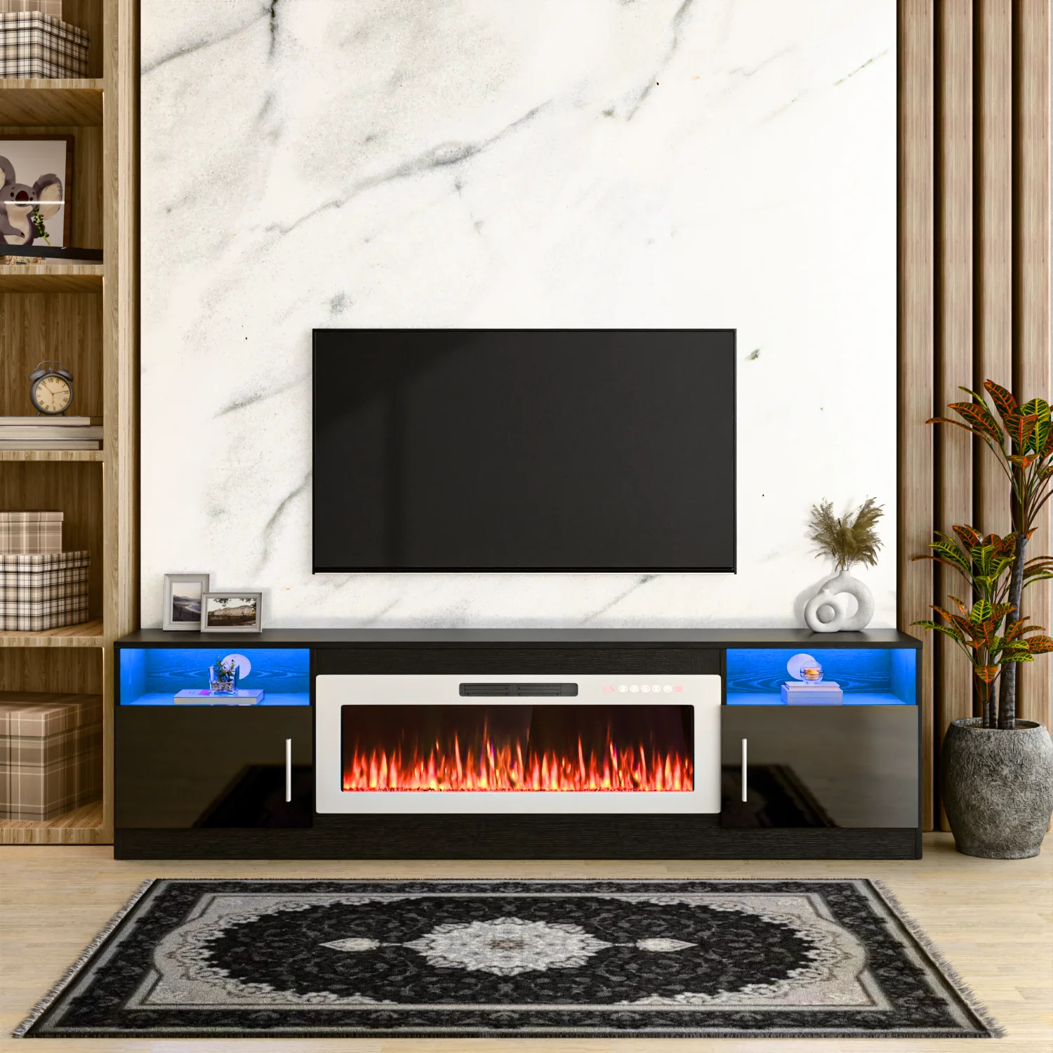 - 36-inch electric fireplace with adjustable flame color and brightness