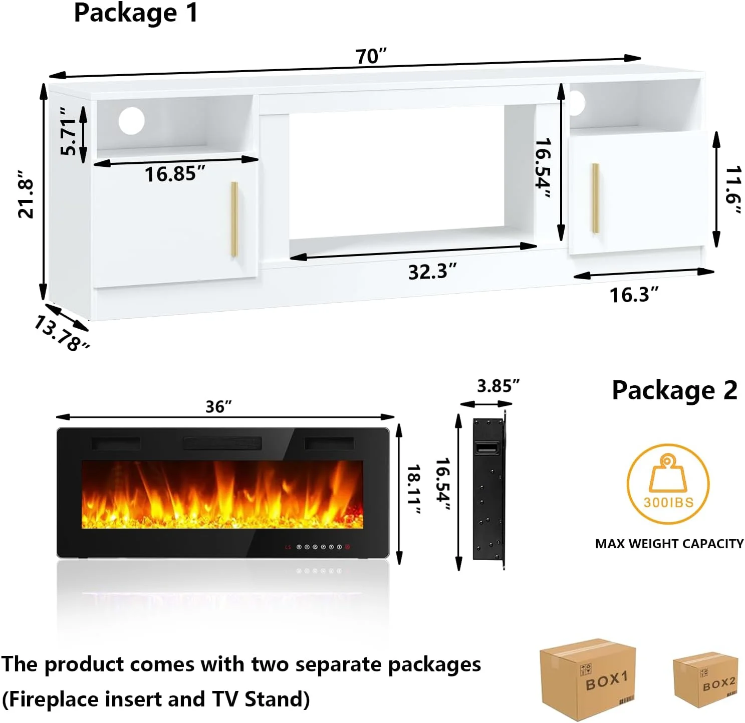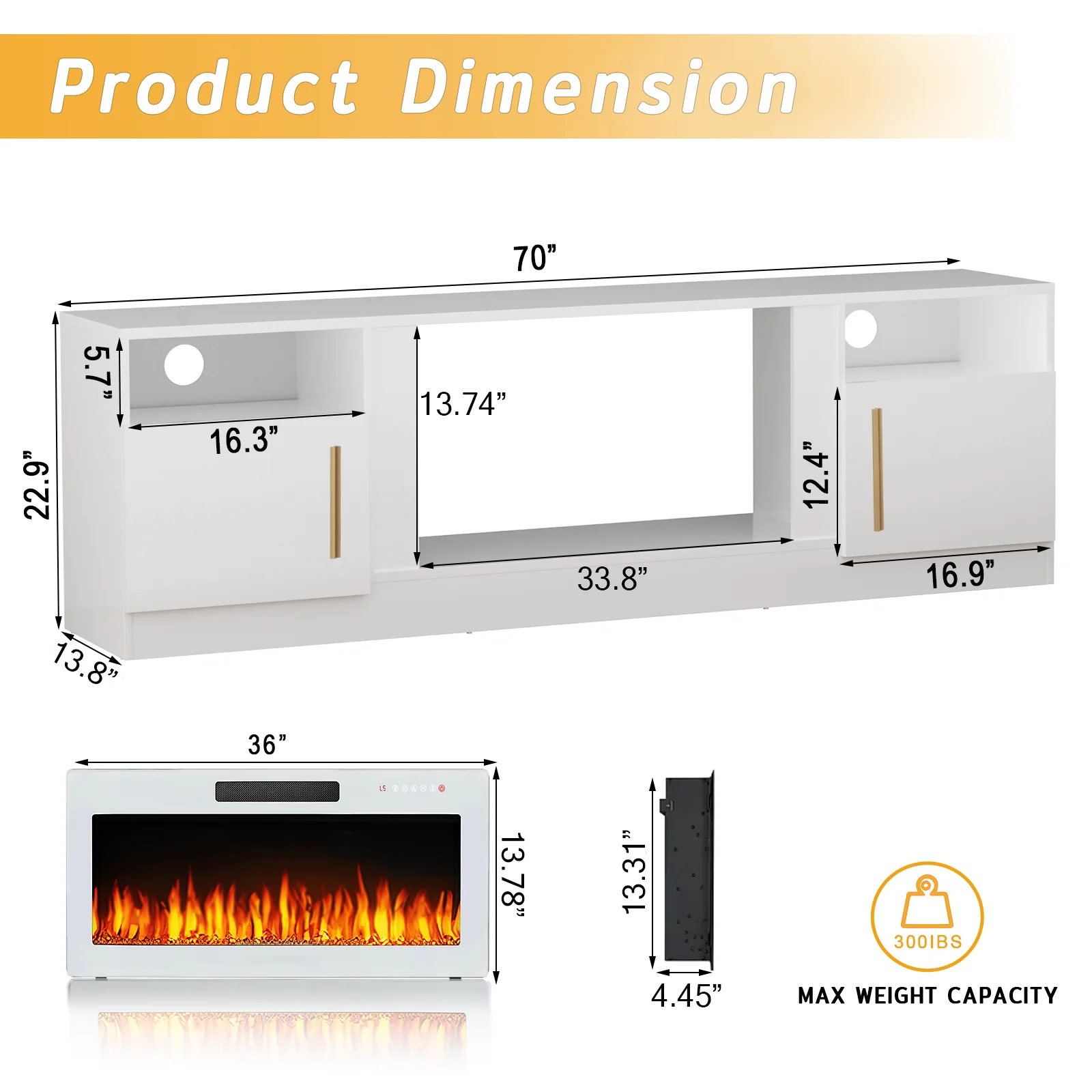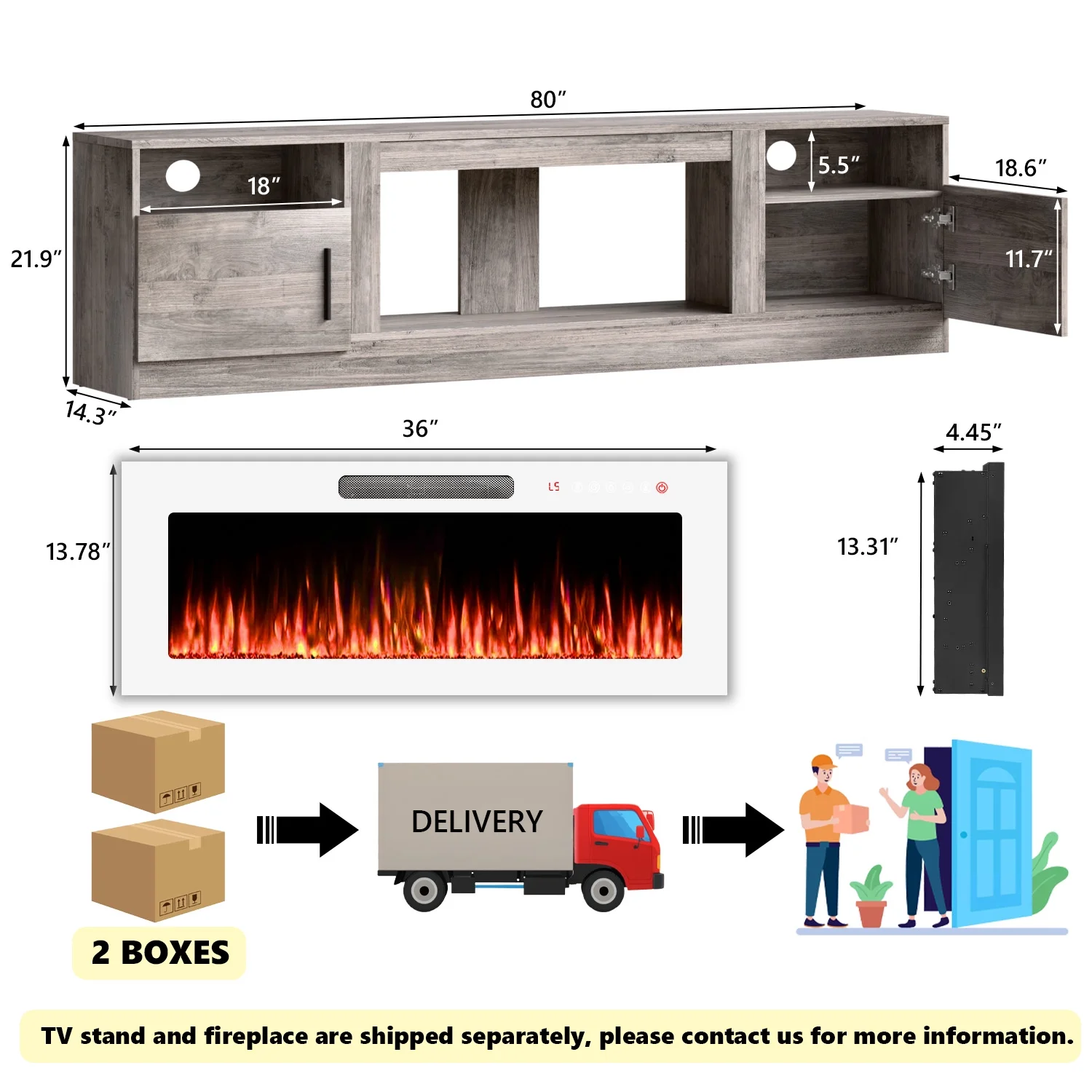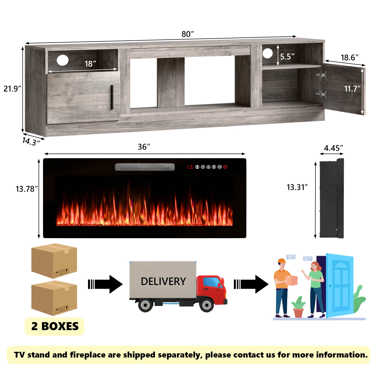 - 36-inch electric fireplace with adjustable flame color and brightness