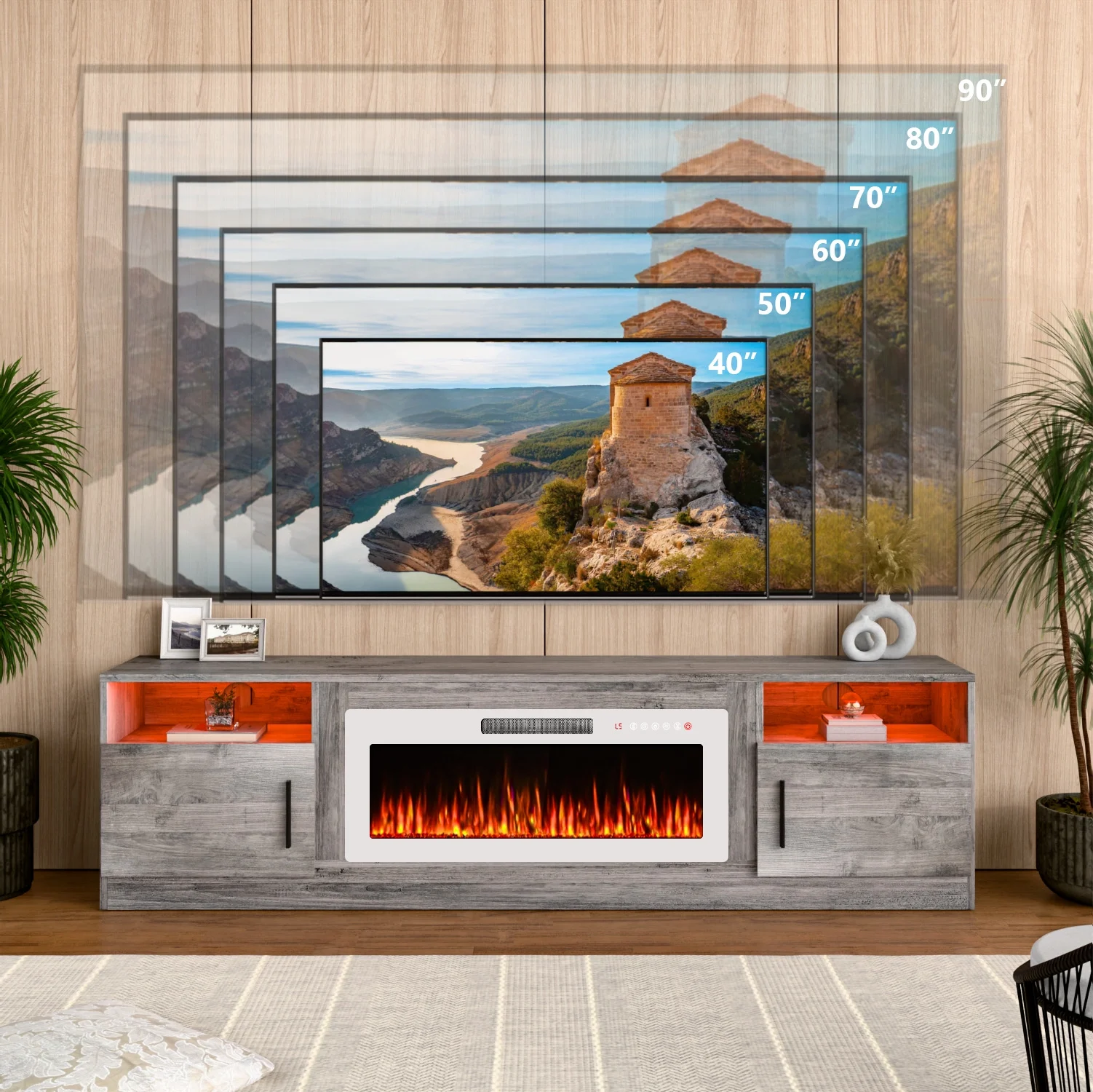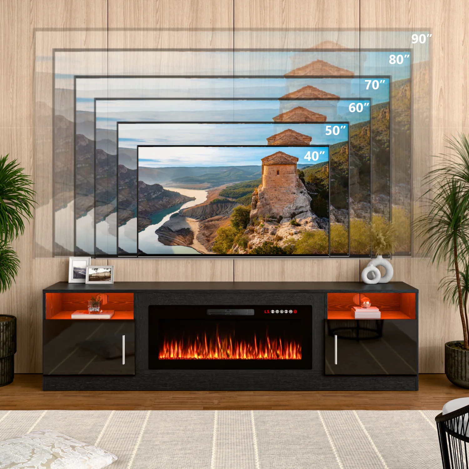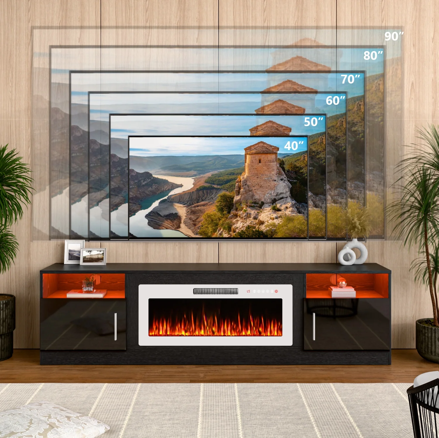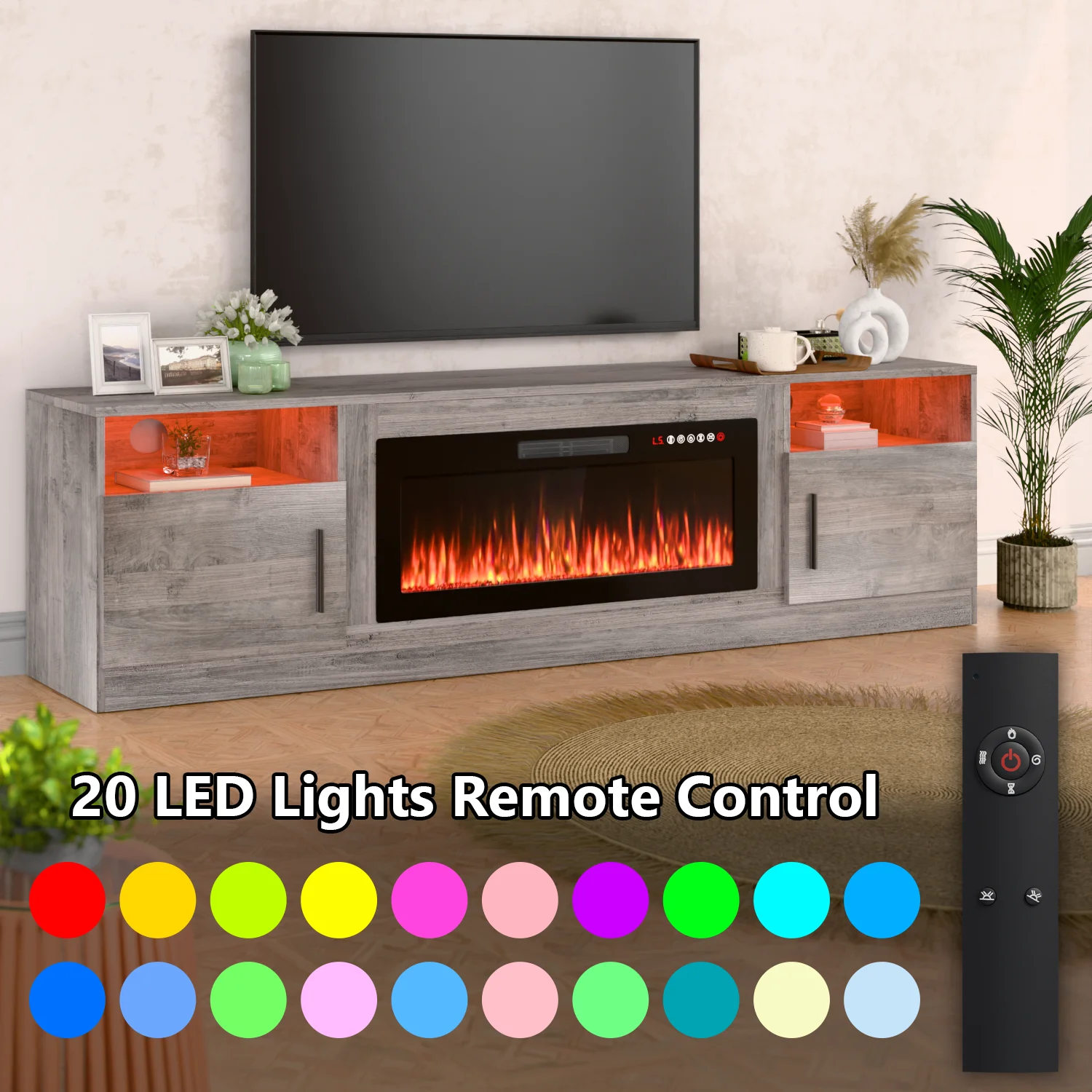 - 12 flame colors and 12 flame bed colors for customizable ambiance