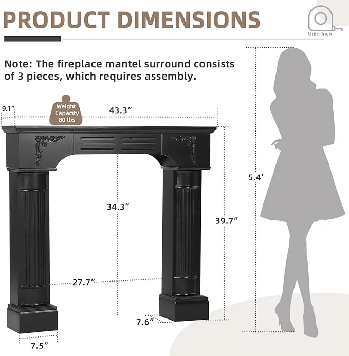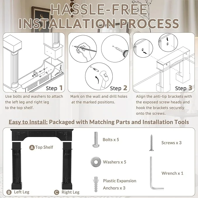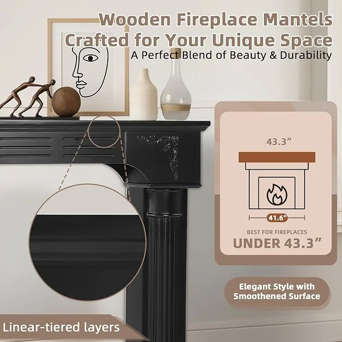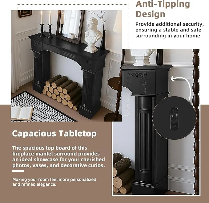 - Large Decorative Top Surface & Anti-Tipping: Featuring a spacious 43.3" L �� 9.1" D top, mantels for fireplace offer ample room to showcase photos, vases, and decorative treasures, adding a refined personal touch to your home. Its reliable anti-tip design firmly secures the structure to the wall, ensuring safety for households with children or pets. Combining generous display capacity with thoughtful protection, fireplace mantel creates a stunning and reliable centerpiece for any living space.