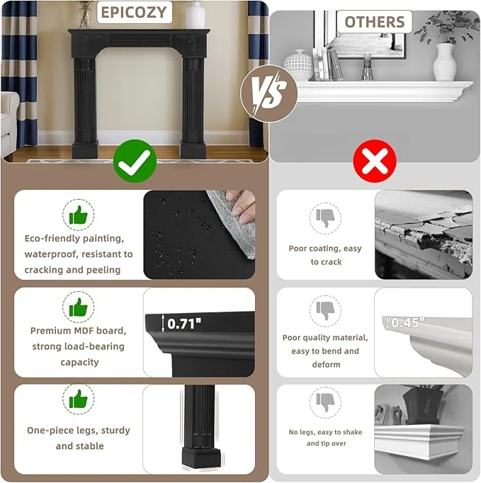 - ?3-in-1 Versatile Fireplace Mantel: Whether for daily use or festive gatherings, the EPICOZY fireplace surround adds charm and elegance to your fireplace while serving as a stylish wall accent. It doubles as a practical living room shelf and is perfect for holiday d��cor. Whether it��s Christmas or Halloween, create a festive display that adds warmth and charm to your gatherings. Upgrade your home with the fireplace mantels that beautifully combines style, durability, and seasonal versatility.