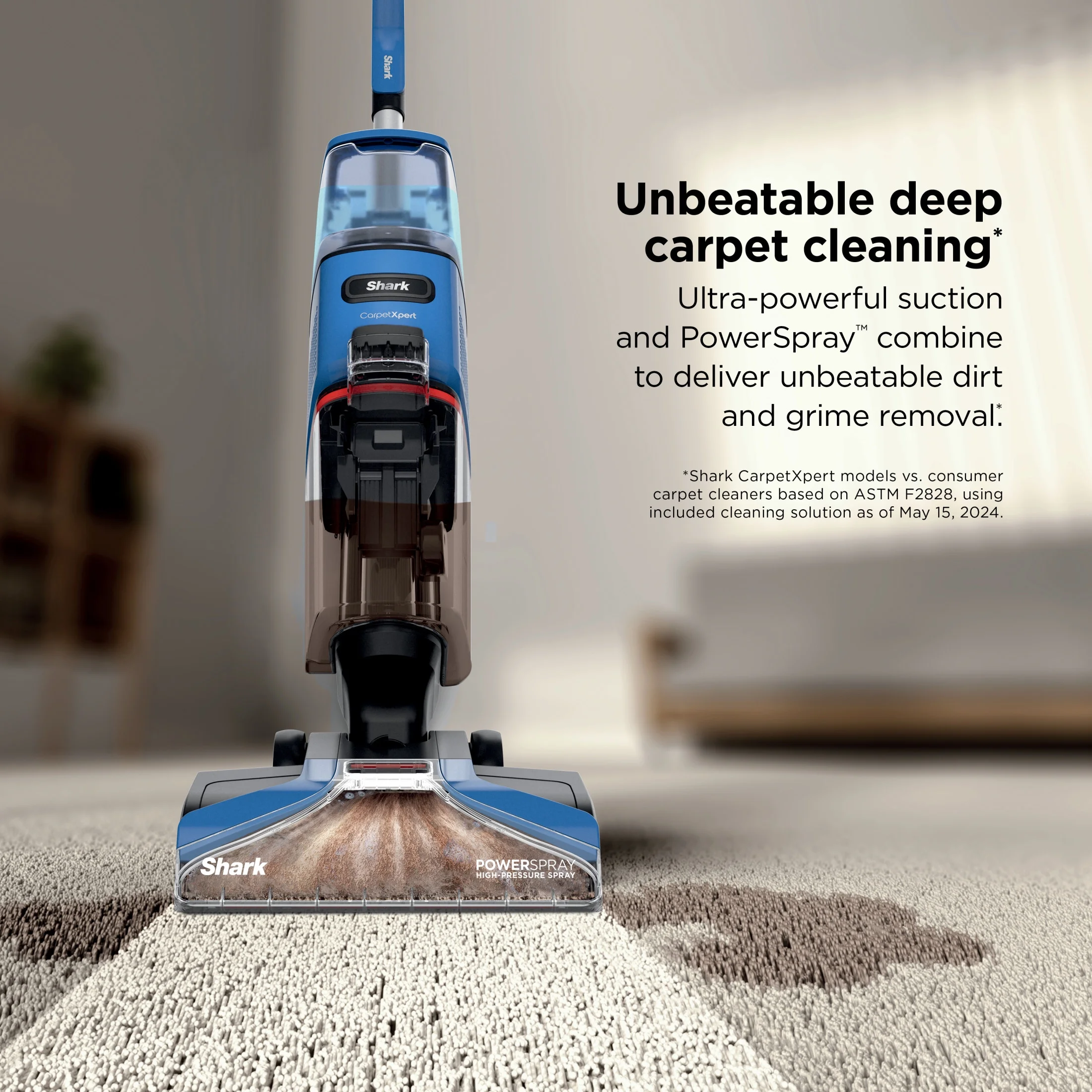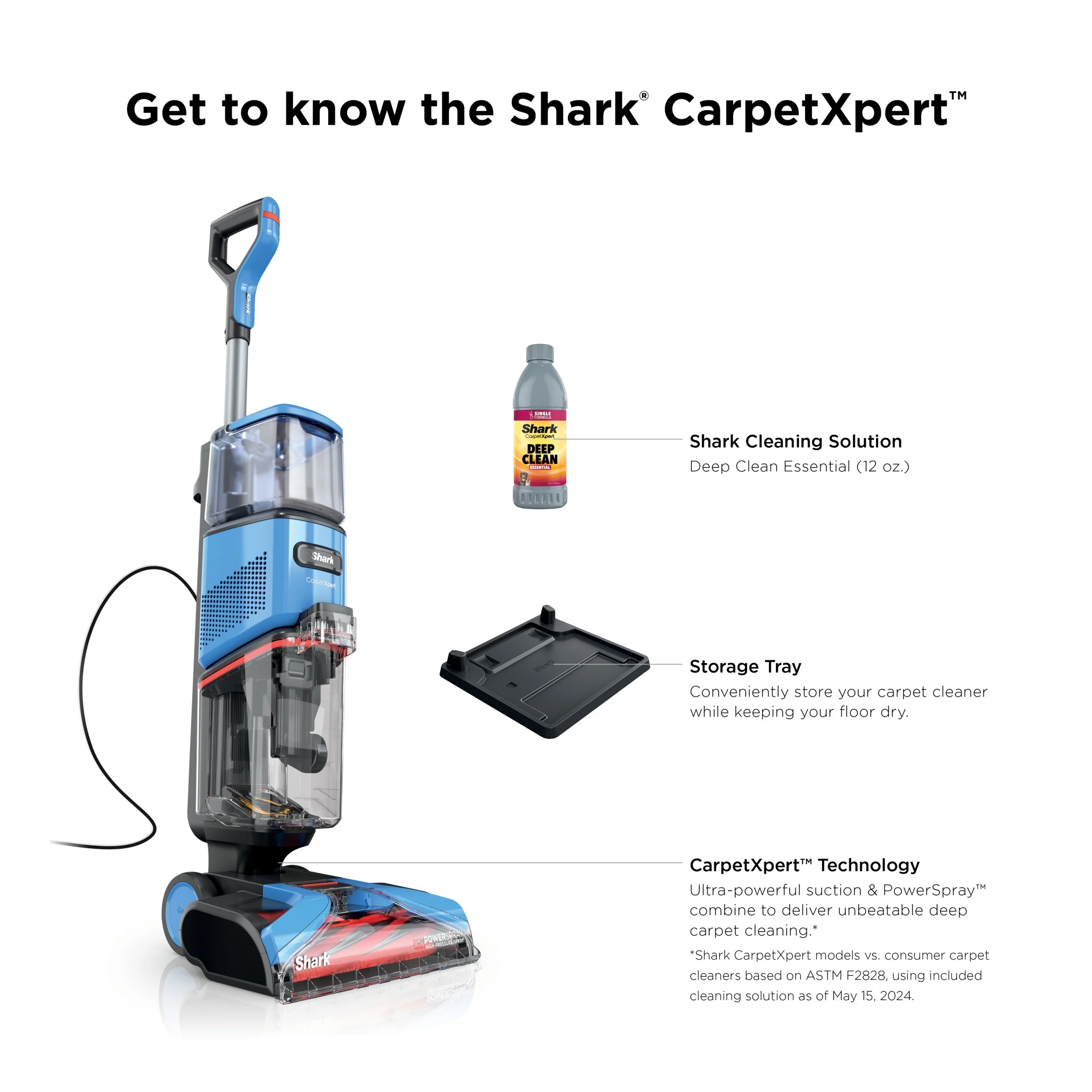 - Shark CarpetXpert models vs. consumer carpet cleaners based on ASTM F2828 using included cleaning solution as of May 15, 2024. ^When using Shark cleaning solution.