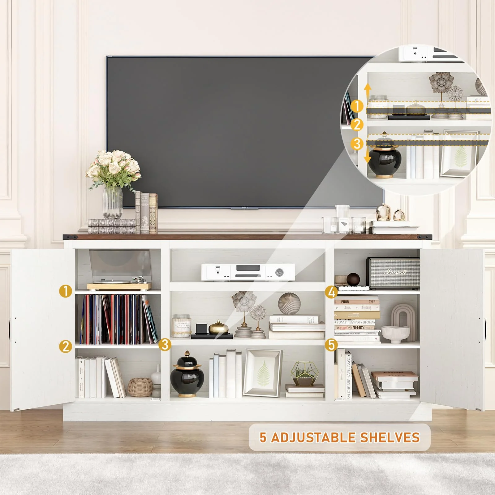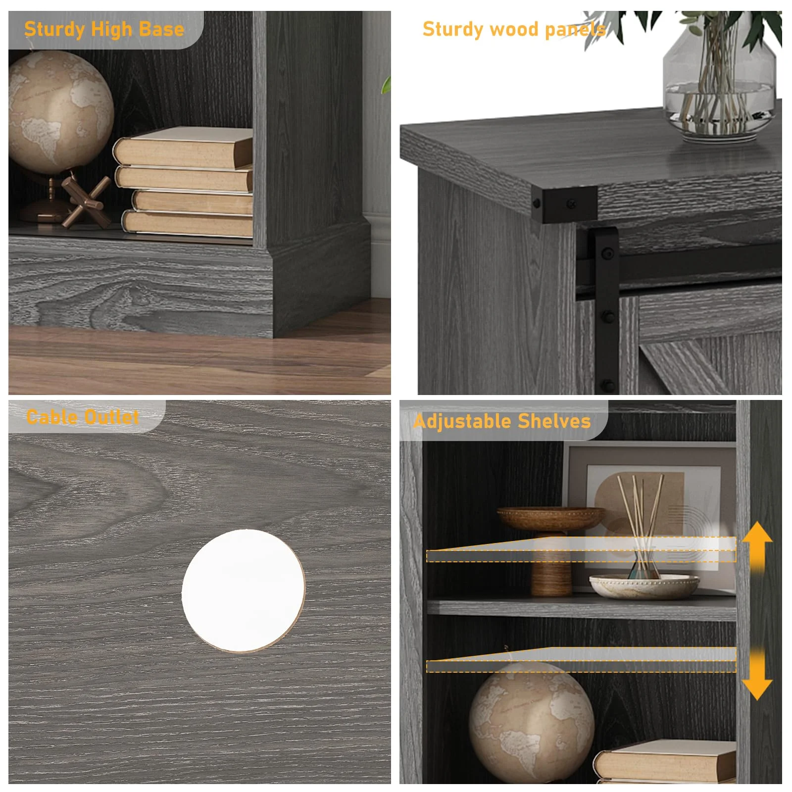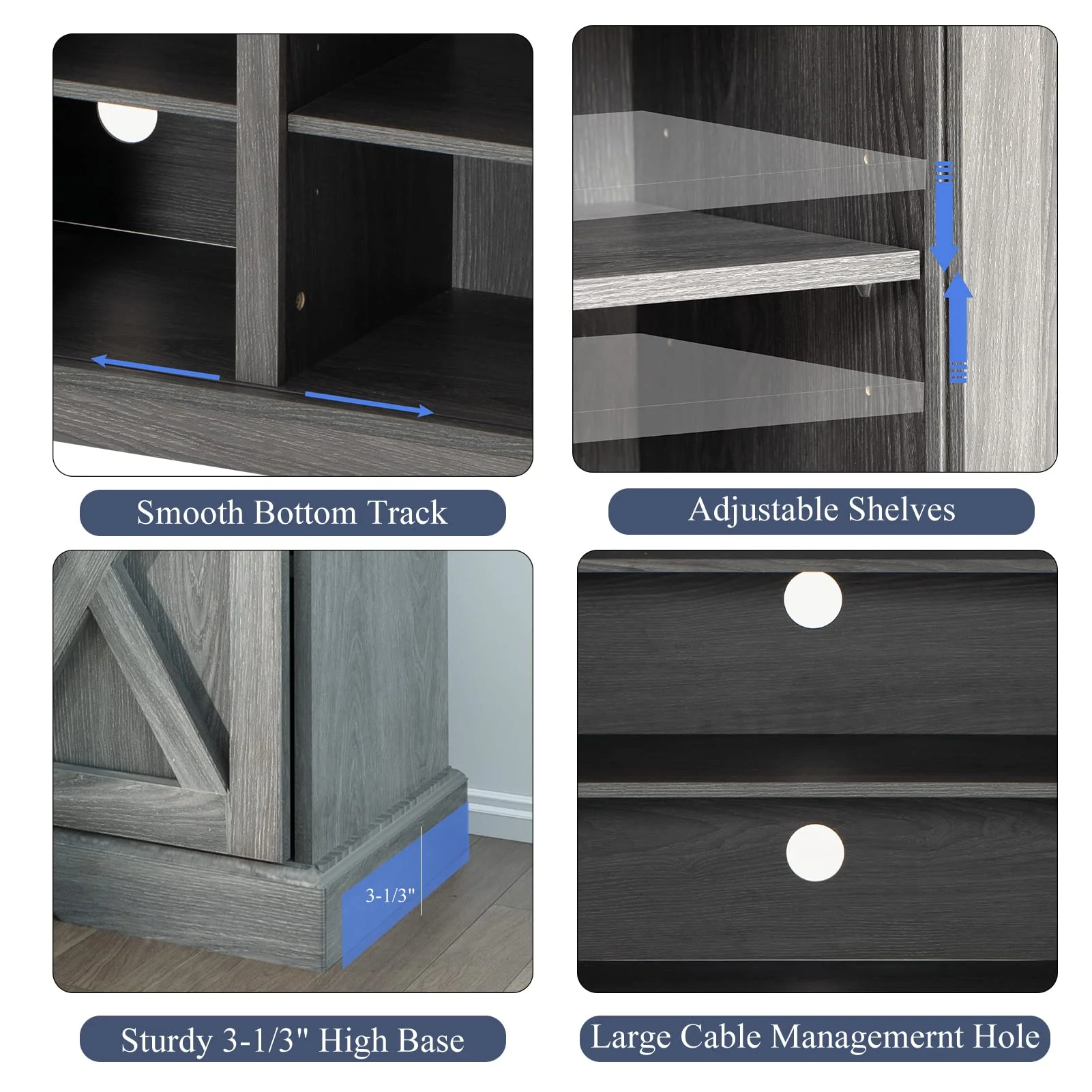- TV Stand with Adjustable Shelves: The barn door TV console have 3 adjustable shelves, all cabinet shelves can be adjusted in 3 gear or remove directly, you can put DVDs, books, magazines, video, game consoles, and other media components in any place within easy reach.