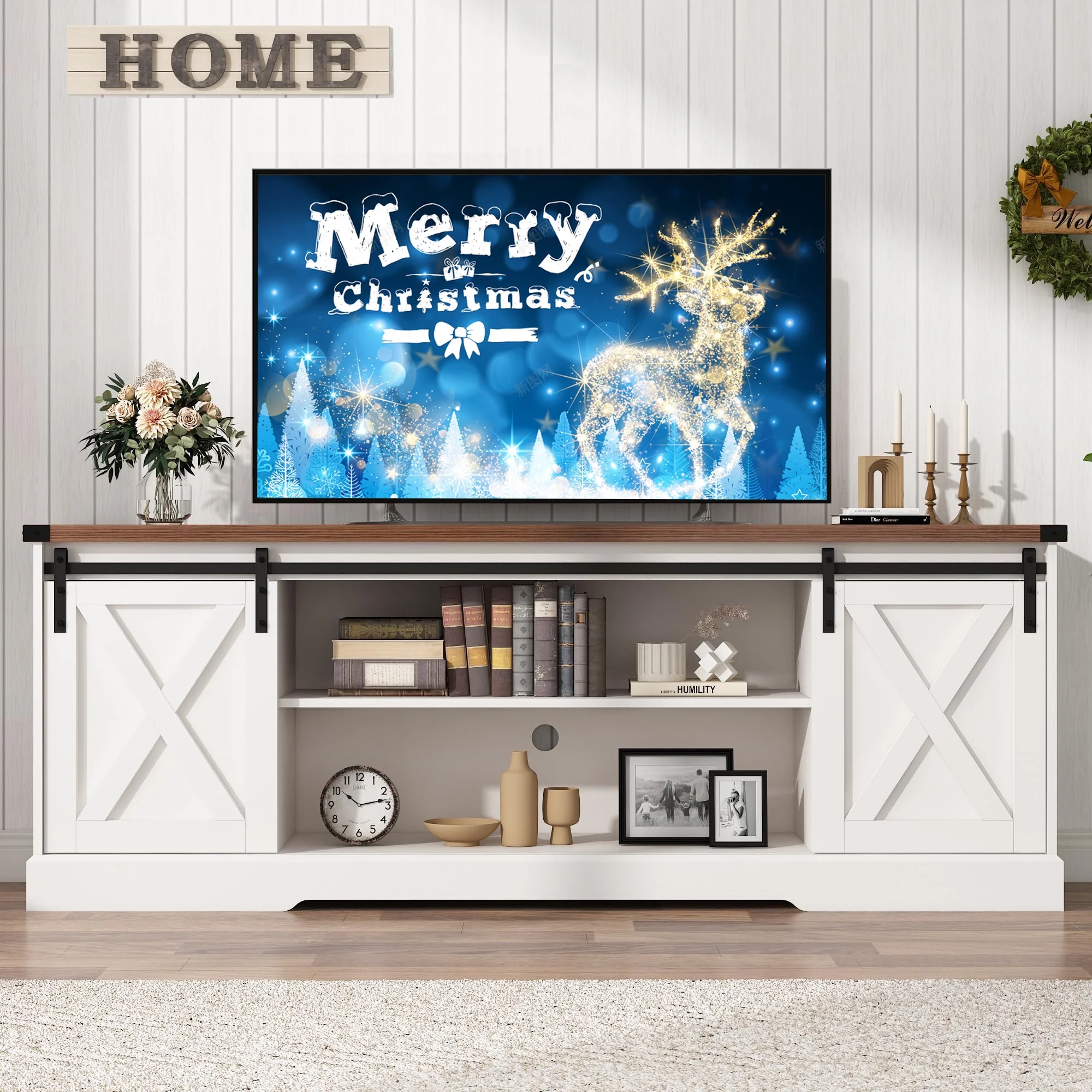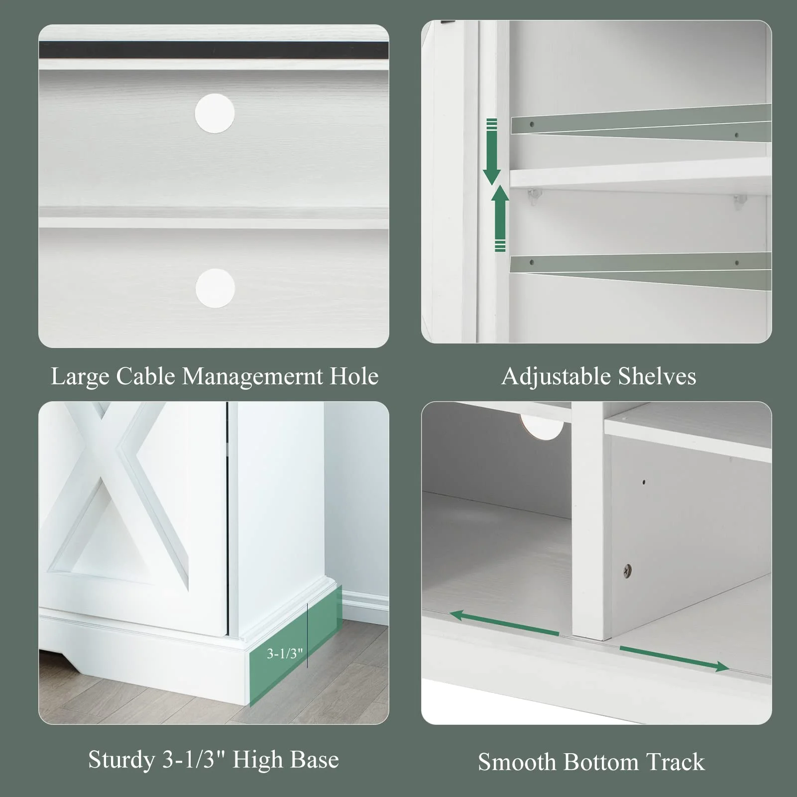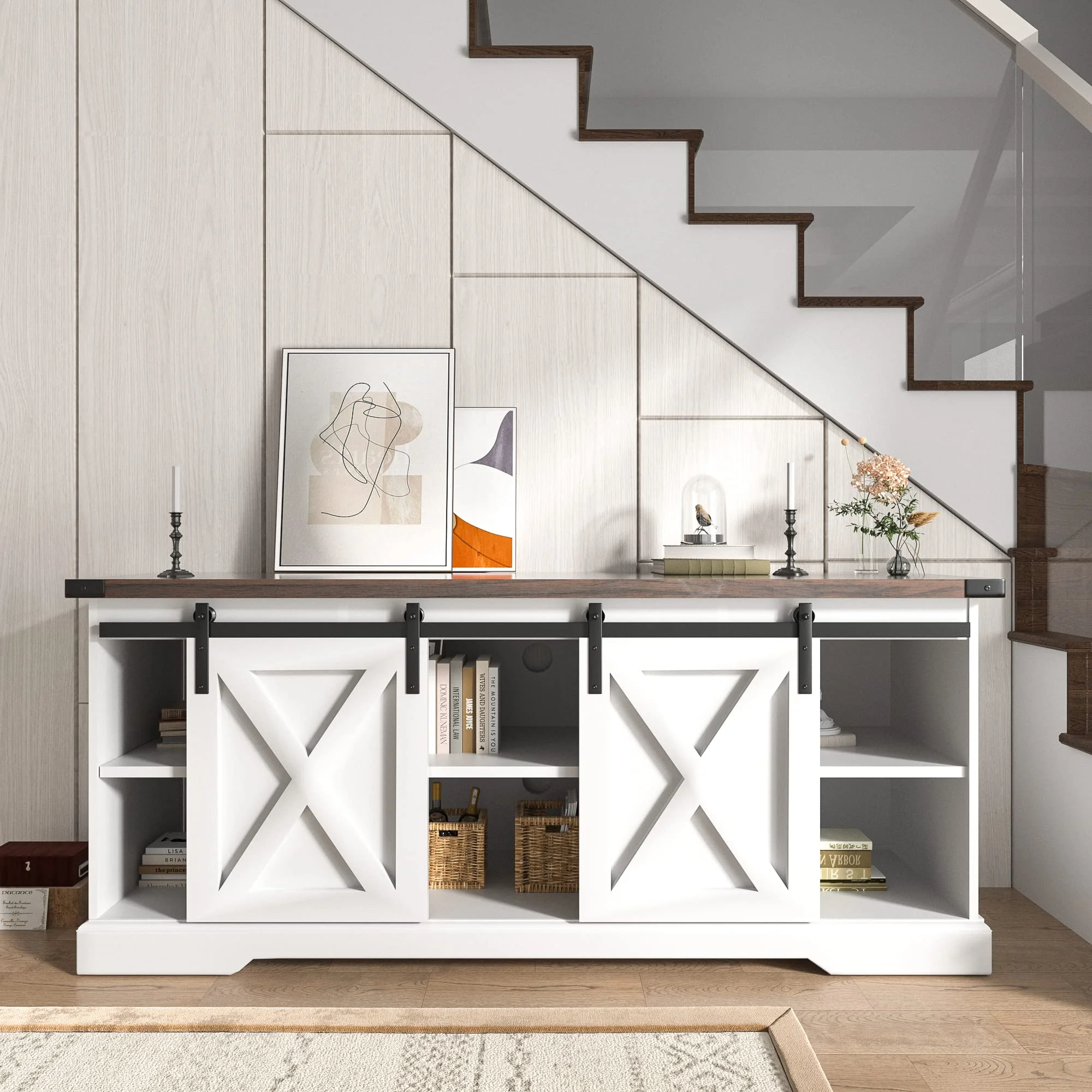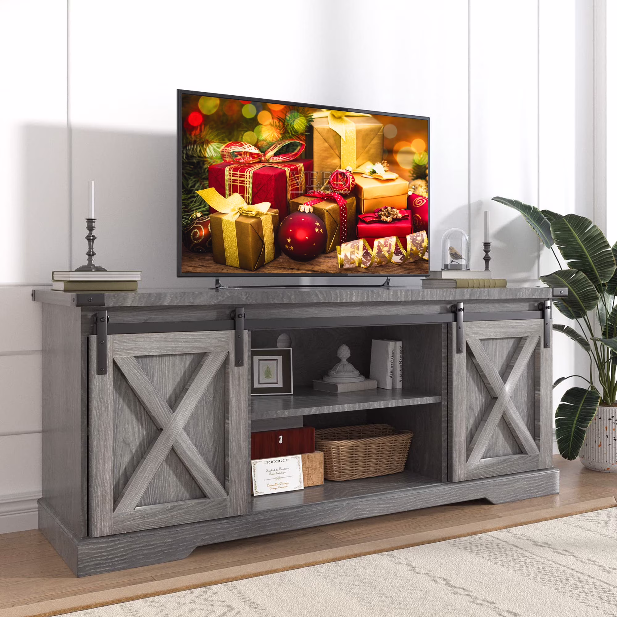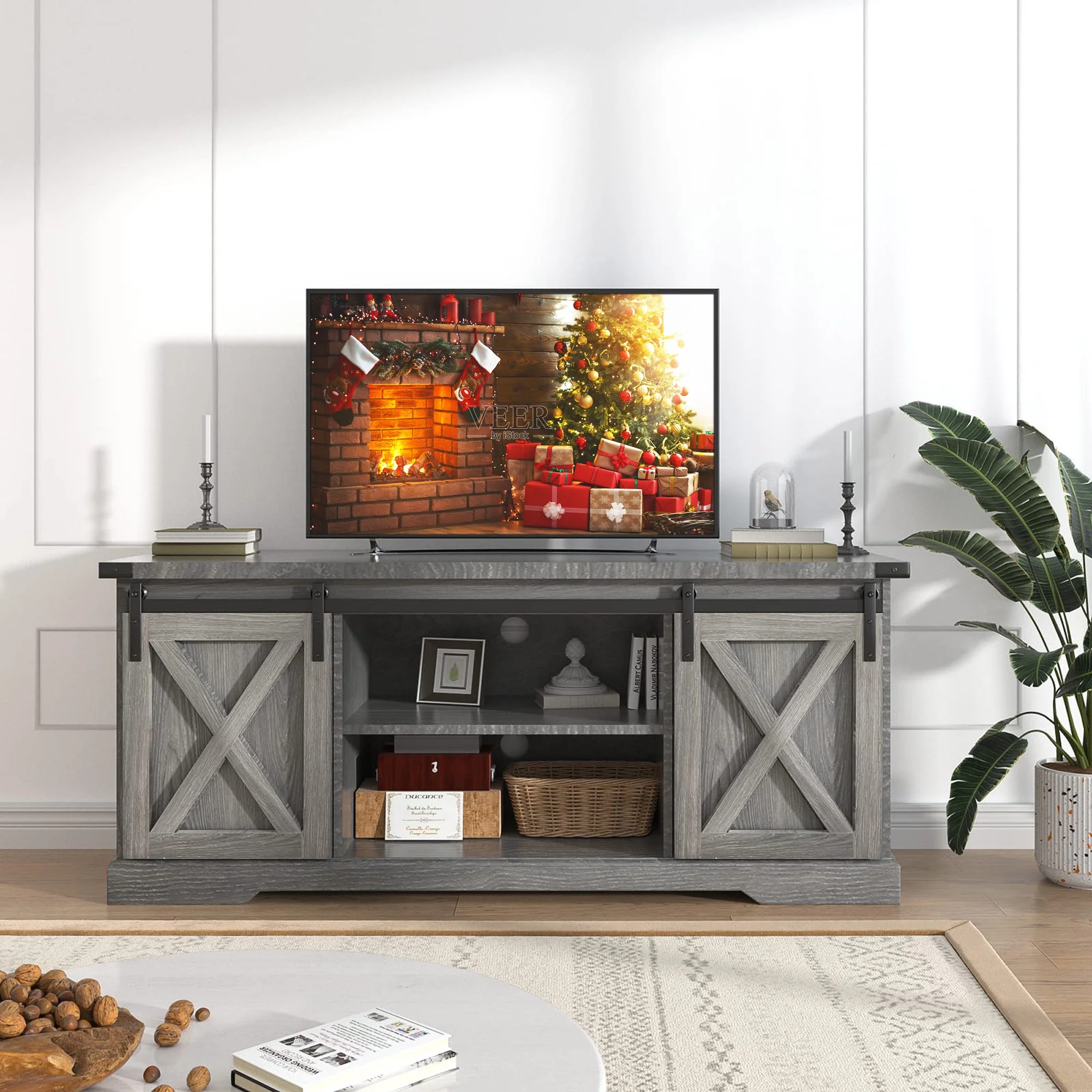 - Featuring open center compartments and 2 cabinets with barn doors, this farmhouse entertainment center offers spacious storage space for your DVDs, video game systems, cable box, books, magazines, and all other daily necessities. TV Stand with Sliding Barn Doors: The Farmhouse TV console stand have double sliding barn doors, which is convenient to access the 2 side cabinets then hidden side storage cabinets or center storage shelves according our need. Quality steel bar make doors slide smoothly, and no noise during movement. X-shape design add more rustic farmhouse style to this barn door TV stand.