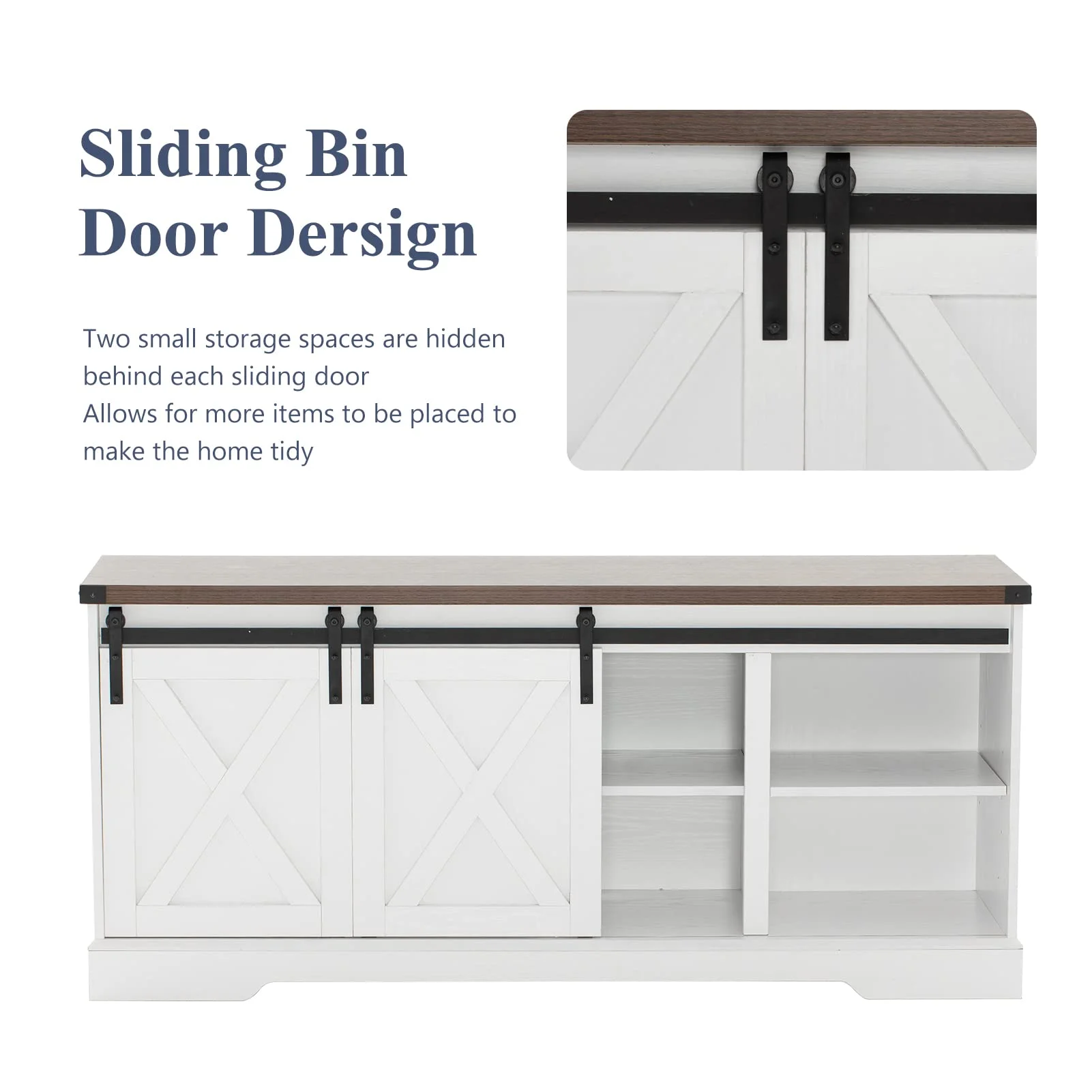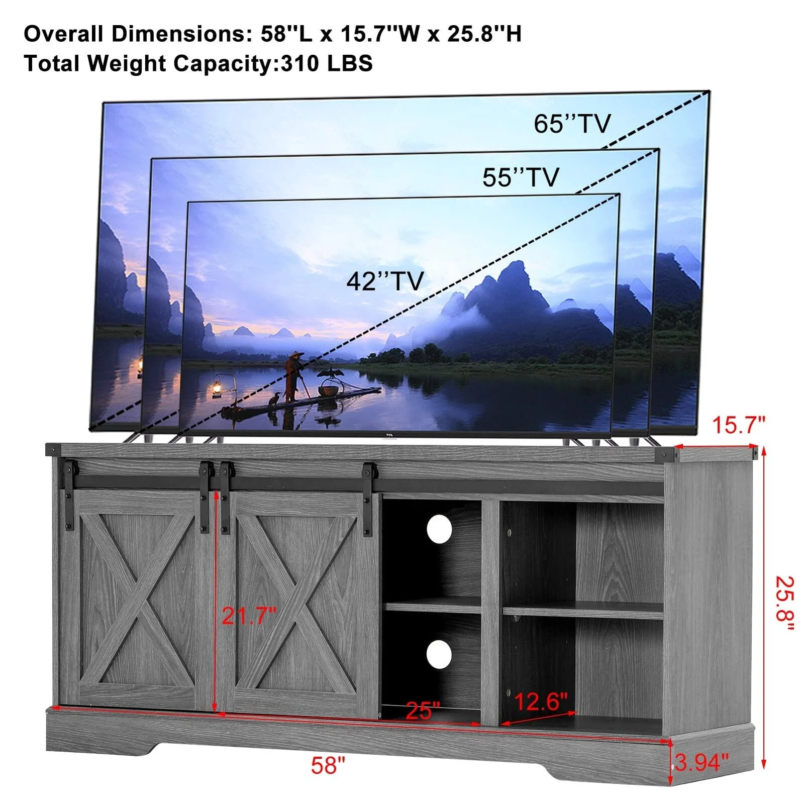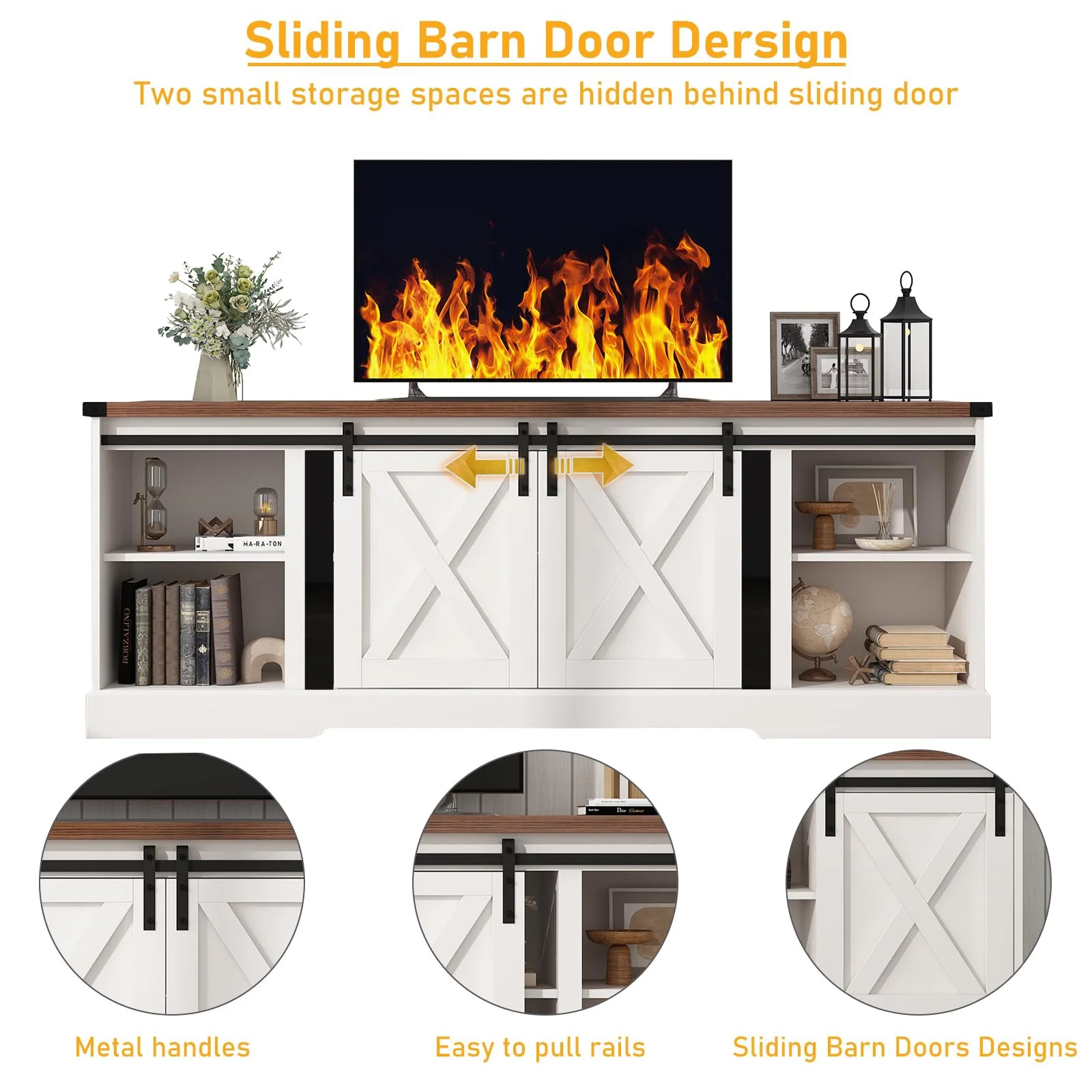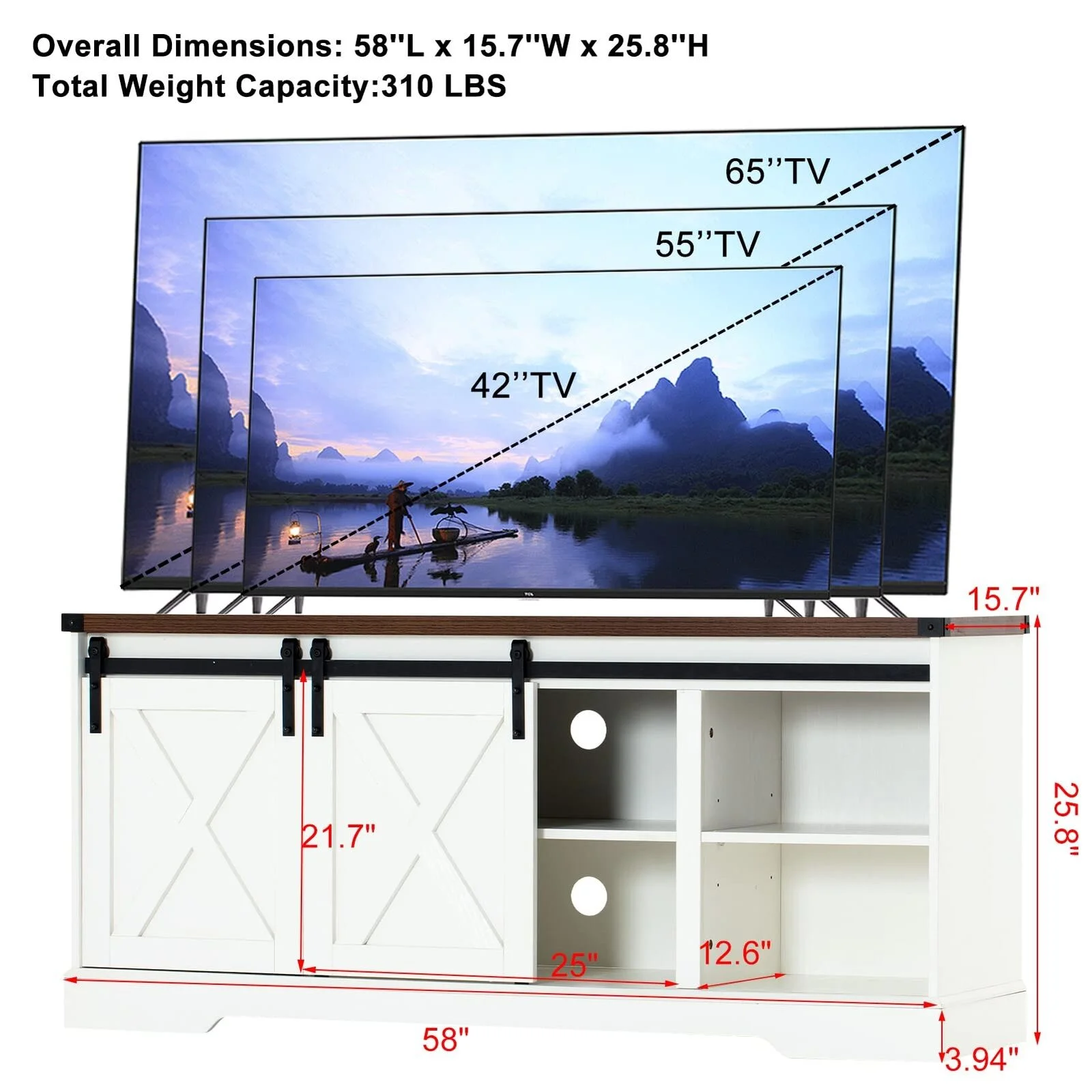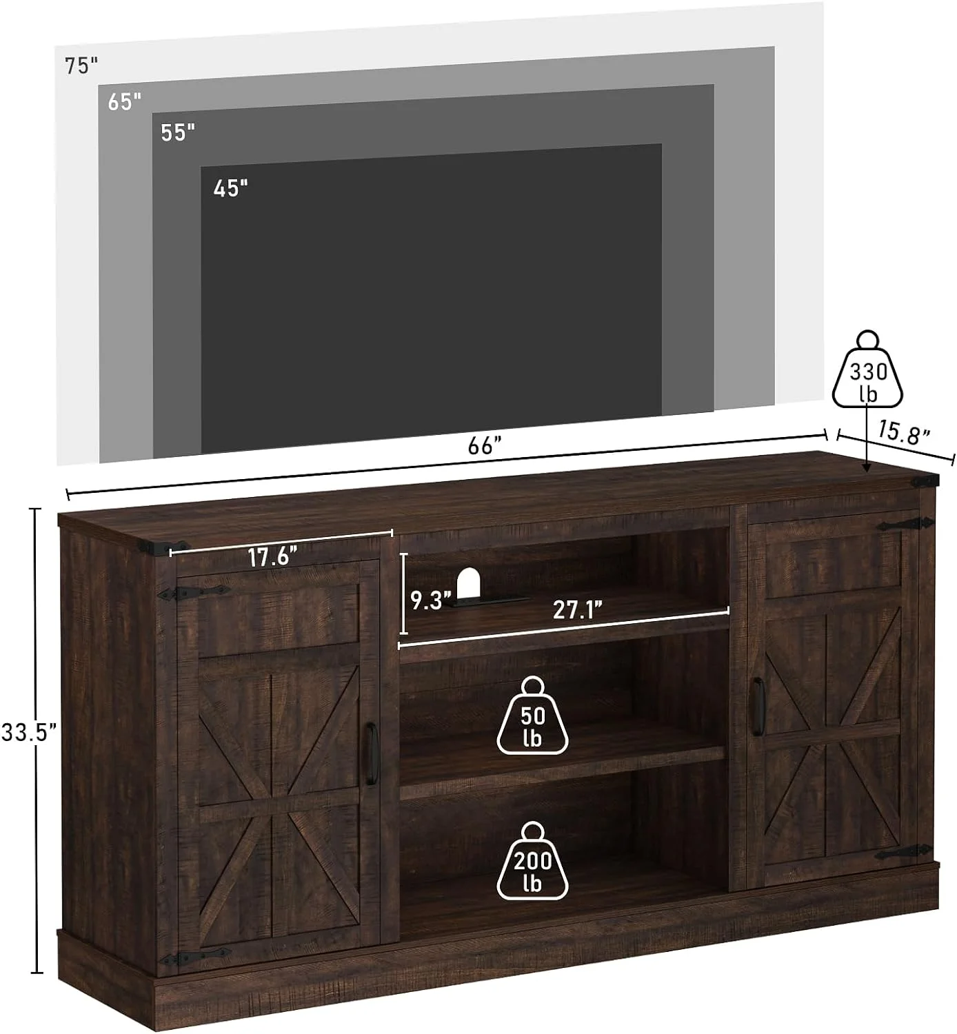 - Featuring open center compartments and 2 cabinets with barn doors, this farmhouse entertainment center offers spacious storage space for your DVDs, video game systems, cable box, books, magazines, and all other daily necessities. TV Stand with Sliding Barn Doors: The Farmhouse TV console stand have double sliding barn doors, which is convenient to access the 2 side cabinets then hidden side storage cabinets or center storage shelves according our need. Quality steel bar make doors slide smoothly, and no noise during movement. X-shape design add more rustic farmhouse style to this barn door TV stand.