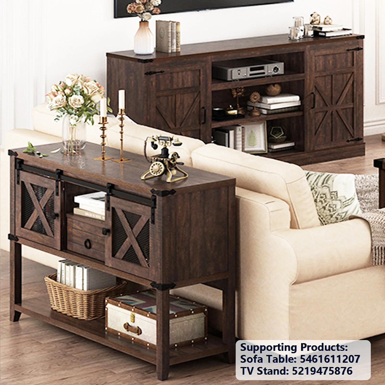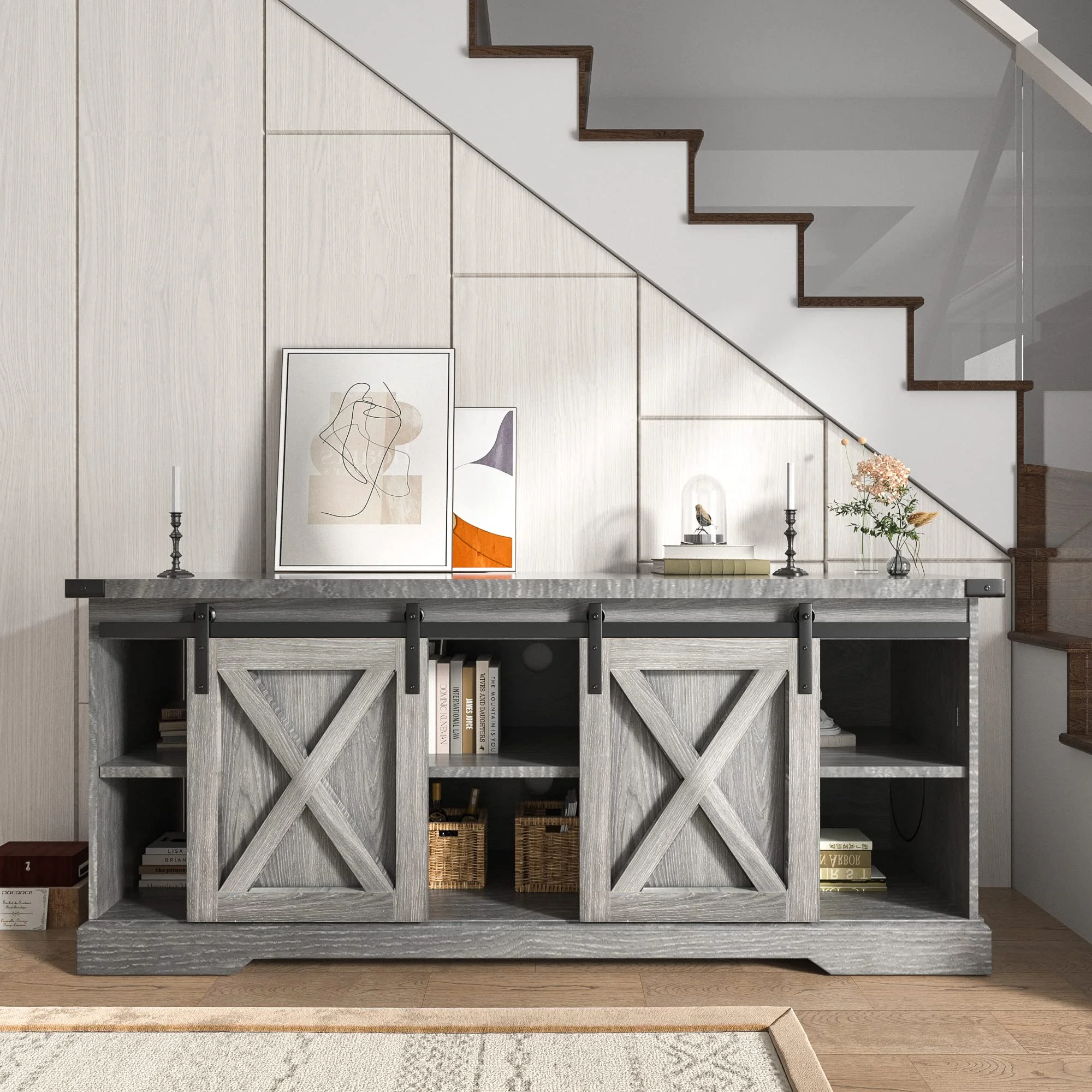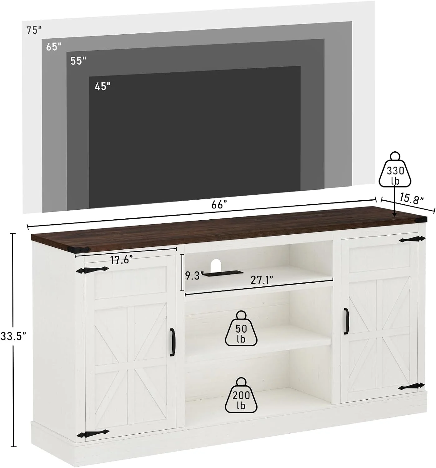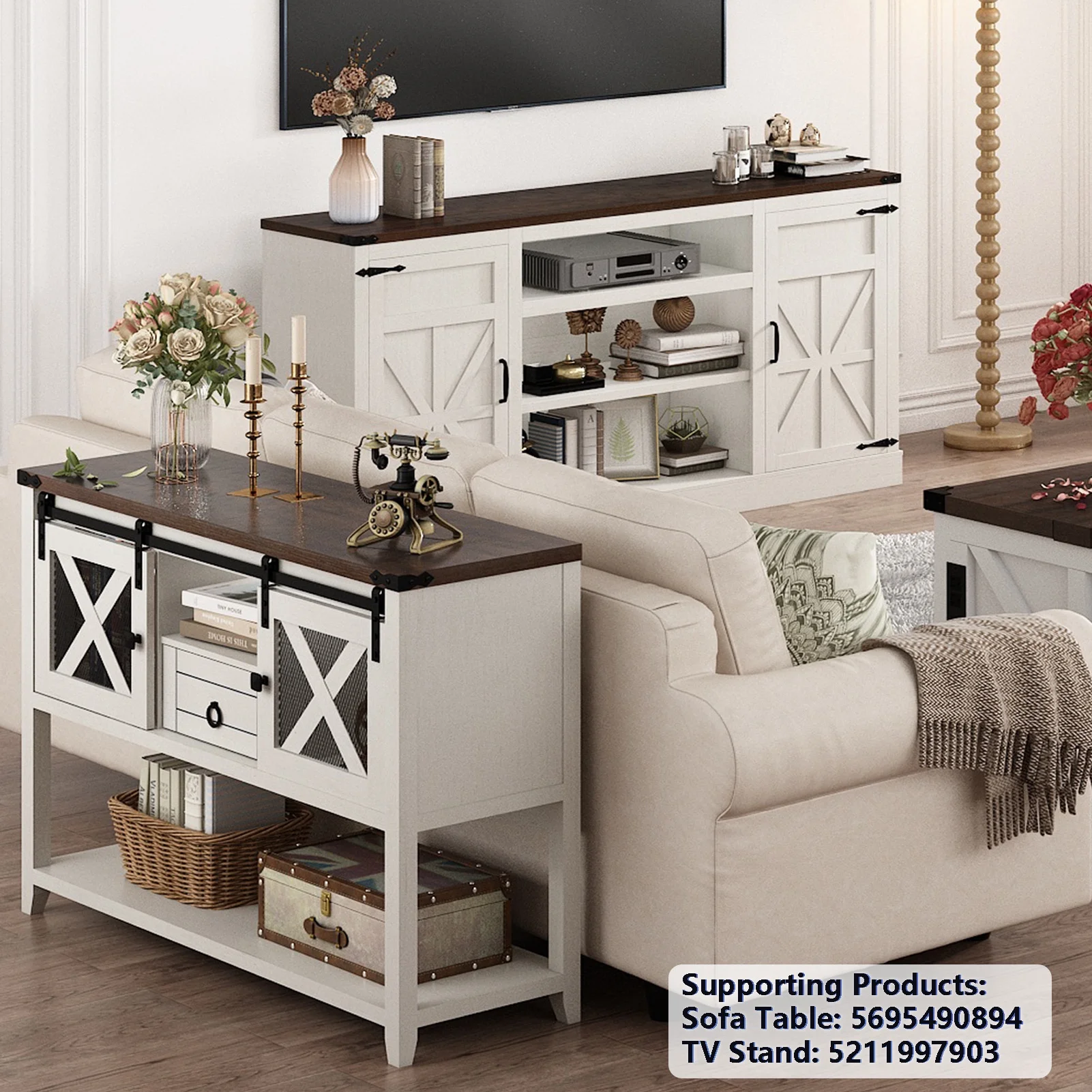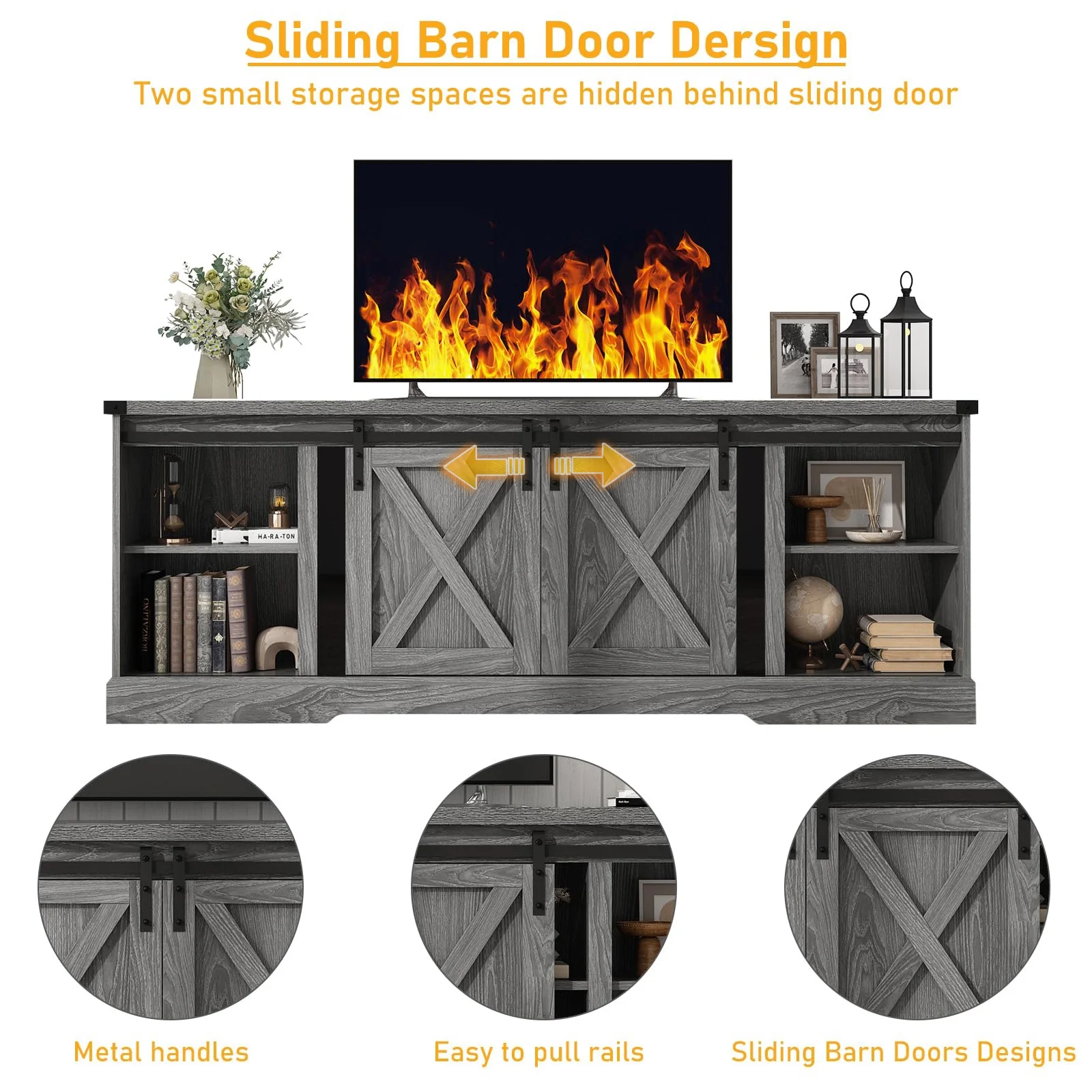 - Featuring open center compartments and 2 cabinets with barn doors, this farmhouse entertainment center offers spacious storage space for your DVDs, video game systems, cable box, books, magazines, and all other daily necessities. TV Stand with Sliding Barn Doors: The Farmhouse TV console stand have double sliding barn doors, which is convenient to access the 2 side cabinets then hidden side storage cabinets or center storage shelves according our need. Quality steel bar make doors slide smoothly, and no noise during movement. X-shape design add more rustic farmhouse style to this barn door TV stand.