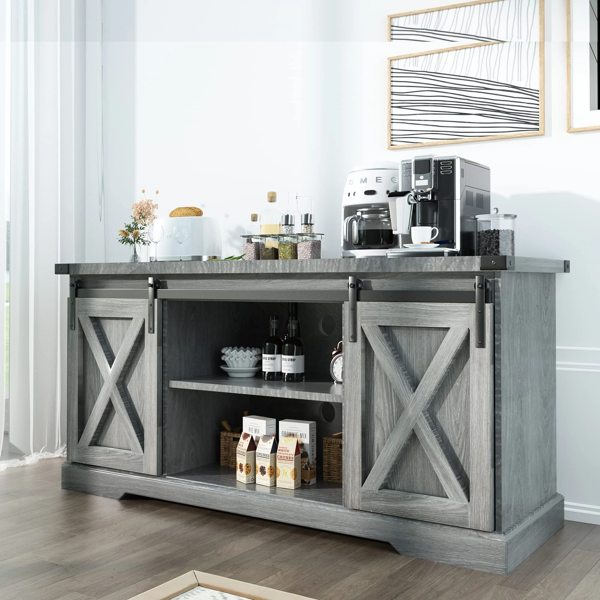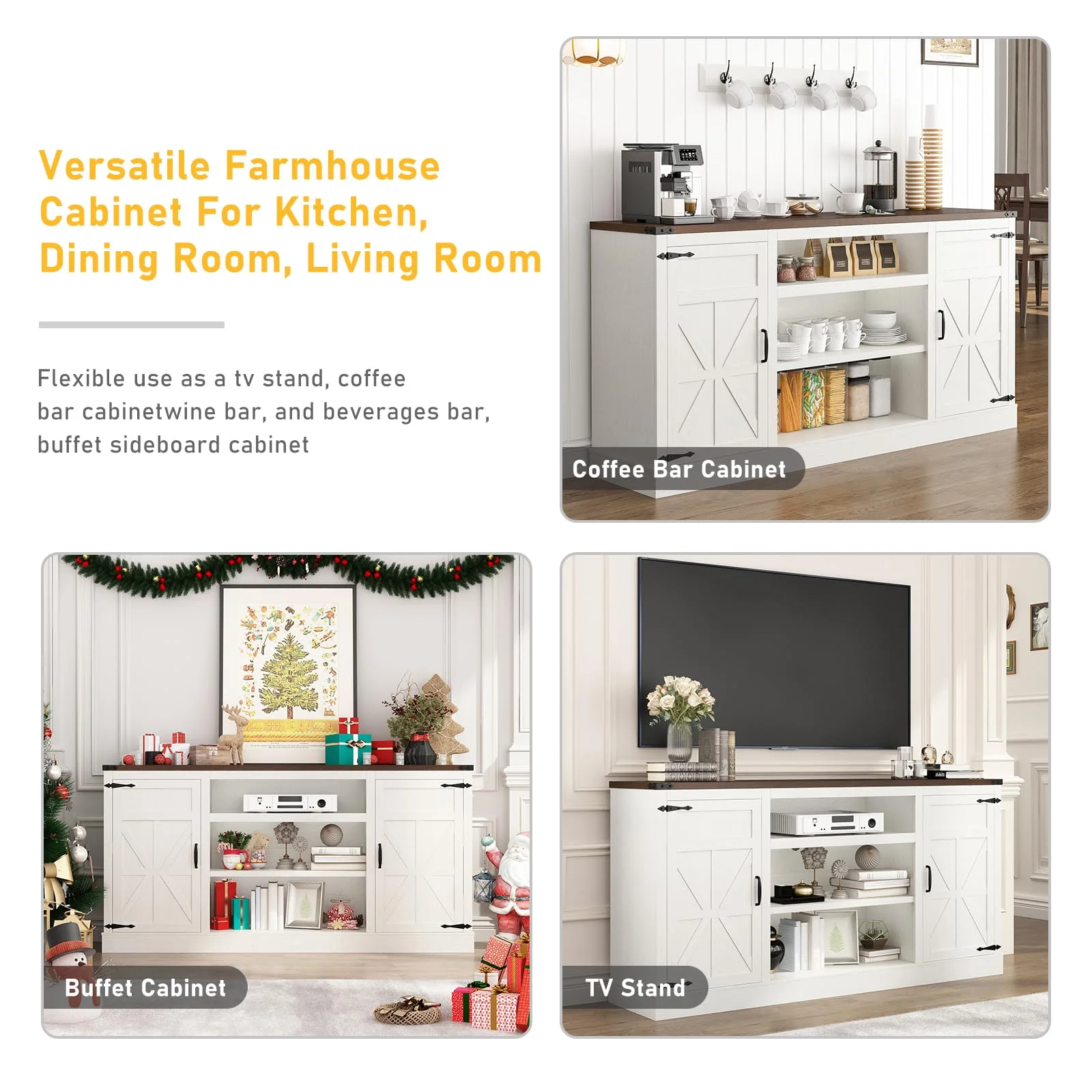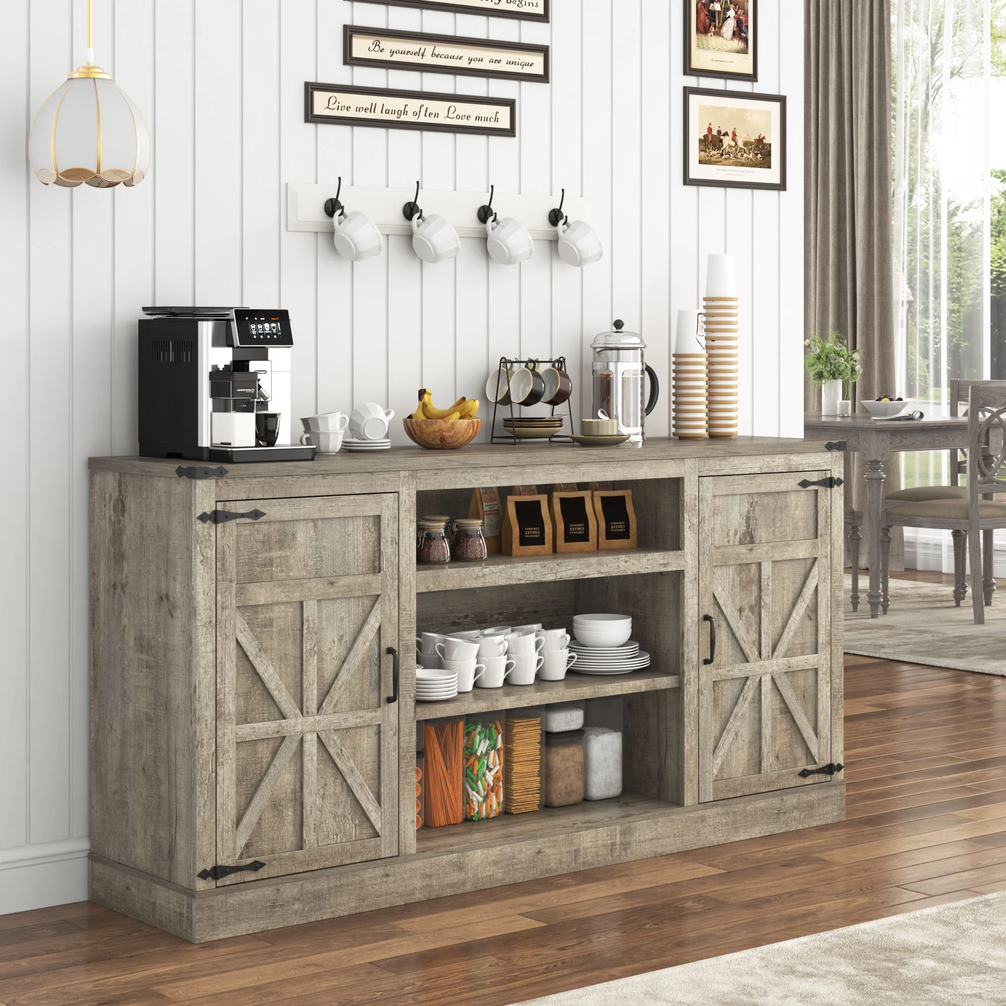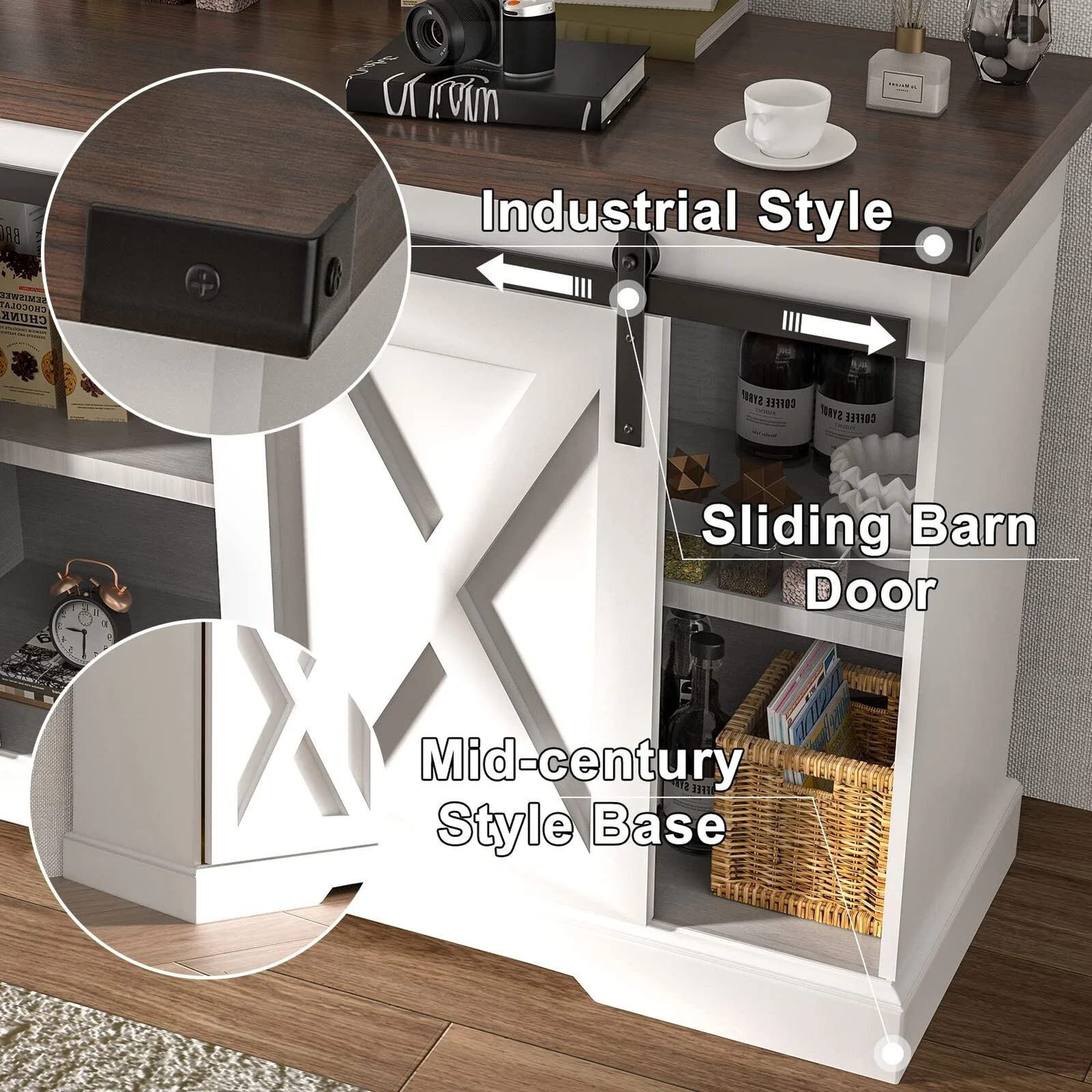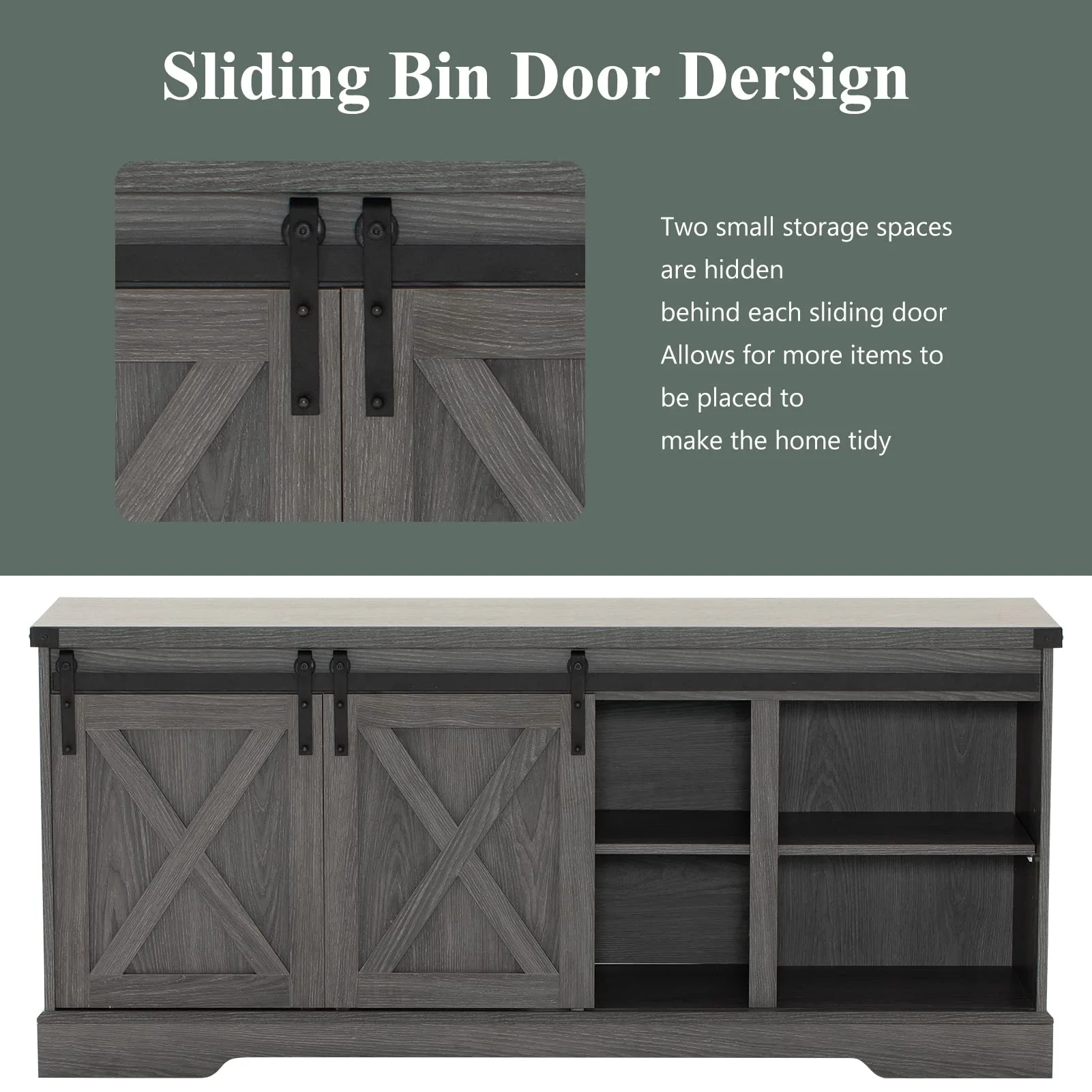 - Featuring open center compartments and 2 cabinets with barn doors, this farmhouse entertainment center offers spacious storage space for your DVDs, video game systems, cable box, books, magazines, and all other daily necessities. TV Stand with Sliding Barn Doors: The Farmhouse TV console stand have double sliding barn doors, which is convenient to access the 2 side cabinets then hidden side storage cabinets or center storage shelves according our need. Quality steel bar make doors slide smoothly, and no noise during movement. X-shape design add more rustic farmhouse style to this barn door TV stand.