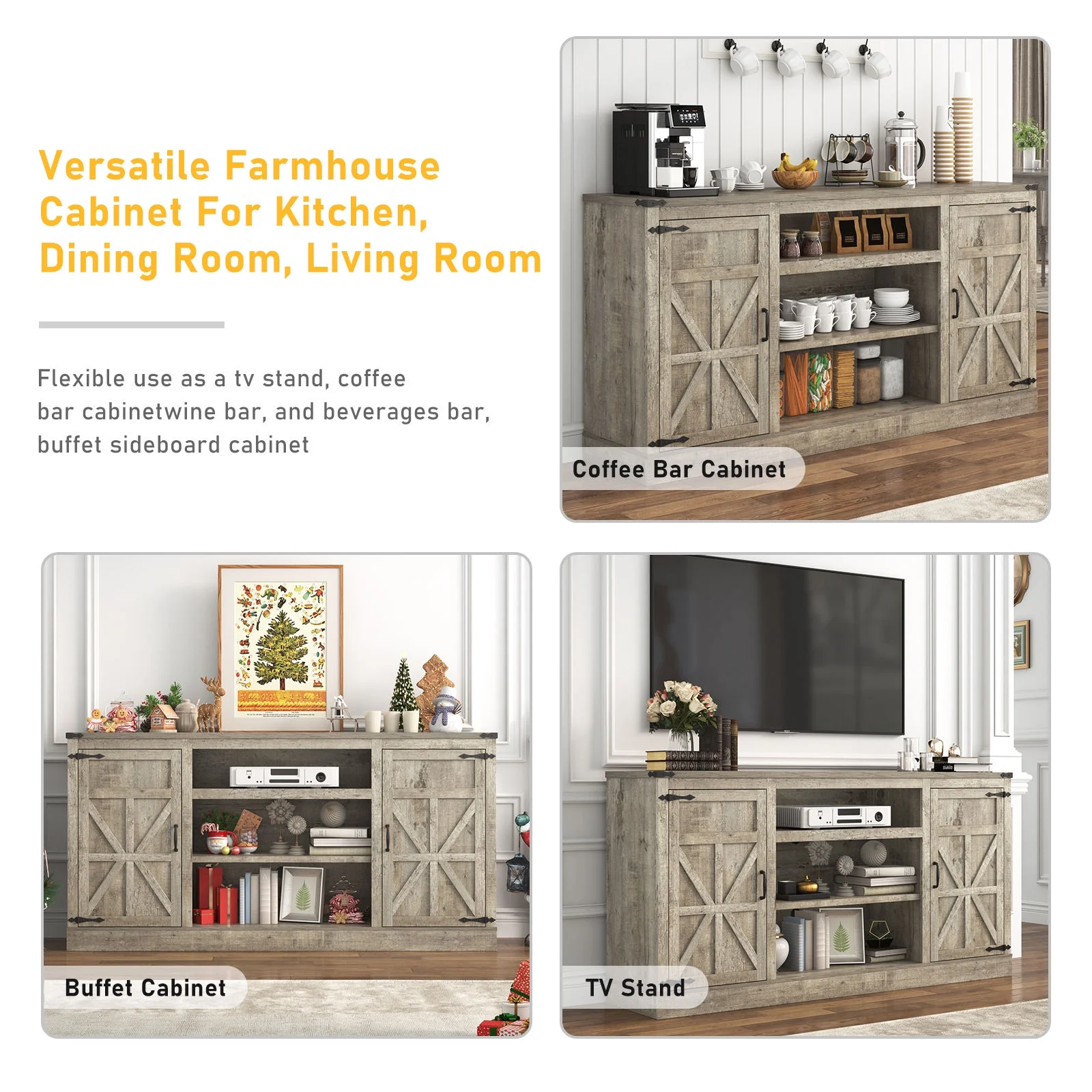 Base on the classic farmhouse TV stand for up 65-inch TVs, our wood TV stands have made a bold upgrade: the size of the middle open space has been expanded to 25"L x 13.35" W x 20.8" H, which are suitable for inserting 23-inches electric fireplace; Matched the classic design of natural wood grain and double sliding barn doors, our farmhouse TV entertainment center stand will not only match well with various living room decor styles, but will also be more practical. 3-gear adjustable shelves make this upgrade TV cabinet also suitable as a sideboard buffet in the kitchen or a console cabinet in the hallway.