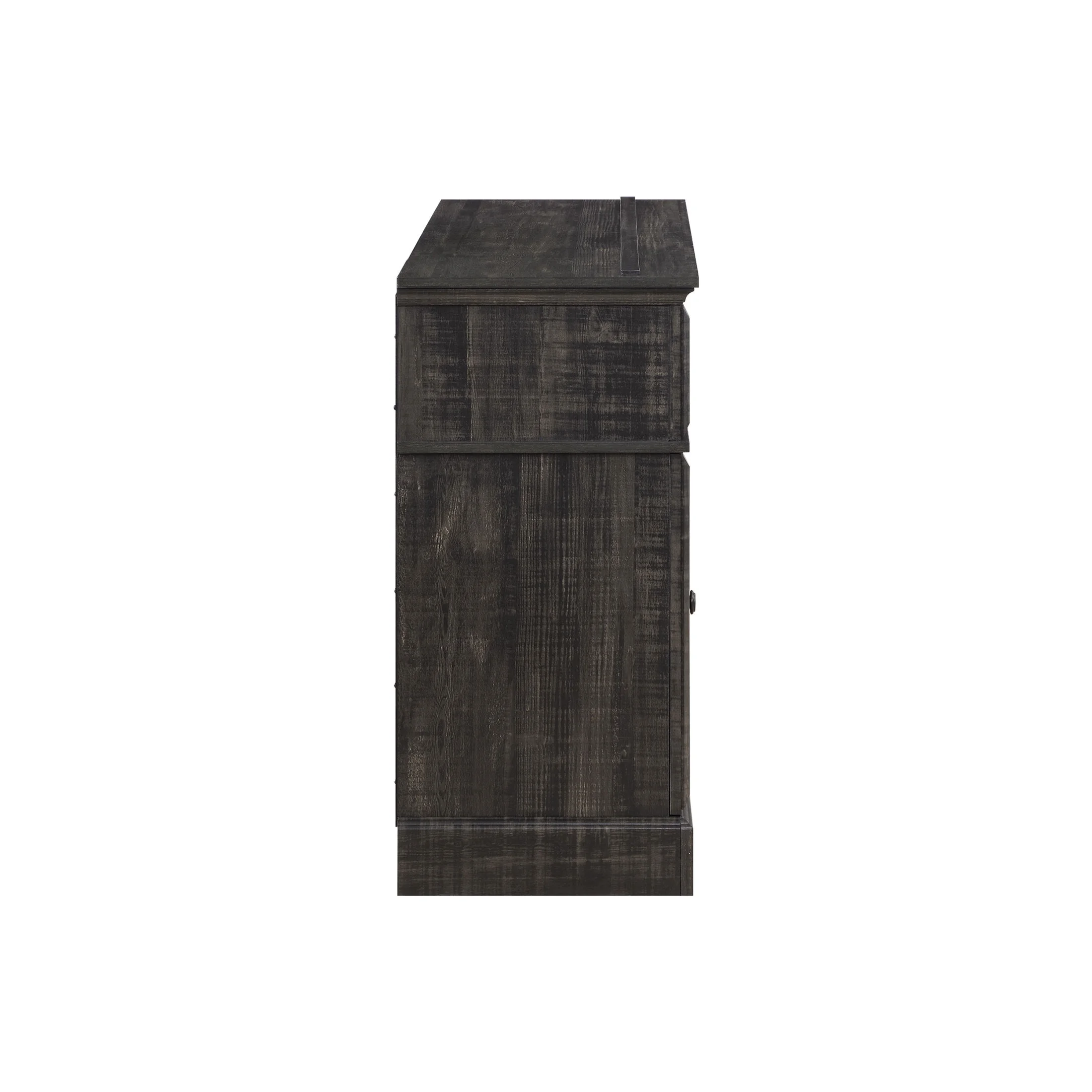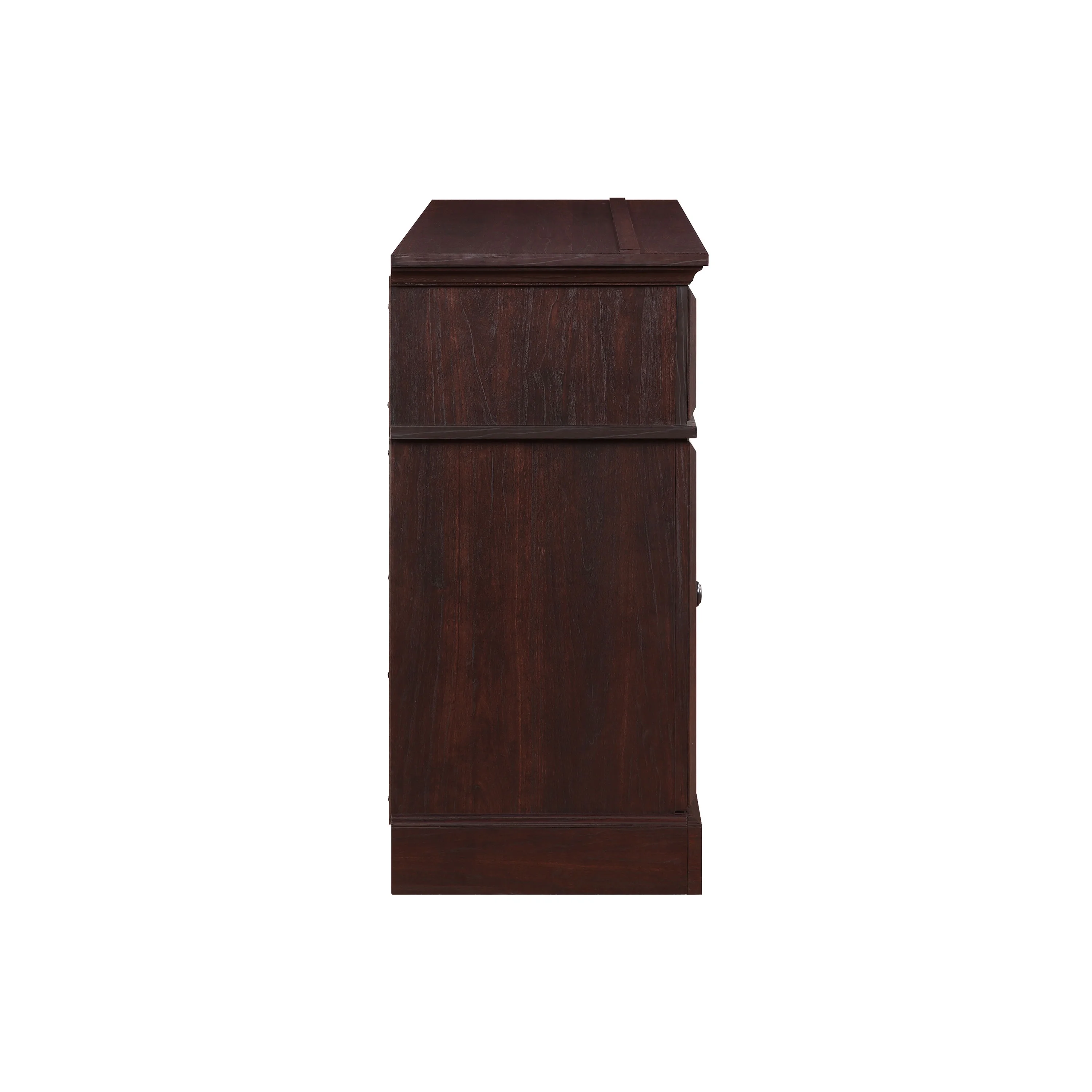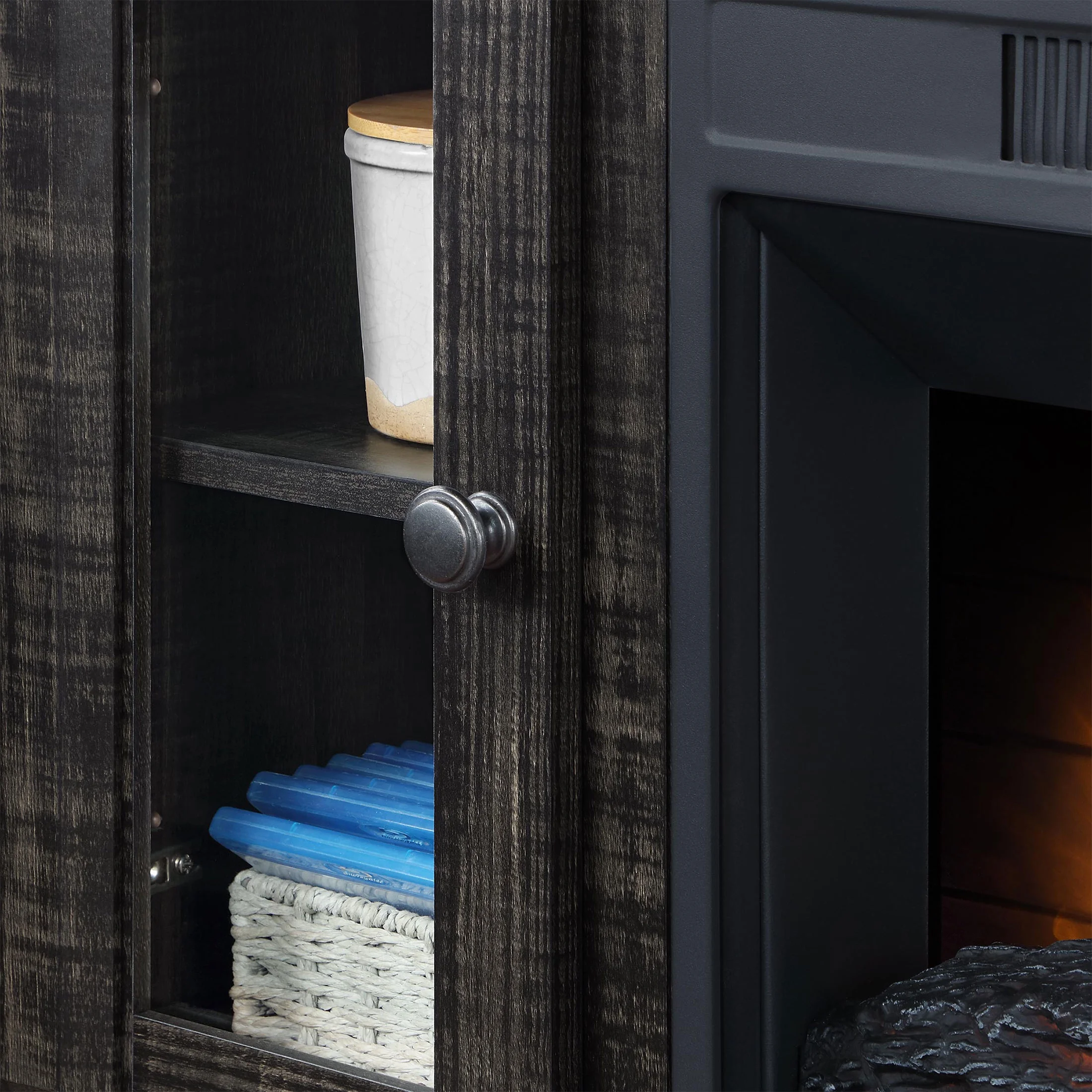 - Features two glass cabinets, wood composite shelving, and two large open compartments in Cherry finish