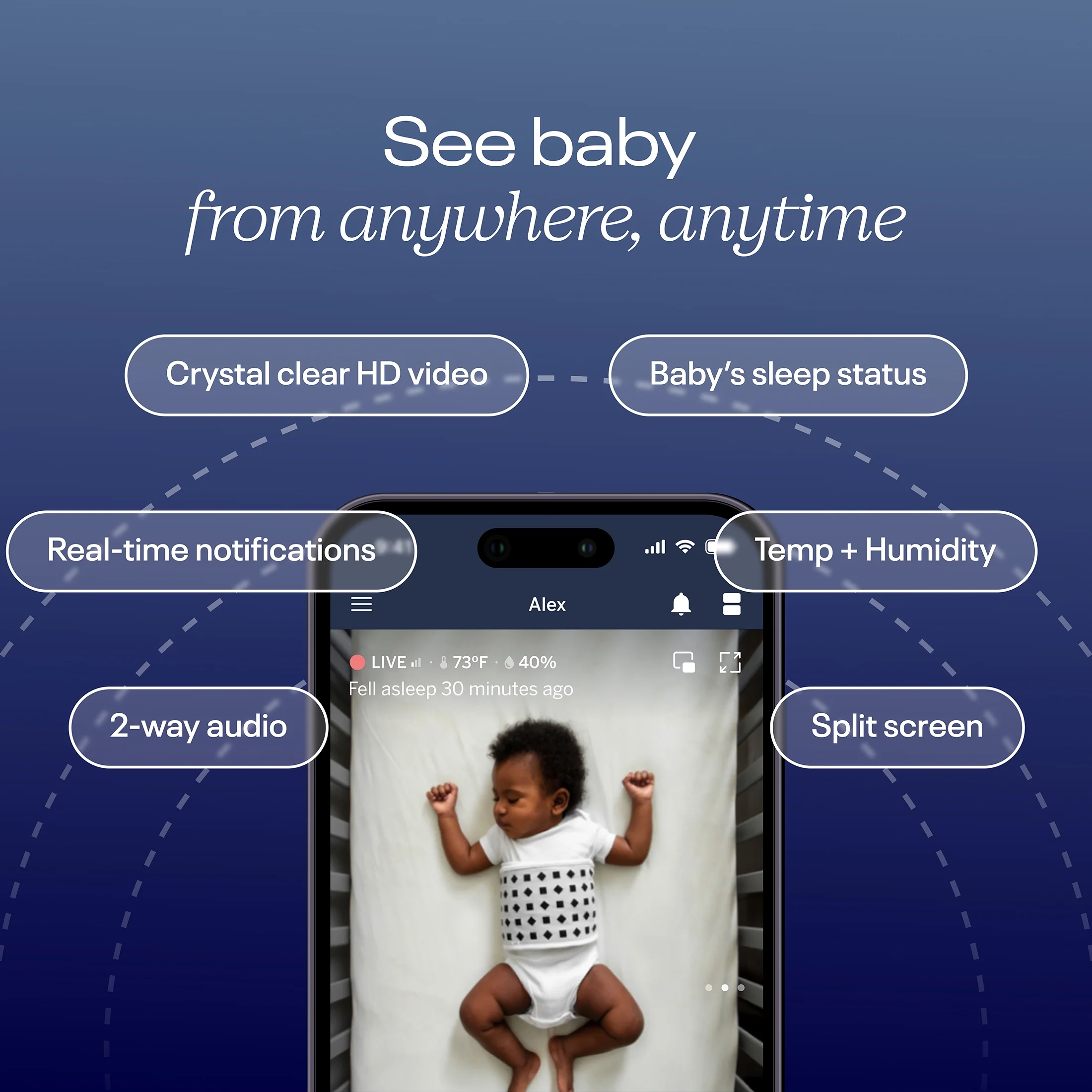 - Smart Sleep Notifications: Unlock auto-captured sleep data, custom notifications like Cry and Cough Detection, a live-status sleep dashboard and developmental milestone tracking