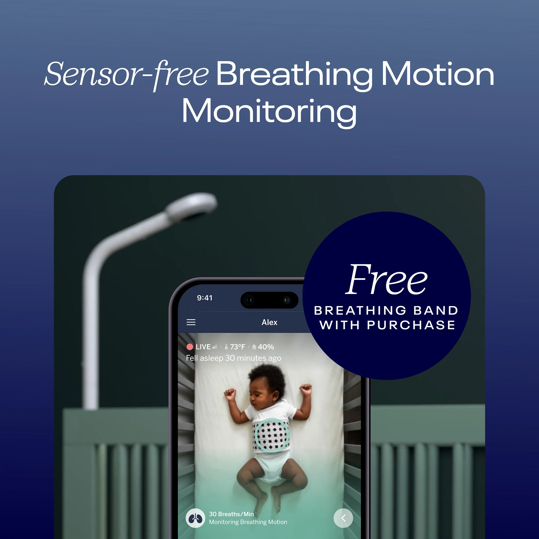 - Breathing Motion Monitoring: Monitor your baby's breathing movements without sensors. Our Breathing Band (included) works with the Pro Baby Monitor to detect breathing patterns and stream them directly to you.
