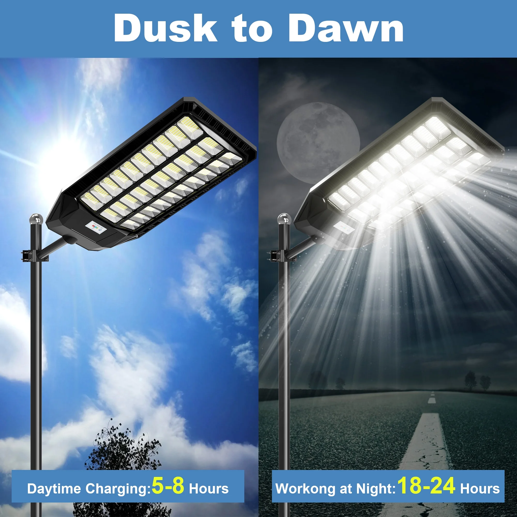 - 3 LIGHTING MODES&WIRELESS DESIGN: This solar street lights outdoor have 3 different lighting modes. 1. Motion Sensor: Our dusk to dawn solar flood light keeps 30% lighting until detected motion automatically adjusts to 100% brightness lighting. 2.Dusk to Dawn: street light automatically turn on at dusk and automatically turn off at dawn; 3. 25%-100% brightness adjustment, 2H,3H,5H,6H,8H timed lighting, can be adjusted according to needs.