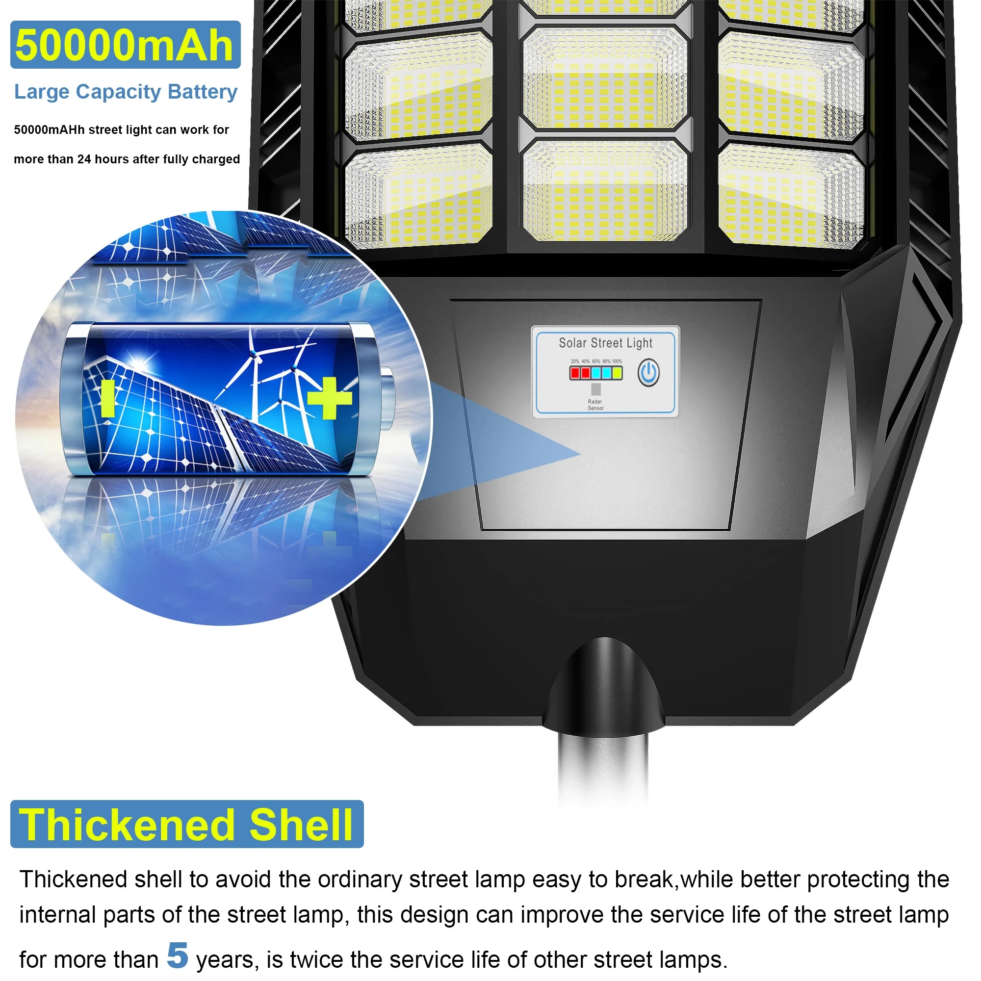 - EVERYTHING IS BIG: Bigger size, bigger battery capacity, bigger LED beads, and thicken shell. With the size of 30.3 x 13.54 x 2.60 inches and weight of 10.47 lbs, it is able to carry way more light units than all other solar street lights in the market. 6V-48000mAh large-capacity battery can work continuously for 12 -14 hours (after full charge) and runs for approximately 36 hours in low-light mode with a service life of up to 80,000. The die-cast aluminum frame ensures durability and requires no maintenance for long-term use, while each component undergoes aging and repeated testing for high quality.