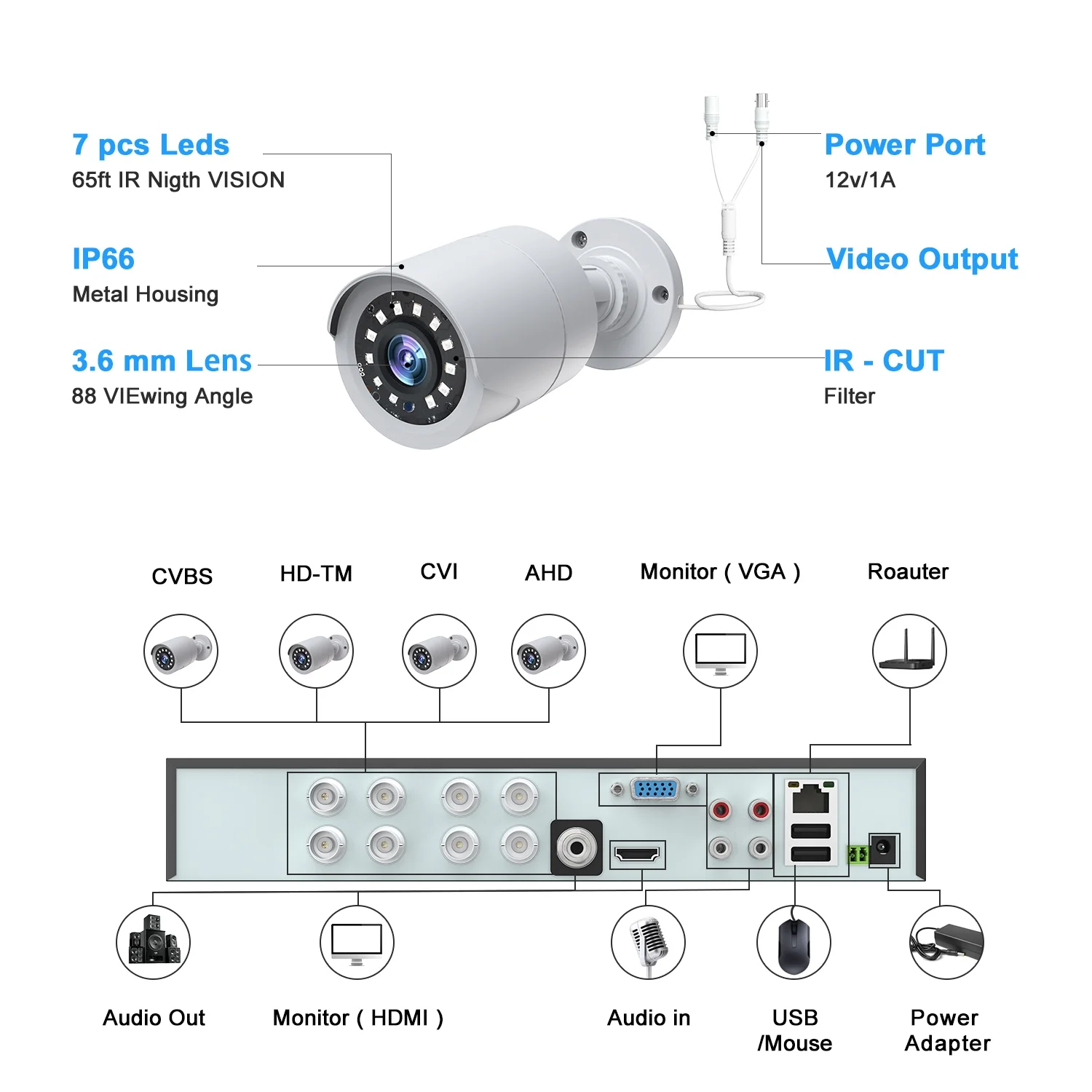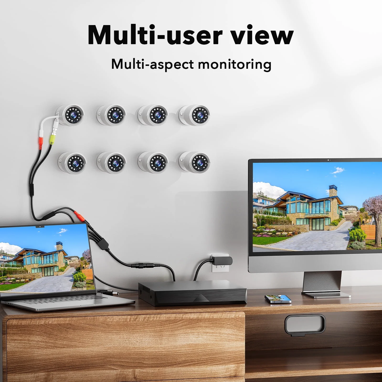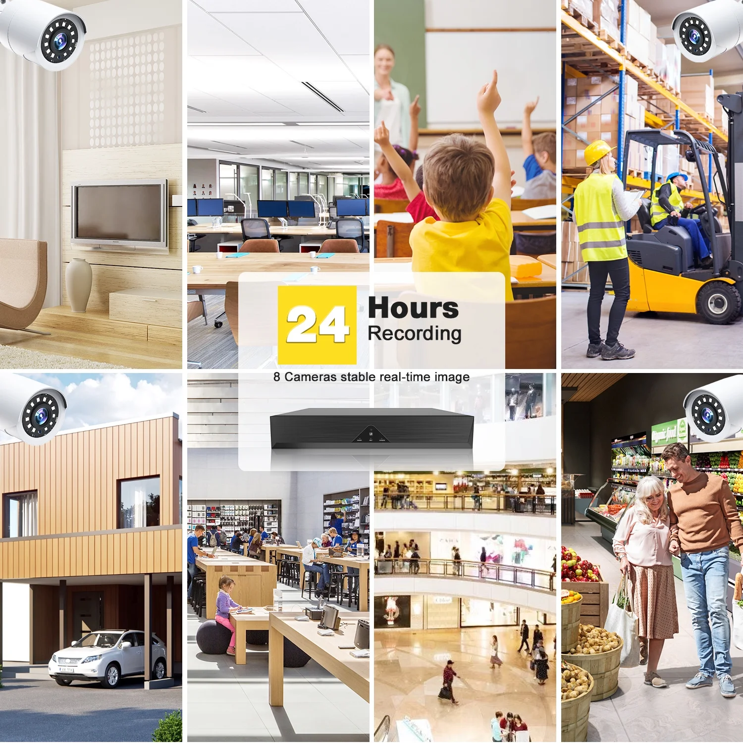 With 8pcs1080P HD bullet night vision cameras, it ensures clear and detailed footage day and night for enhanced security monitoring both indoors and outdoors.