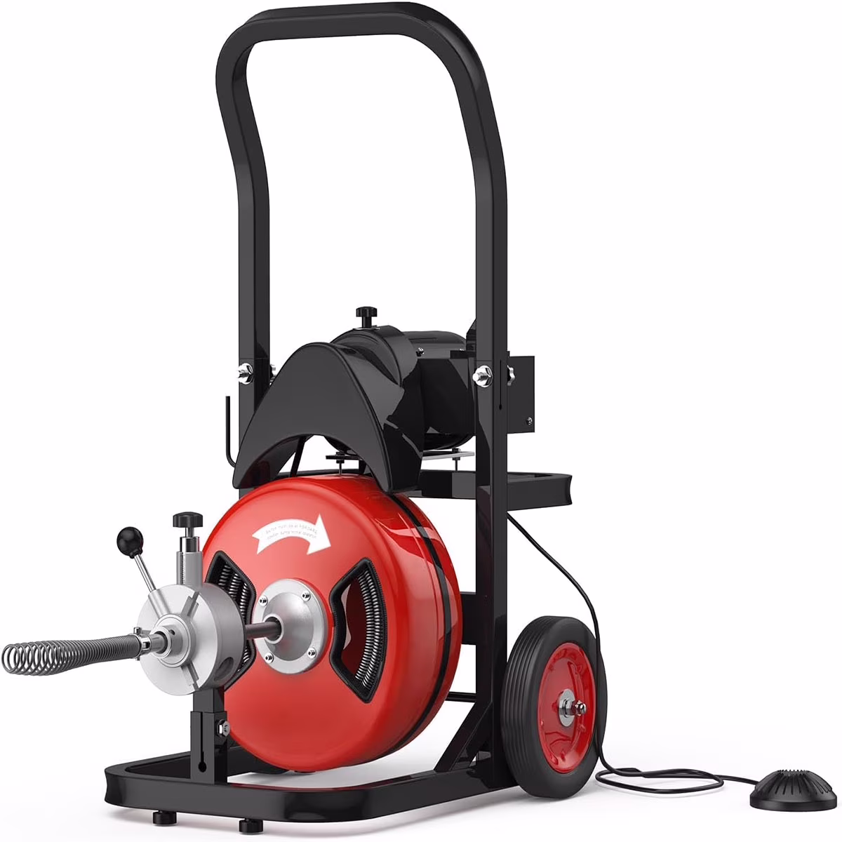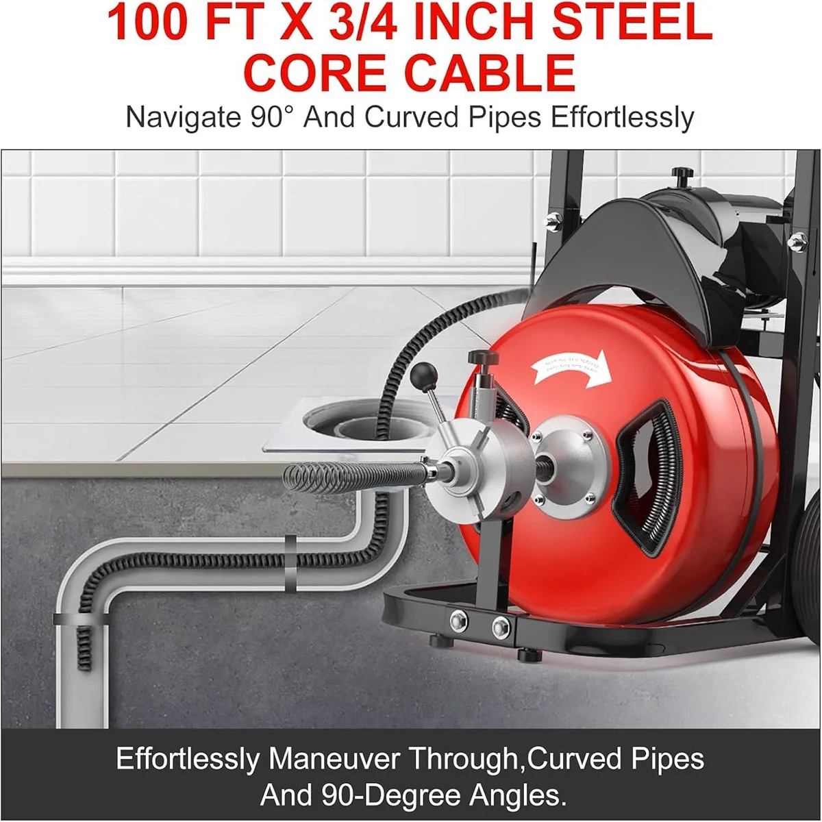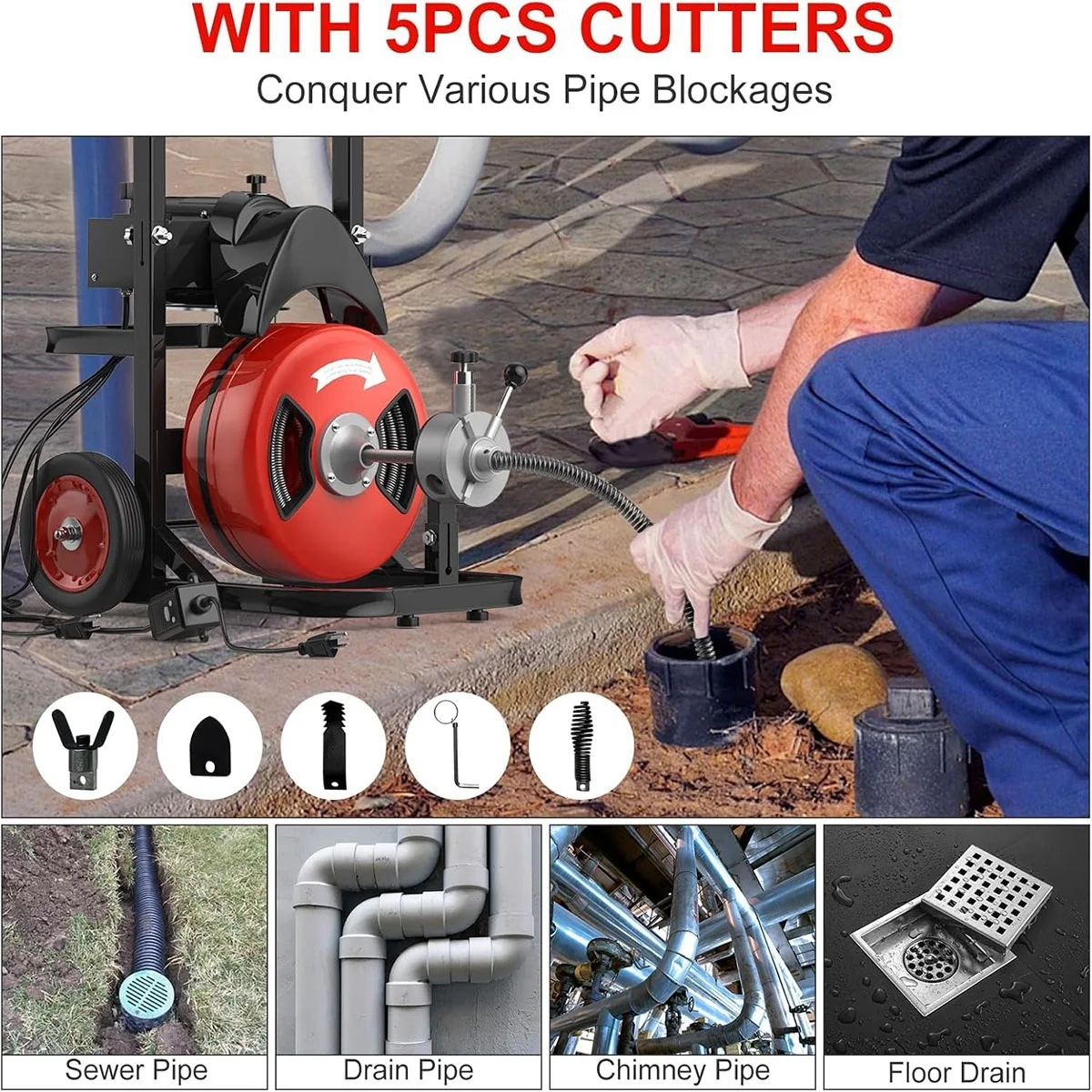 - ��Easy to Operate�� This sewer snake auger features an automatic feed control system to power the steel cables going in and out of the drain. By using the air-activated foot switch, you can easily control the steel cables to help you finish cleaning pipes efficiently.
