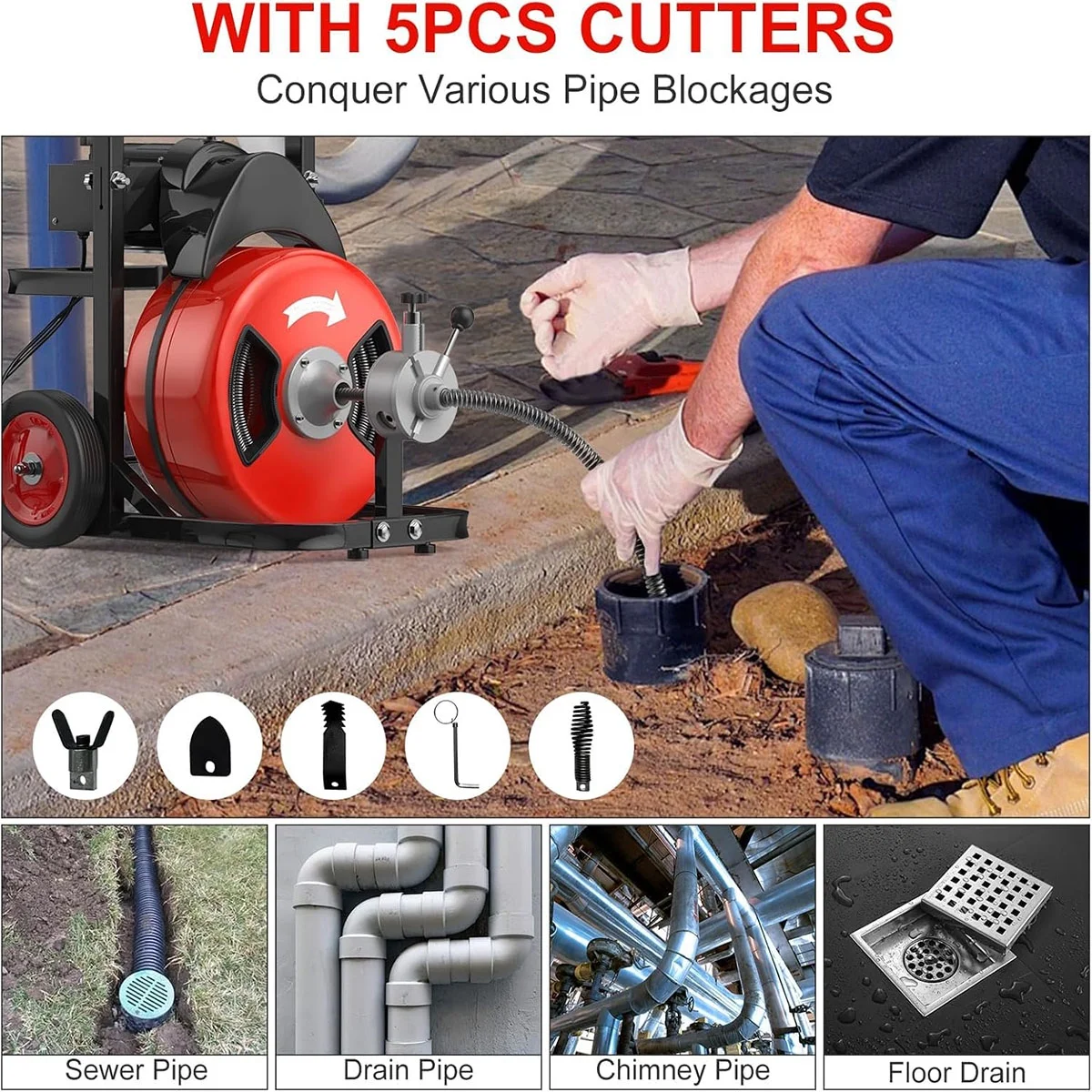 Kselythan 75 FTx1/2 Inch Drain Cleaning Machine, Auto Feed Sewer Snake Drill with Wheels, Pipe Spiral Cleaner with 4 Cutters and Pneumatic Foot Switch, for 2" to 4" Pipes