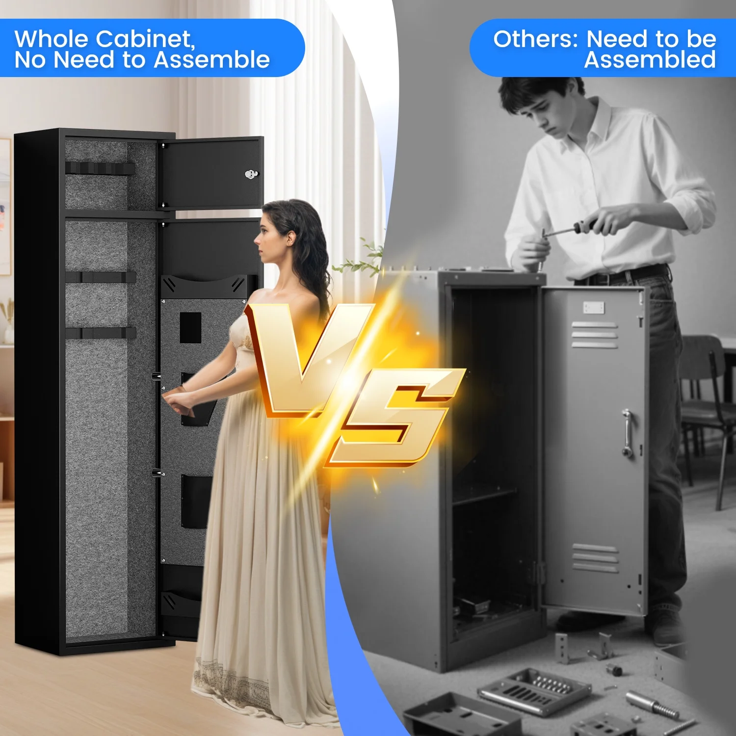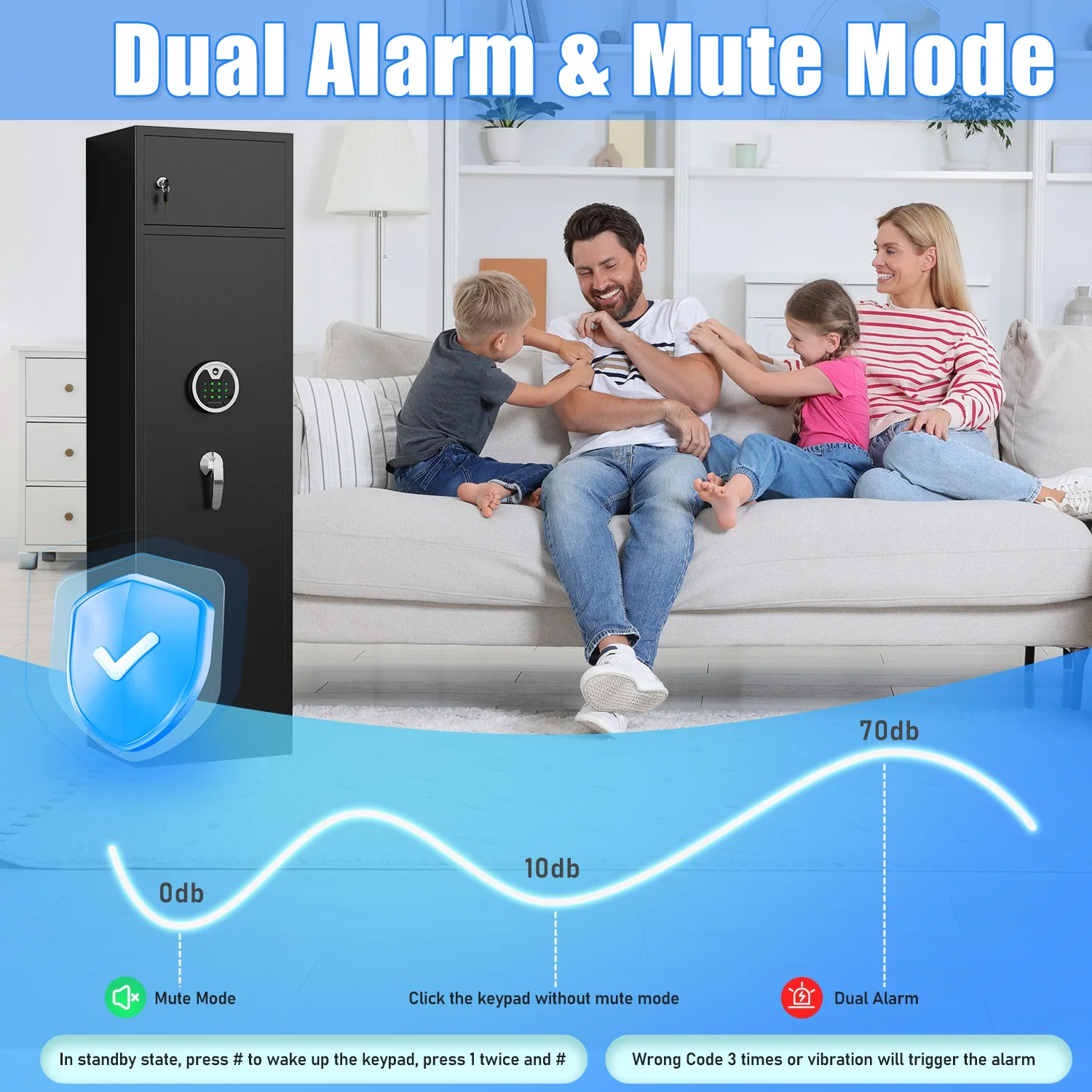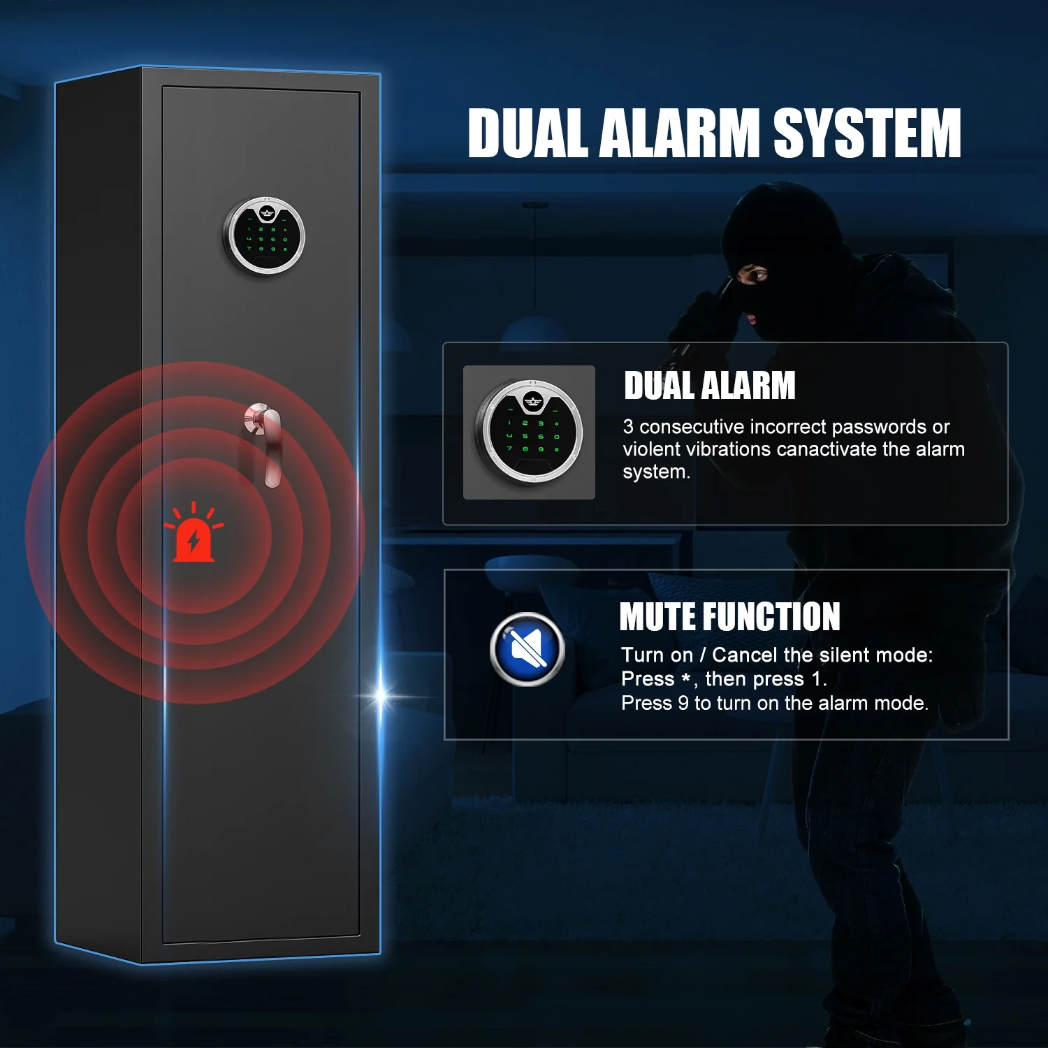 ��Quick Access Gun Cabinet��The numeric keypad allows you to program it with your own code for quick firearm access during emergencies. It can store 2 sets of digital codes, and the code memory function ensures that your code will not be lost when the batteries drain.��Dual Alarm System & Mute Function��If you enter the wrong code 3 times in a row, your safe will activate the alarm system. Besides, if the gun cabinet is moved violently, a vibration alarm will be triggered. You can enter your code to open the door to cancel the alarm. If you don't want the gun safe to make a sound, you can turn on the Mute Function.