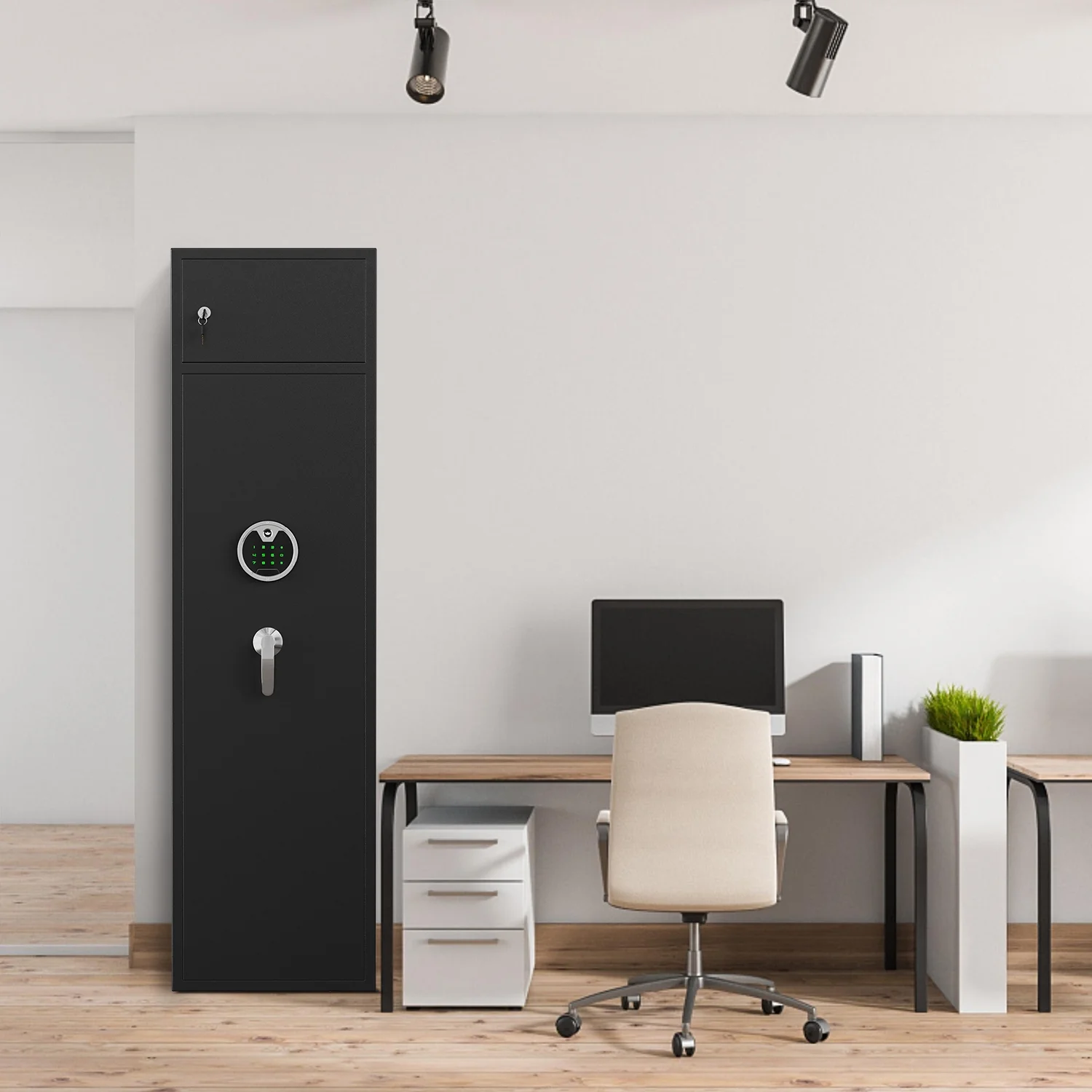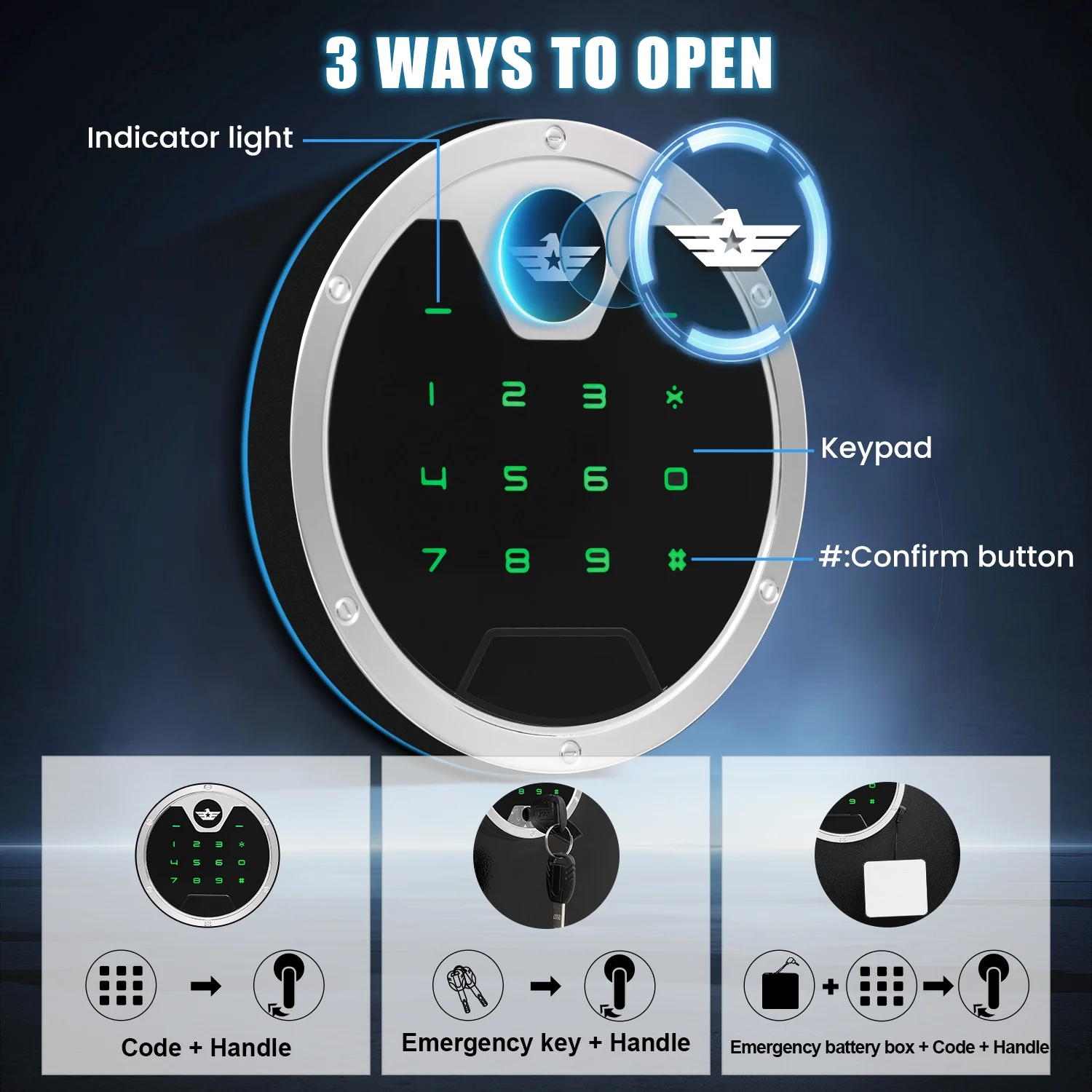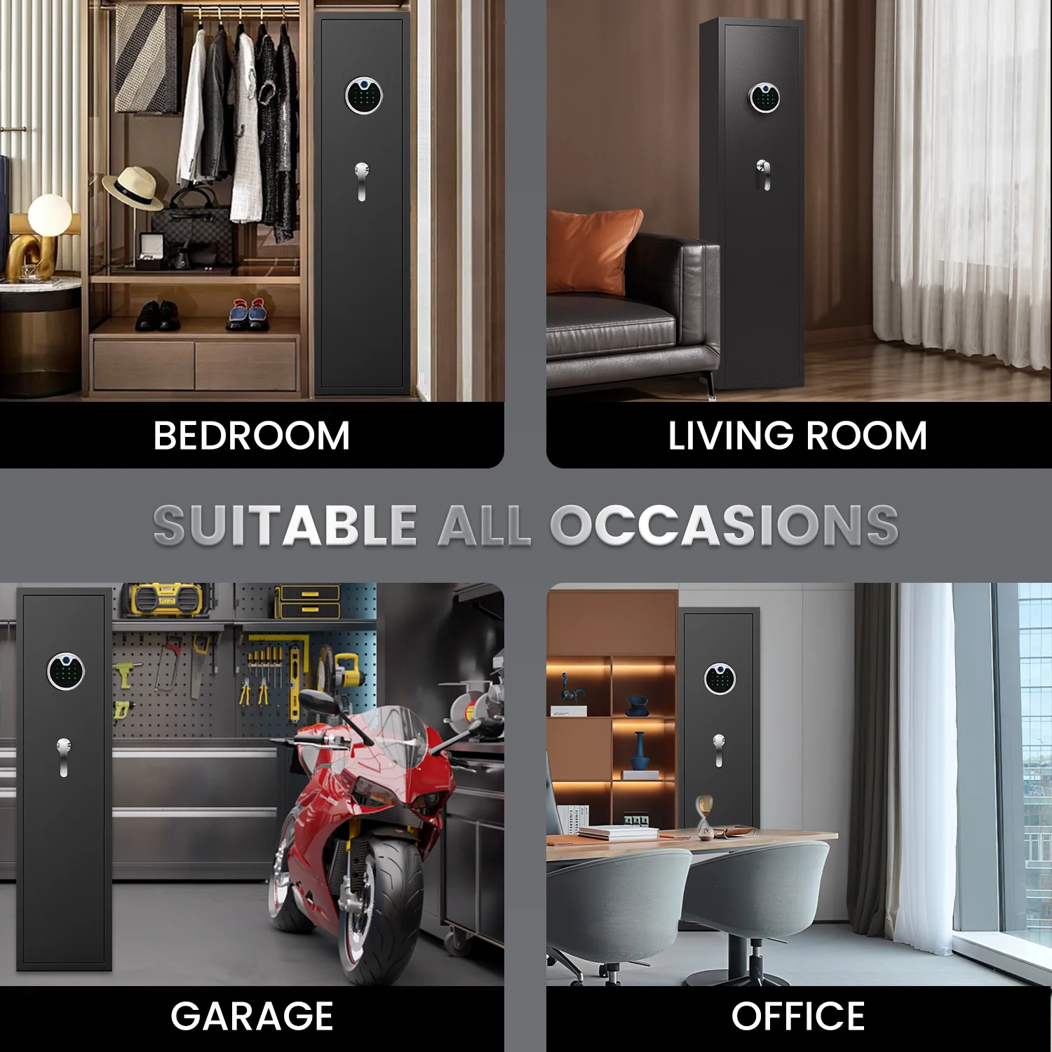 ��Quick Access Gun Cabinet��The numeric keypad allows you to program it with your own code for quick firearm access during emergencies. It can store 2 sets of digital codes, and the code memory function ensures that your code will not be lost when the batteries drain.��Dual Alarm System & Mute Function��If you enter the wrong code 3 times in a row, your safe will activate the alarm system. Besides, if the gun cabinet is moved violently, a vibration alarm will be triggered. You can enter your code to open the door to cancel the alarm. If you don't want the gun safe to make a sound, you can turn on the Mute Function.